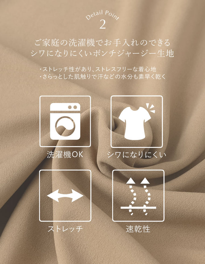 ご家庭で洗濯できる、シワになりにくいポンチジャージー生地ジョーゼットポンチシリーズについて・一見ジョーゼット生地のようなルックスと、さらっとした肌触りの素材・ストレッチ性があり、着心地の良さが魅力・シワになりにくく、お手入れが簡単