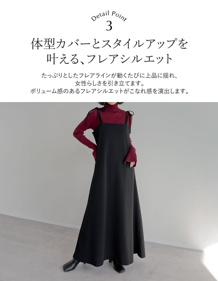 リエディでロングヒットを誇る「ポンチIラインキャミワンピース(商品番号:120799)」のフレアシルエットバージョン。華奢見えするキャミソールデザインと、たっぷりとしたフレアラインが動くたびに上品に揺れ、女性らしさを引き立てます。ボリューム感のあるフレアシルエットがこなれ感を演出し、カジュアルにもきれいめにも対応。ゆったりとしたサイジングで、マタニティの方にもおしゃれを楽しんでいただける1枚です。さらに、自宅で洗濯でき、速乾性にも優れたイージーケア素材を使用。インナー次第でロングシーズン着られる、シーズンレスなジャンパ―スカートです。
