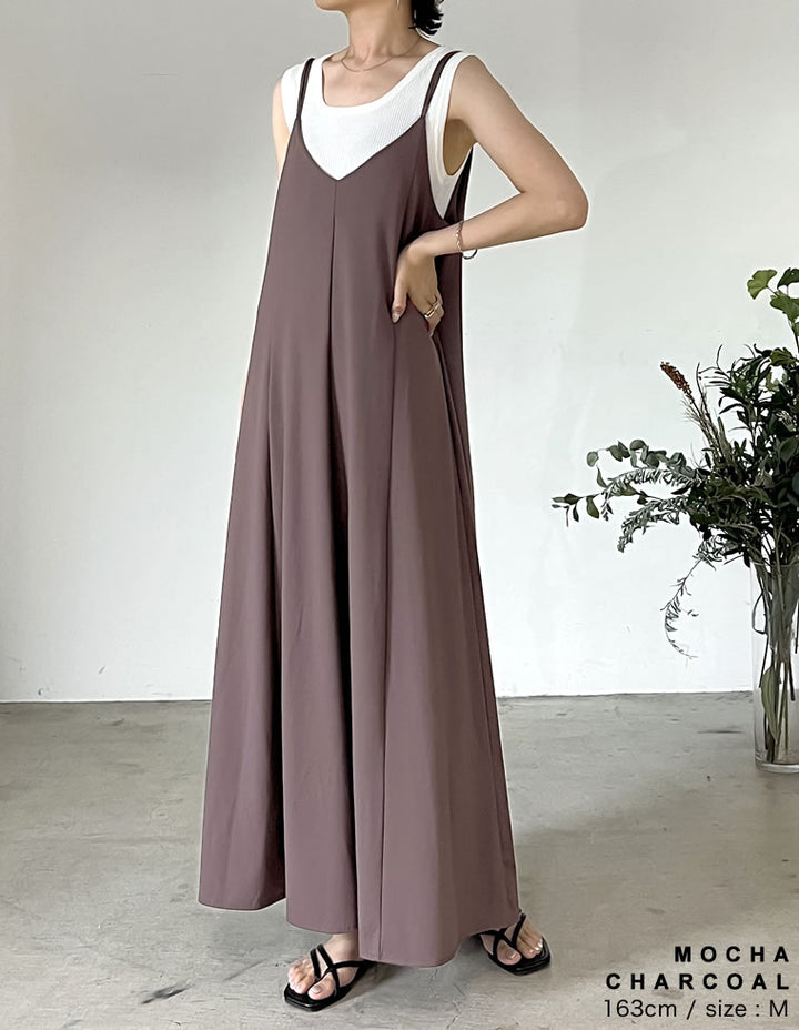 落ち感のある接触冷感生地を採用したロングキャミワンピース。