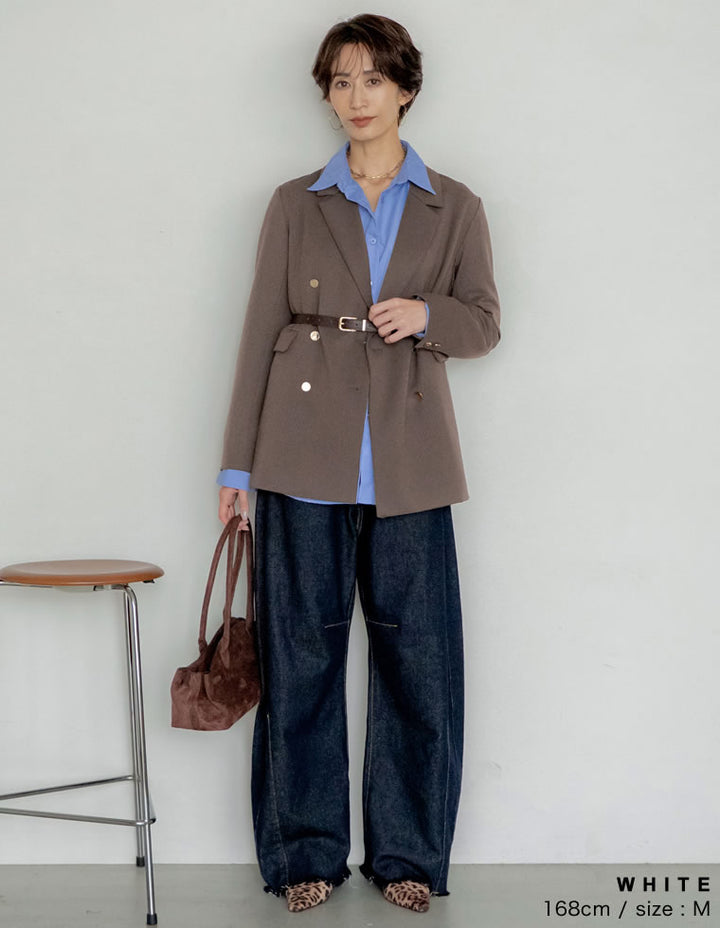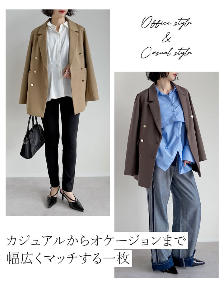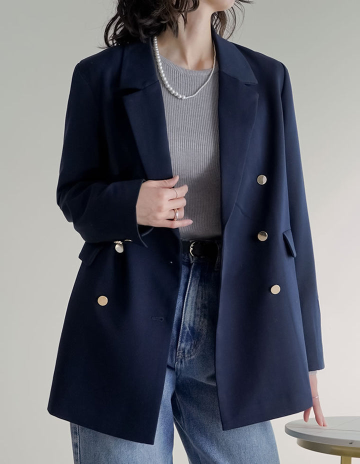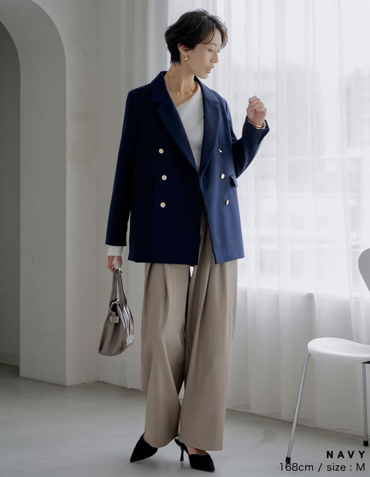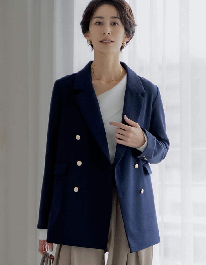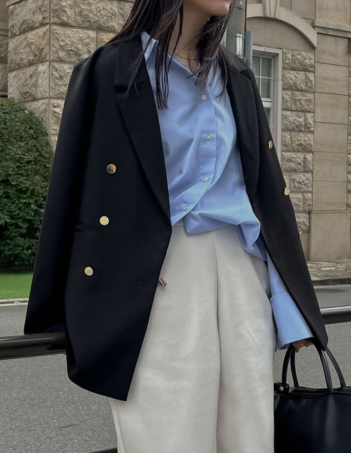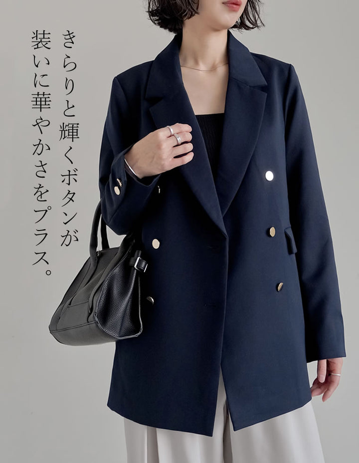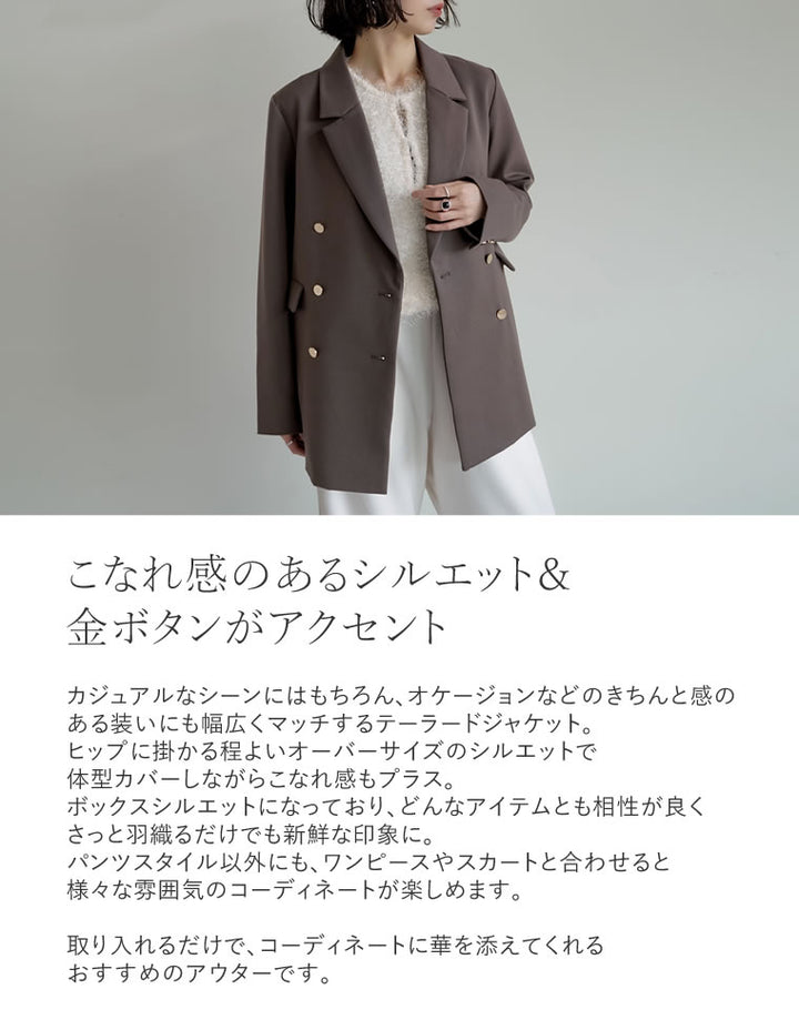 オンオフ問わず取り入れられる、金ボタンテーラードジャケット。