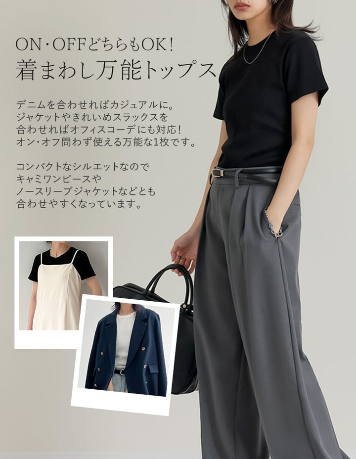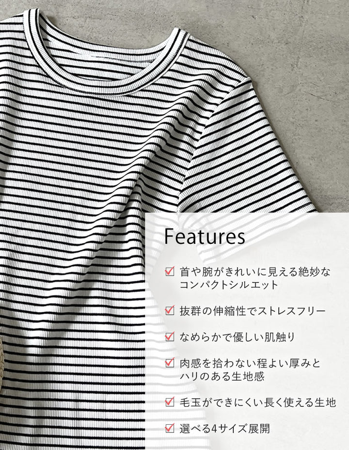 ▼デザイン程よいコンパクトシルエットできれい見え◎大人のきちんと見えを叶えるテレコリブの半袖カットソー。伸縮性に優れた生地で、リラクシーな着心地を叶えます。絶妙なコンパクトシルエットにもこだわっており、1枚でさらりと着用いただくだけでなく、インナー使いにも◎お好みのサイズ感を選べる4サイズ展開も嬉しいポイントです。シンプルなデザインだからこそ、系統問わずきれいめにもカジュアルにもマッチ。デイリー使いに活躍する、ベーシックなTシャツです。