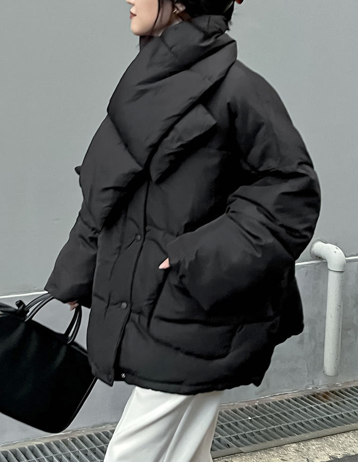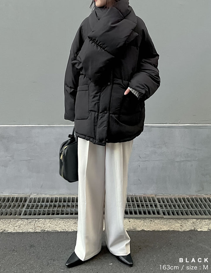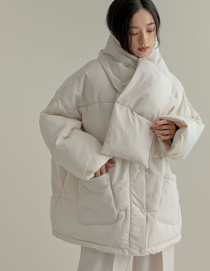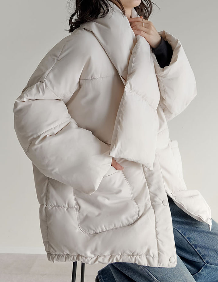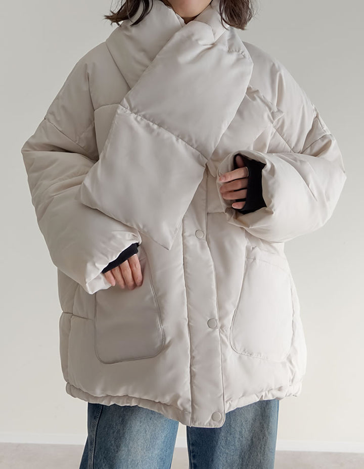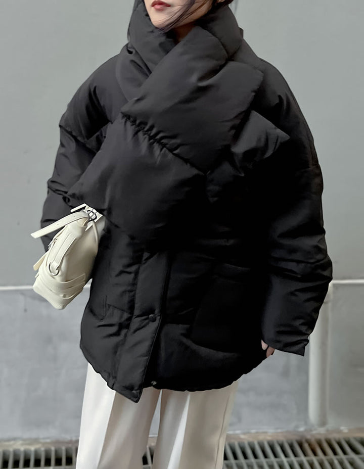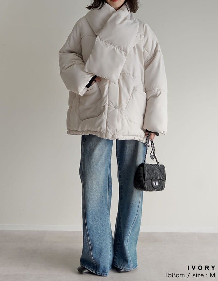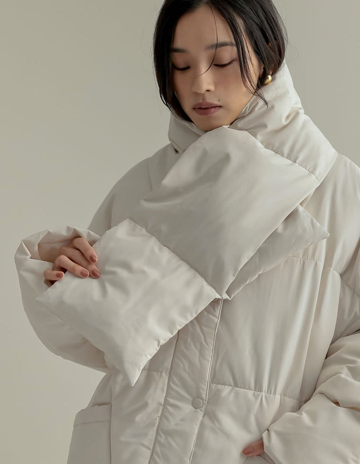 同素材のマフラー付きであったか&トレンドライクに決まるマイクロタフタ素材のフェイクダウンジャケット。