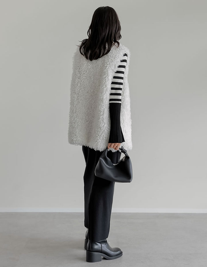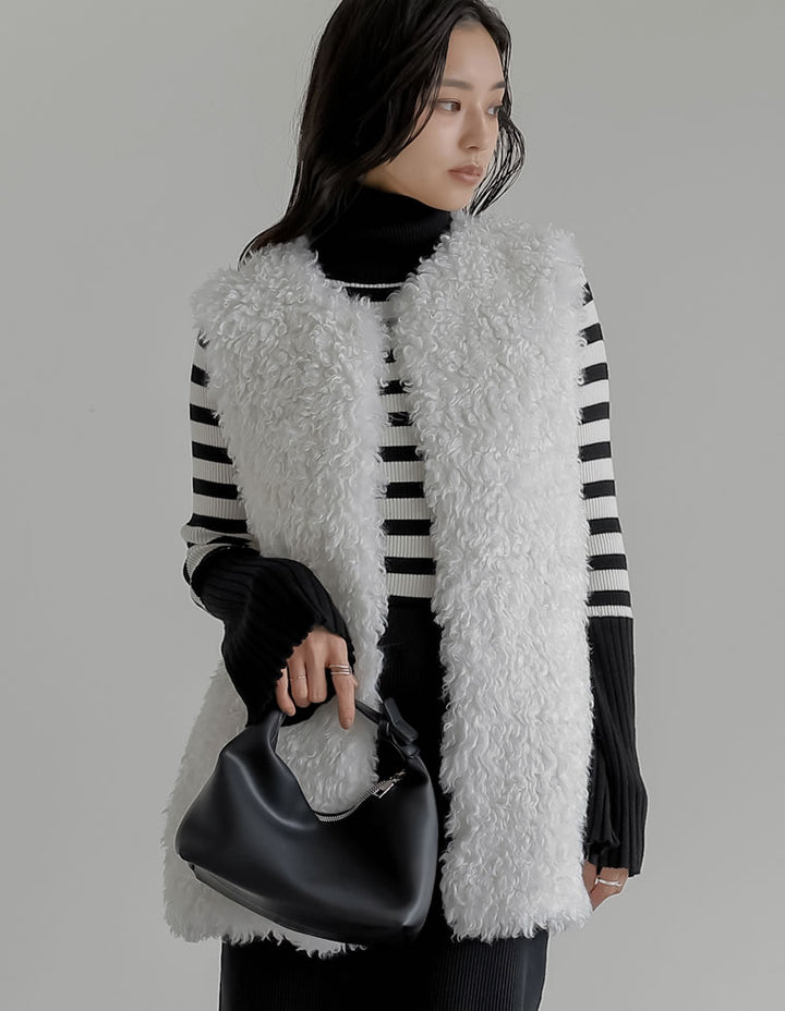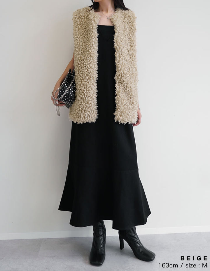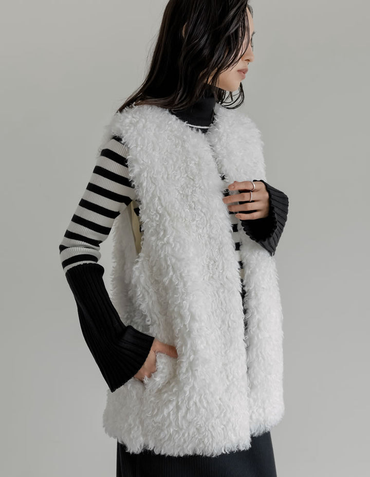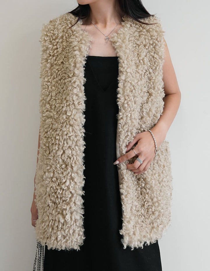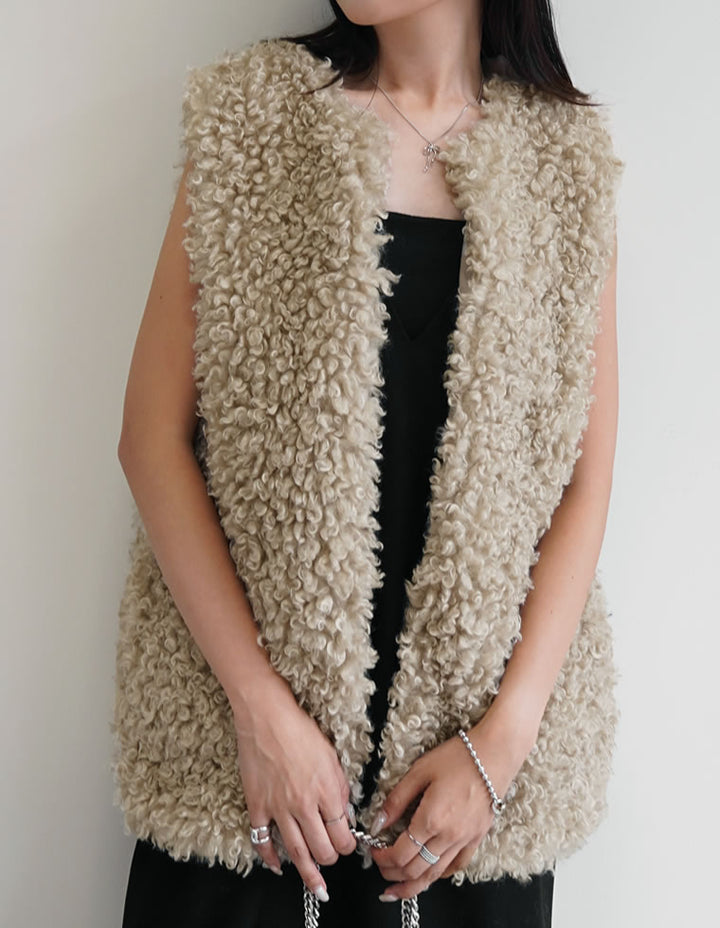 プードルのような、くるくるとした毛足が特徴のフェイクファーを使用したファーベスト。