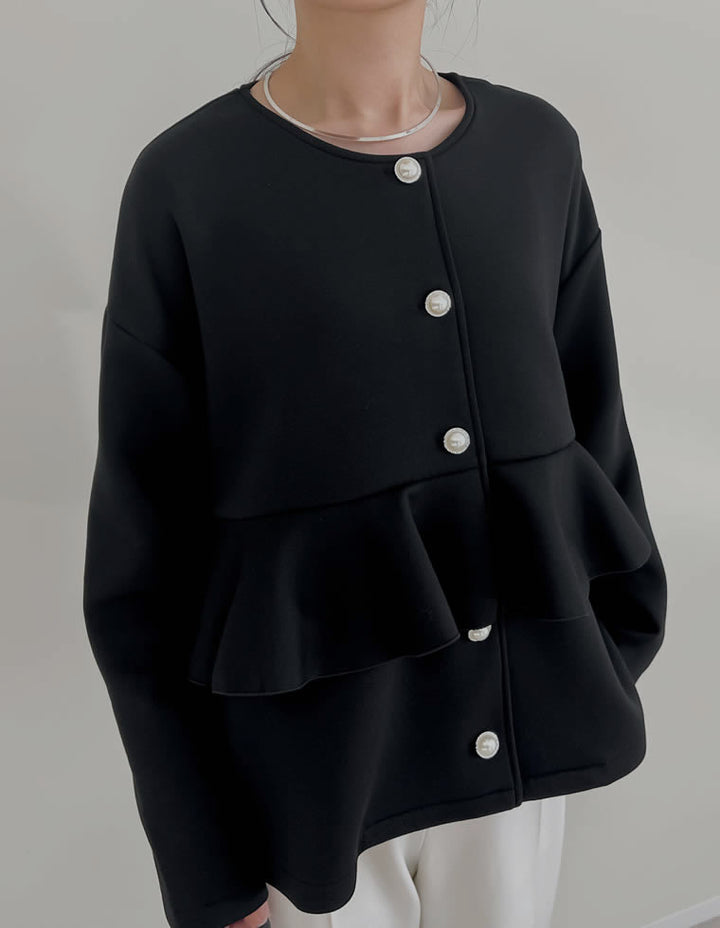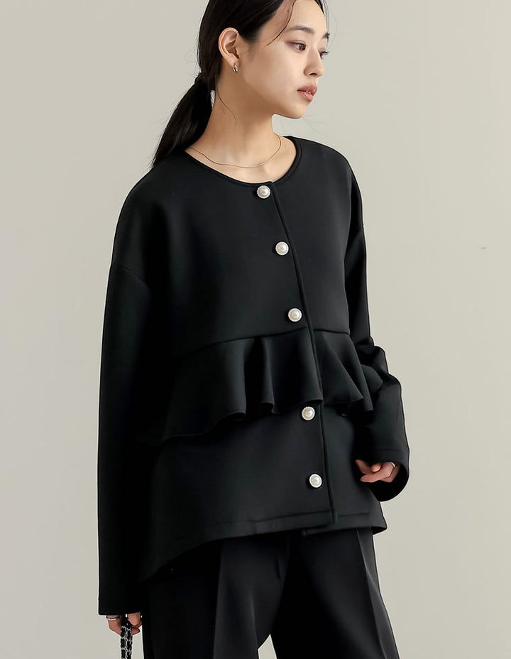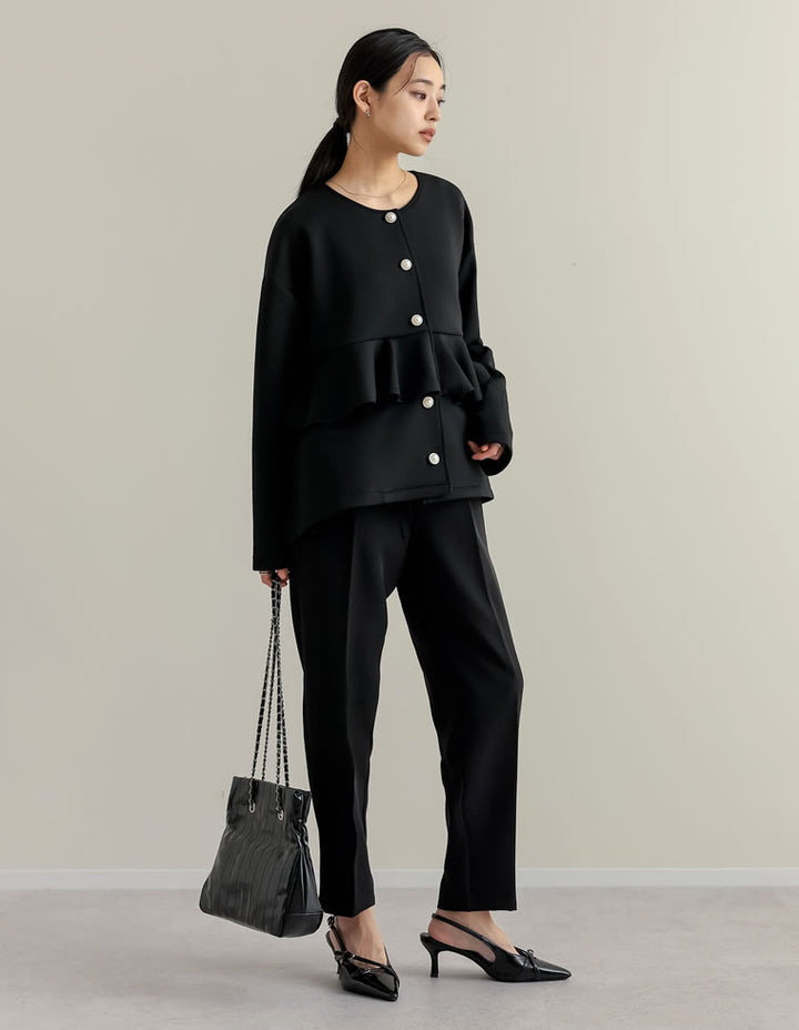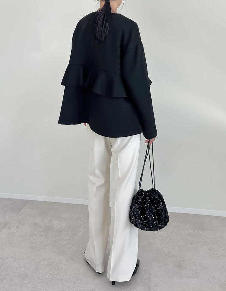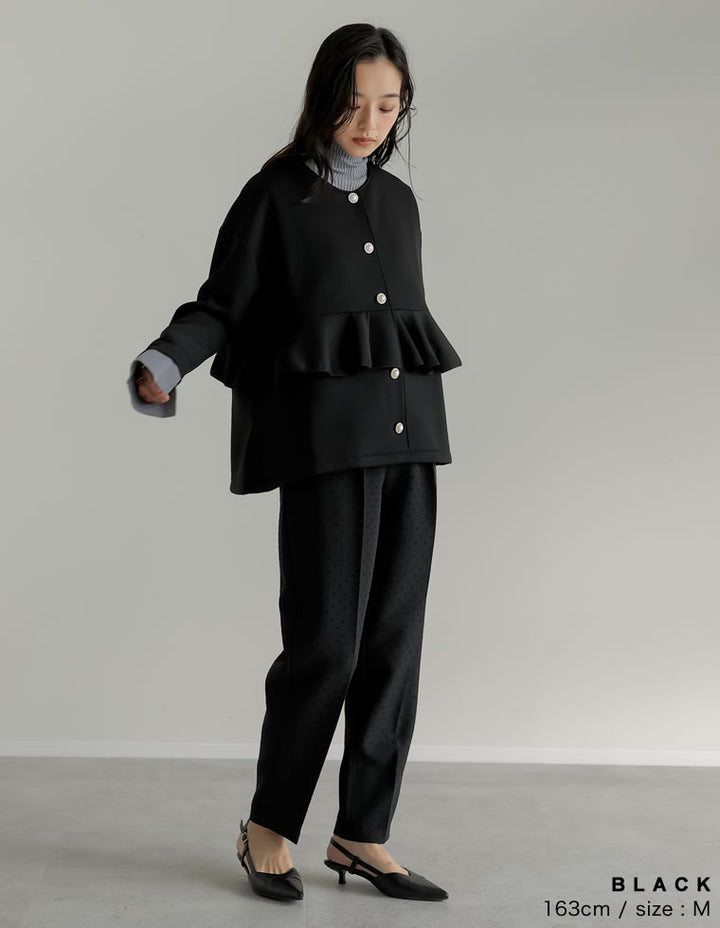 ウエスト部分のフリルデザインがフェミニンなアクセントに。