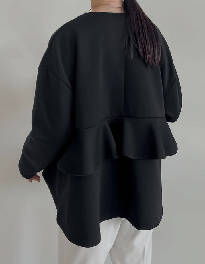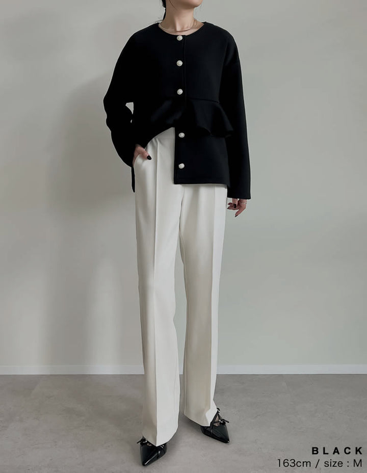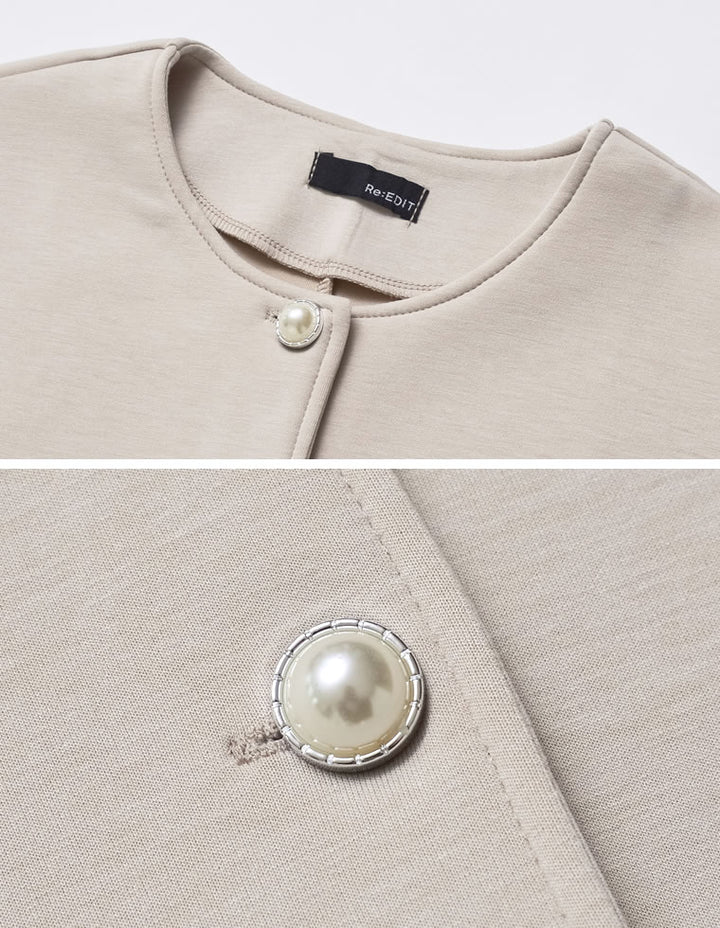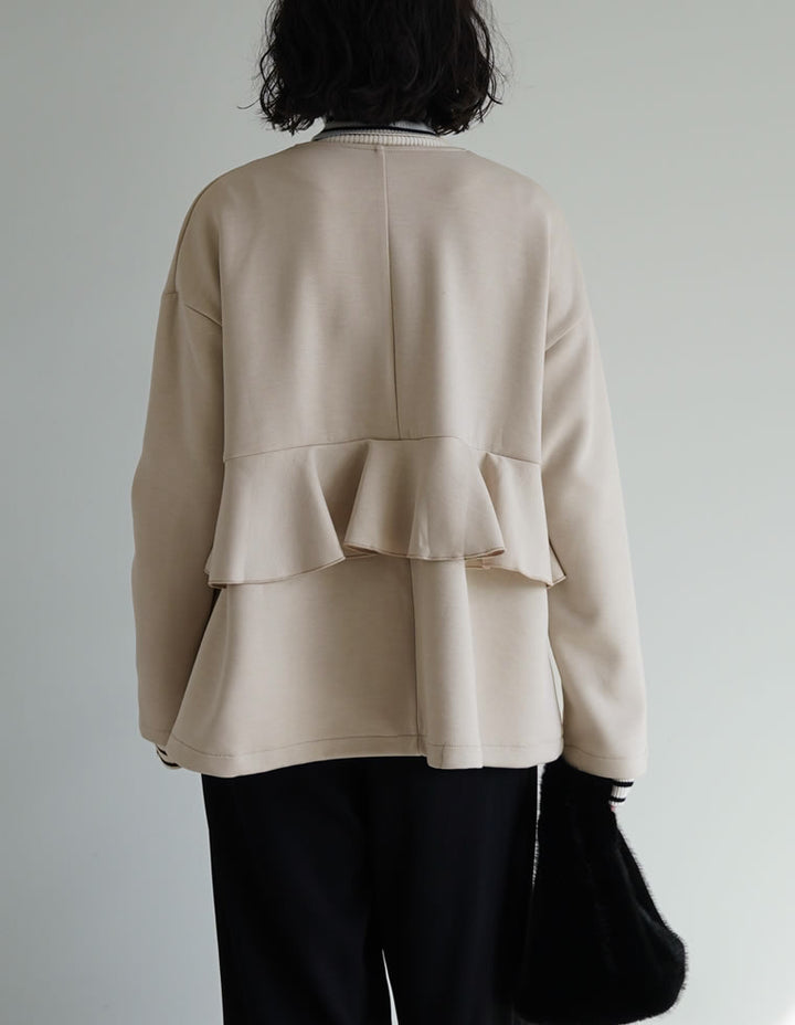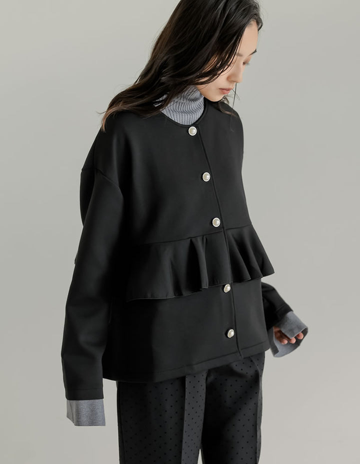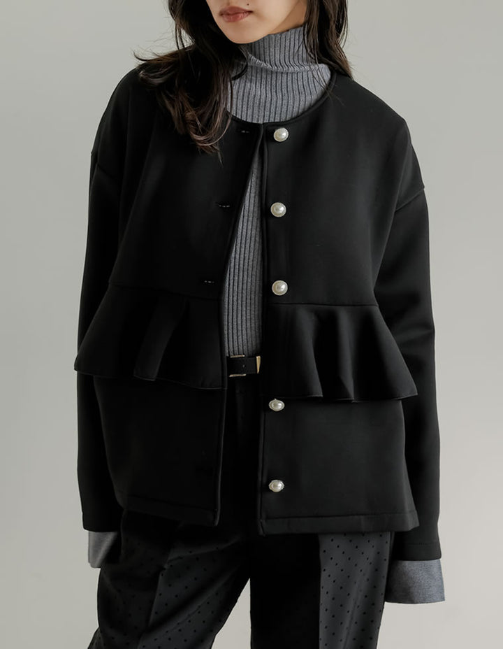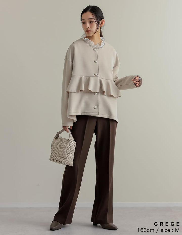 首元はすっきりとしたノーカラーなので、タートルネックトップスやハイネックトップスと合わせても◎