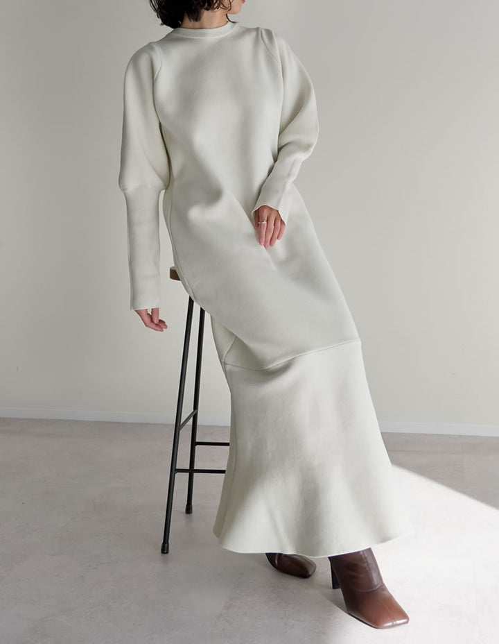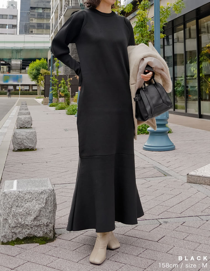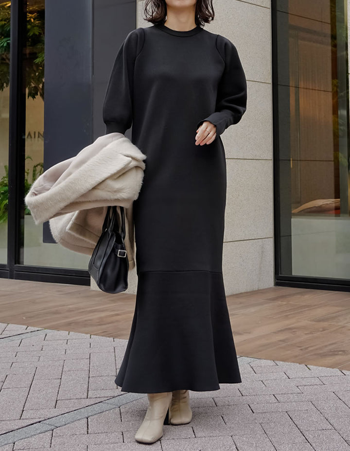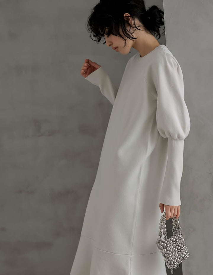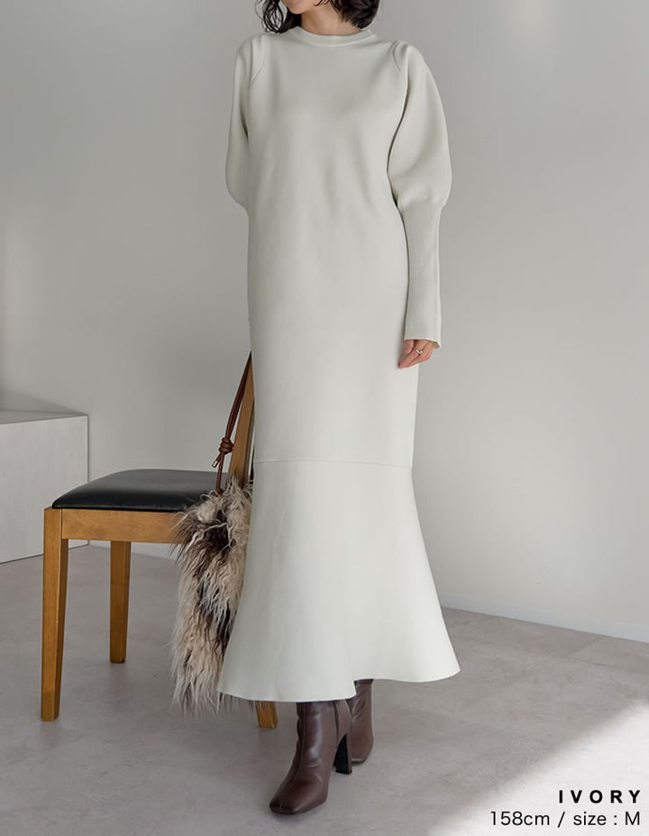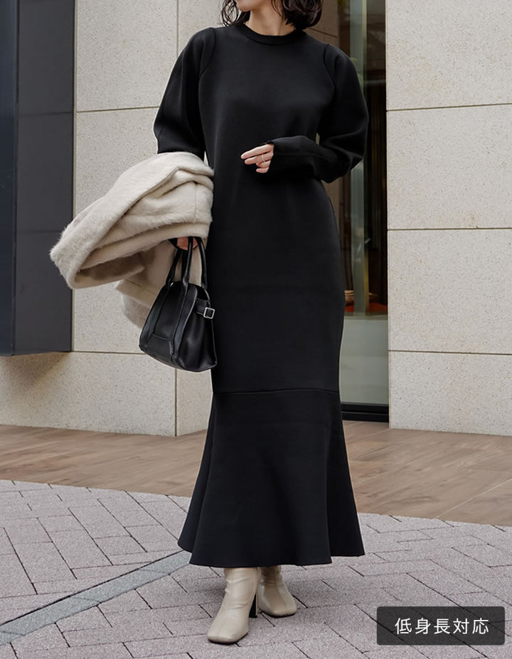 [低身長サイズ有]ミラノリブパフスリーブスポンジニットマーメイドワンピース