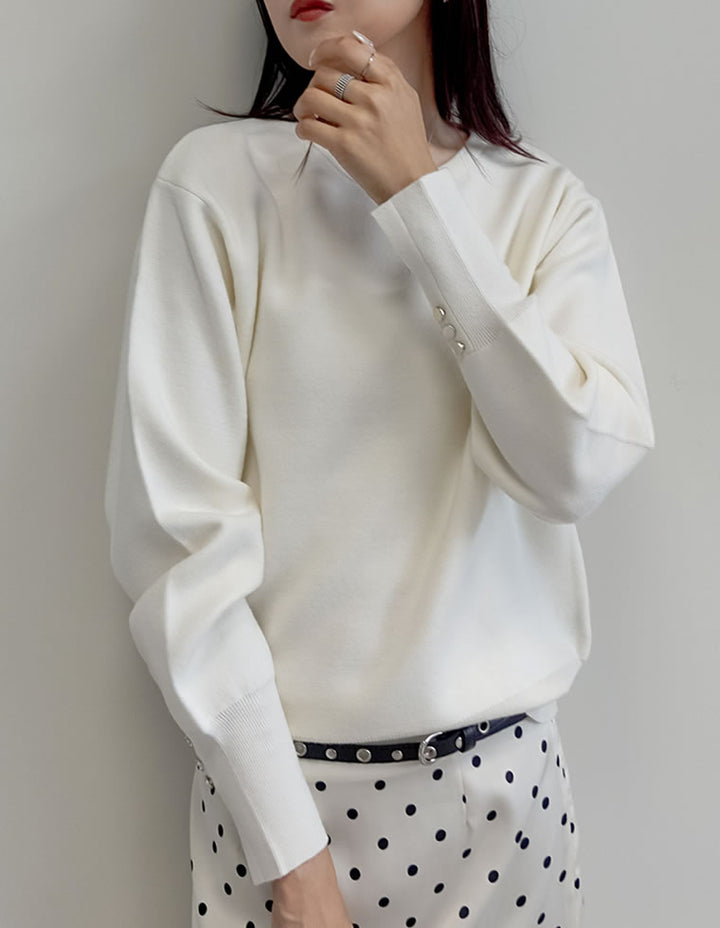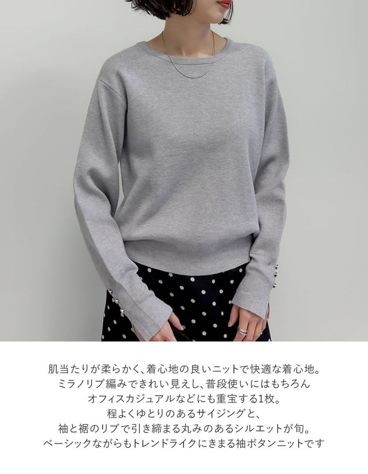 肌当たりが柔らかく、きれい見えするミラノリブ編みを採用しました。凹凸感の少ないミラノリブ編みは、普段使いはもちろん、オフィスカジュアルにも重宝する万能な一枚。程よくゆとりのあるサイジングと、袖・裾のリブで引き締まる丸みのあるシルエットが今季らしいポイントです。ベーシックながらもトレンドライクに仕上がる、袖ボタン付きニットです。