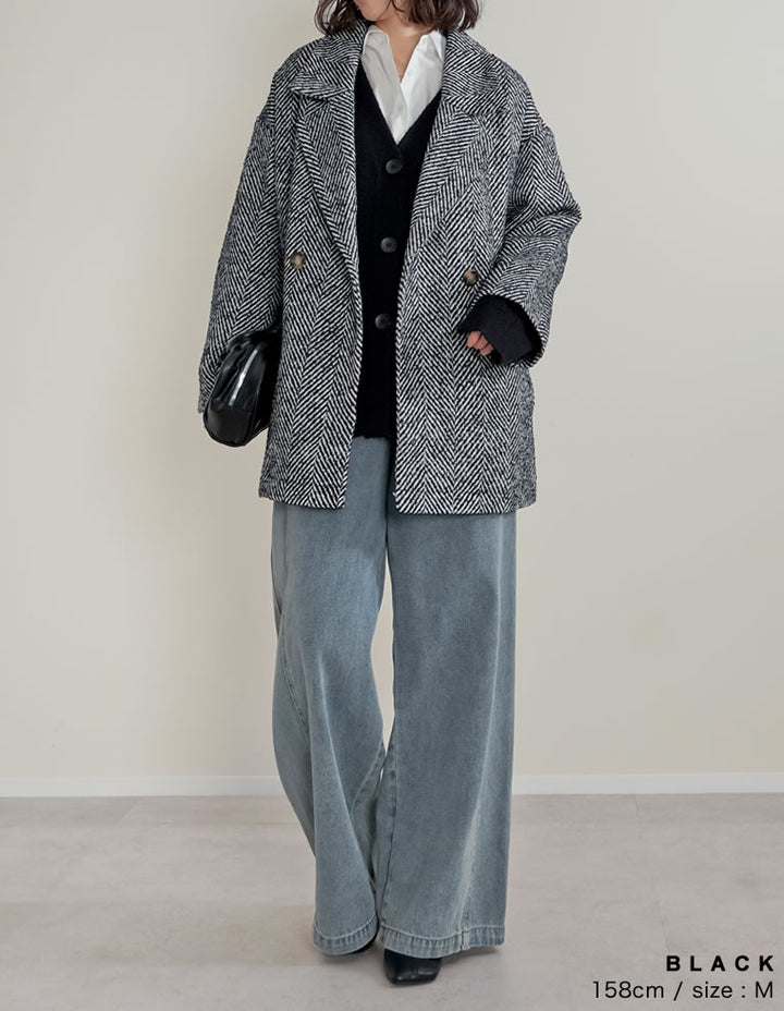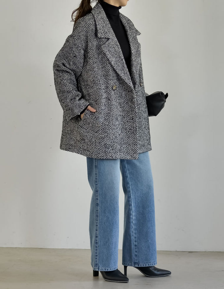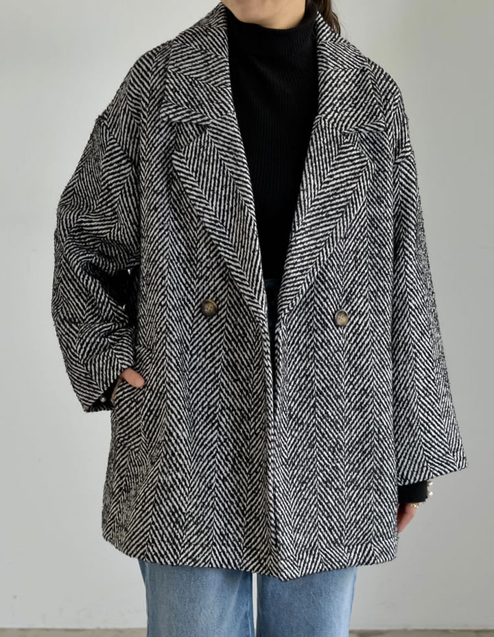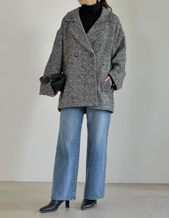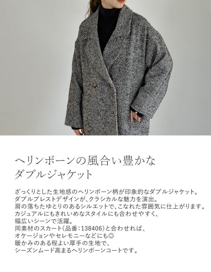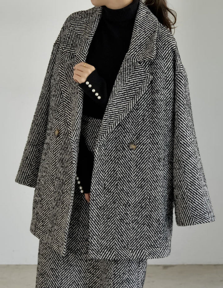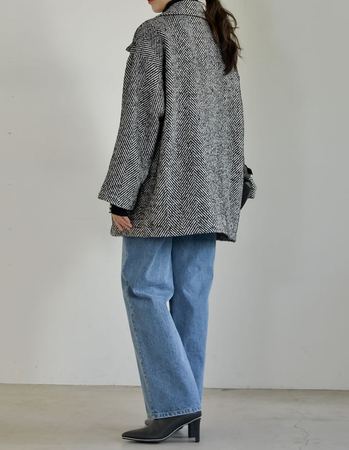 ざっくりとした生地感のヘリンボーン柄が印象的なダブルジャケット。