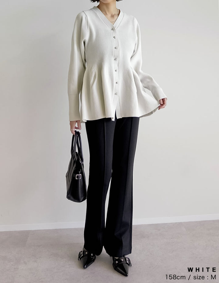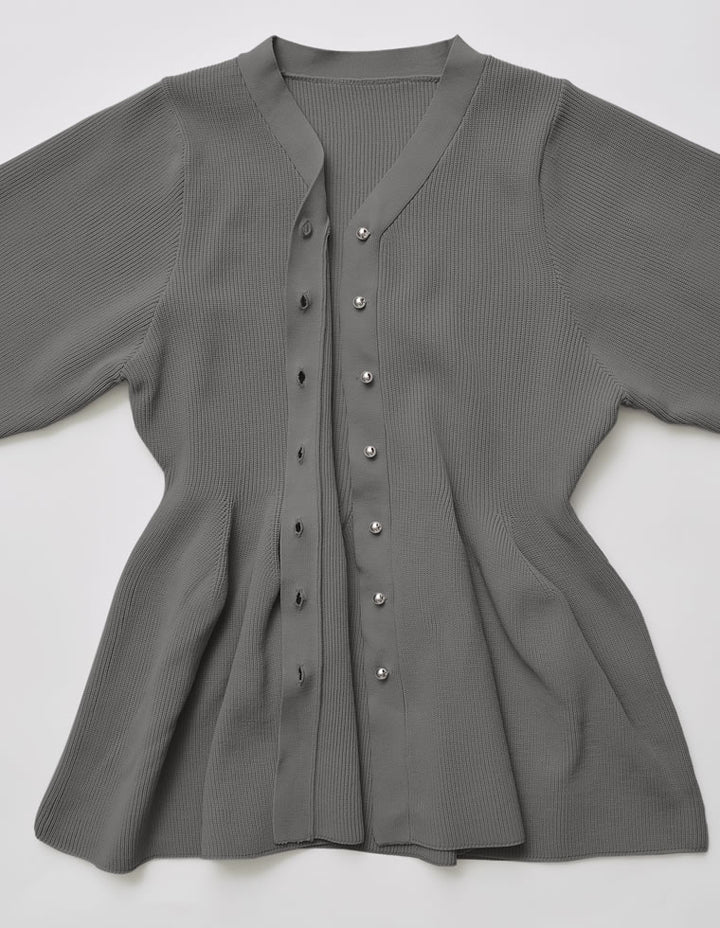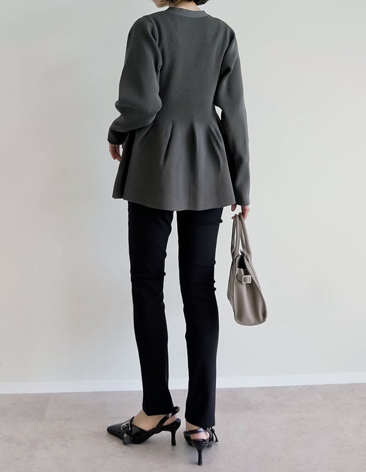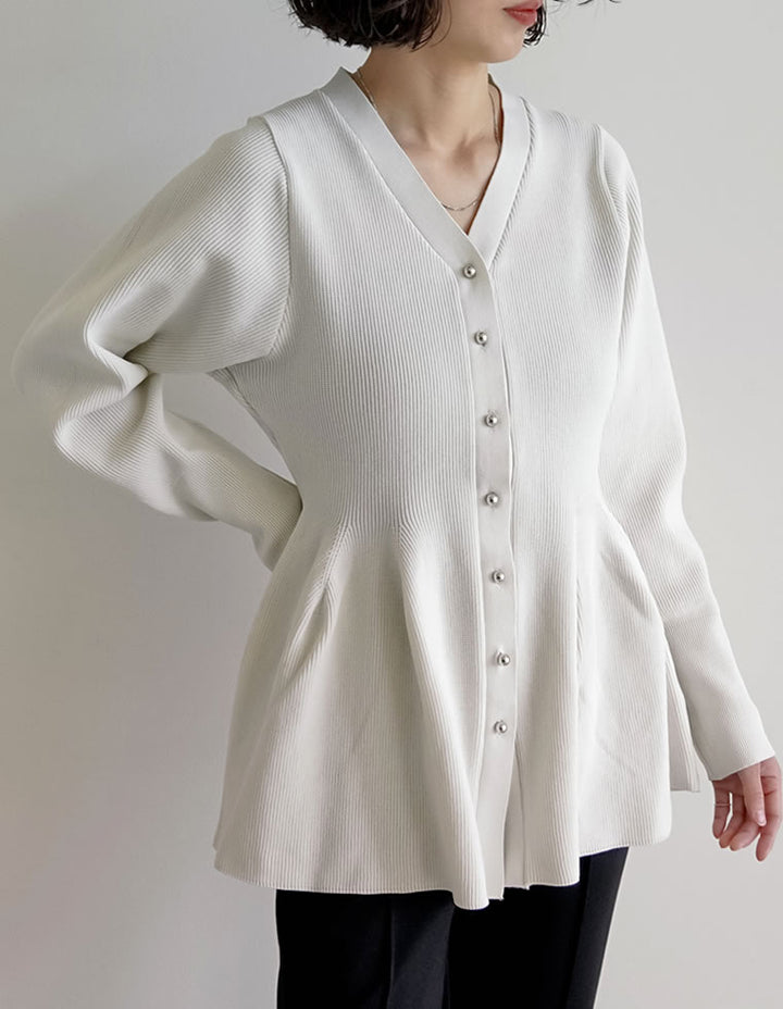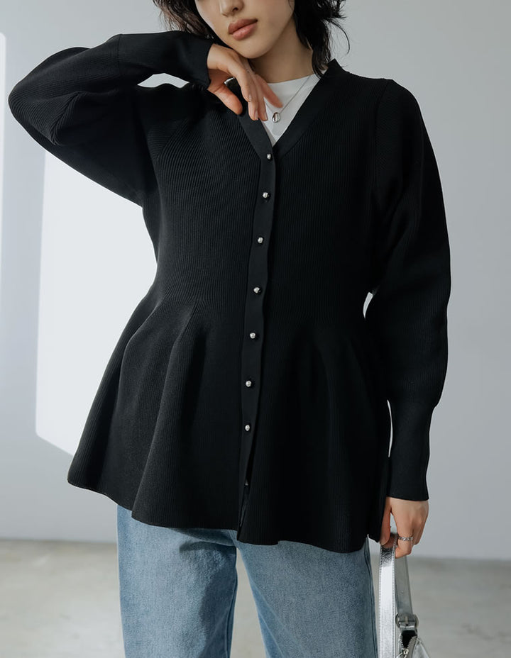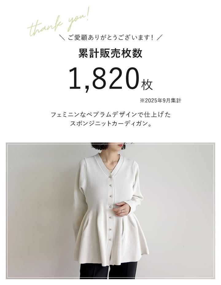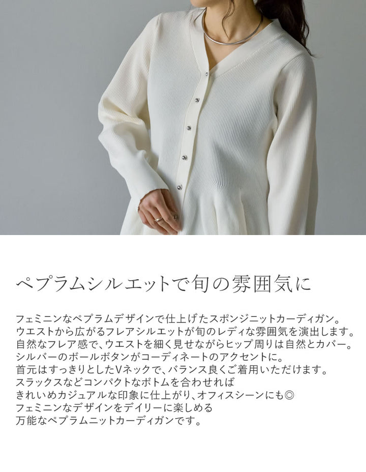 フェミニンなペプラムデザインで仕上げたスポンジニットカーディガン。ウエストから広がるフレアシルエットが、旬のレディな雰囲気を演出します。