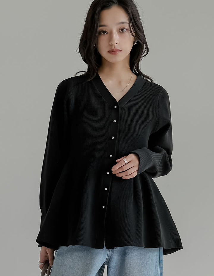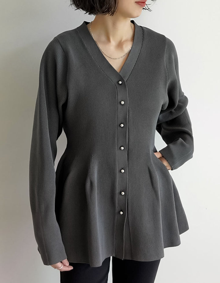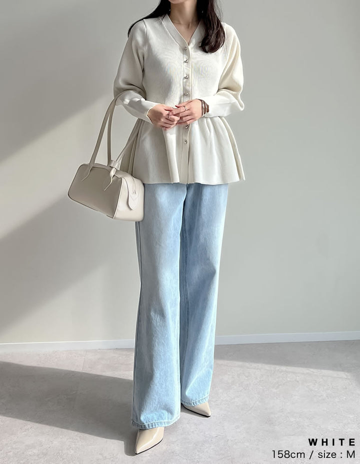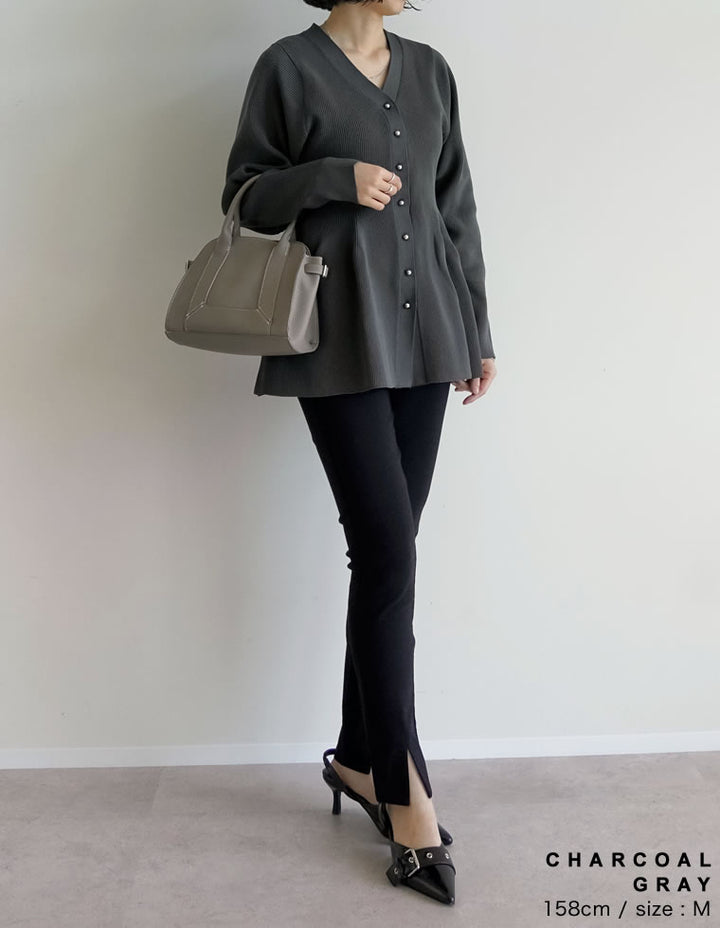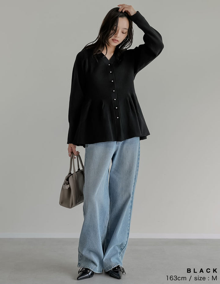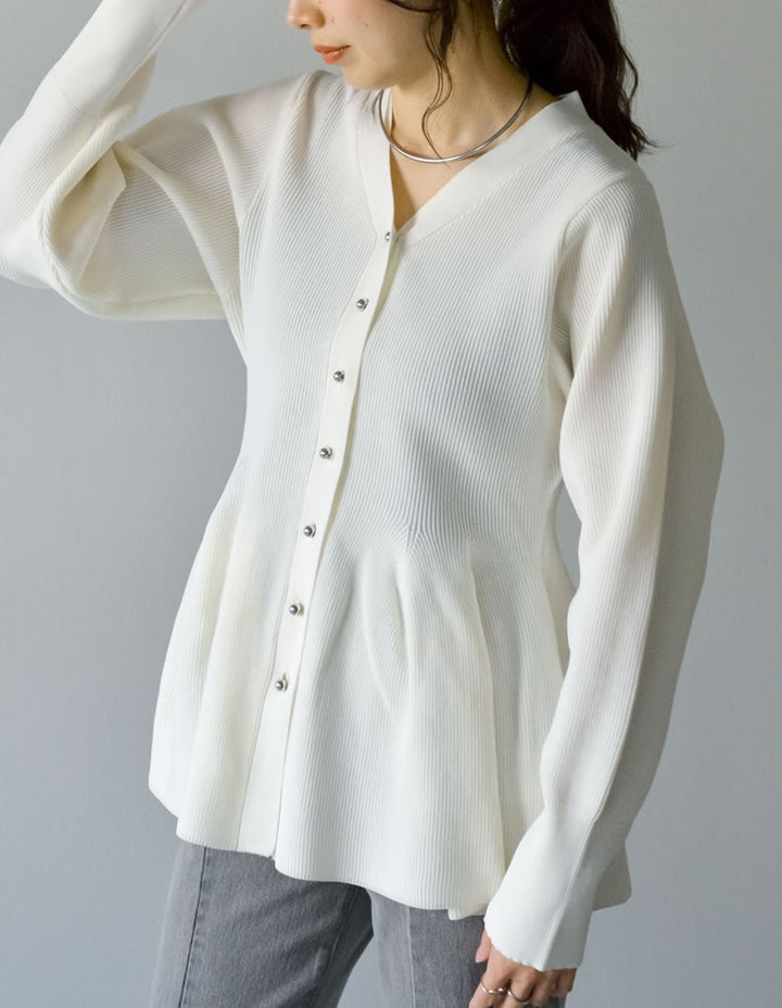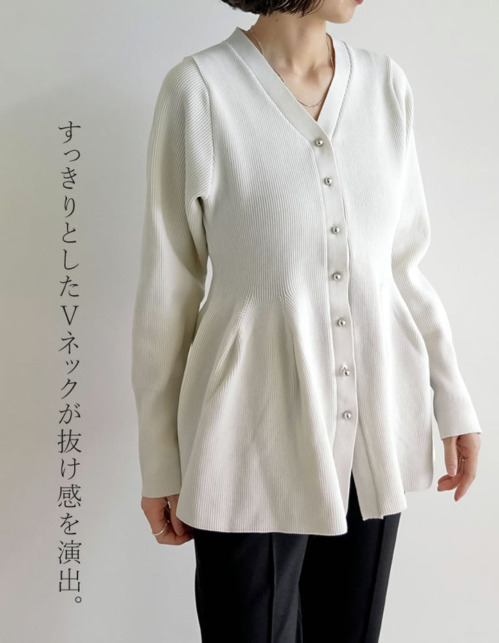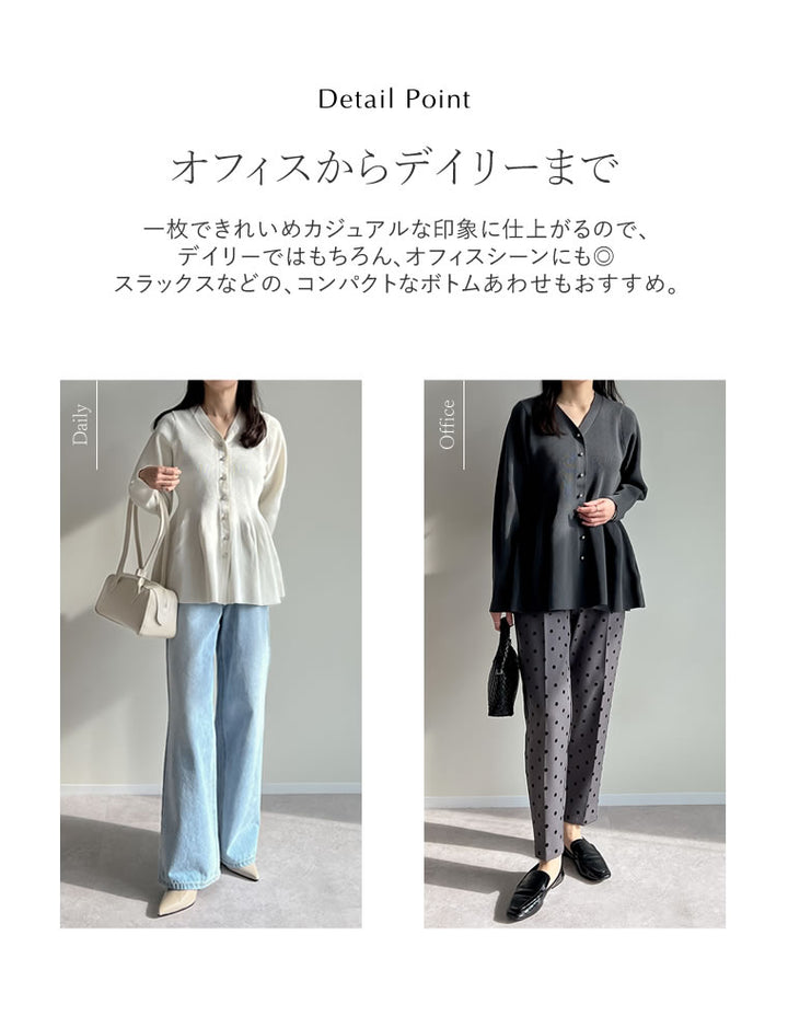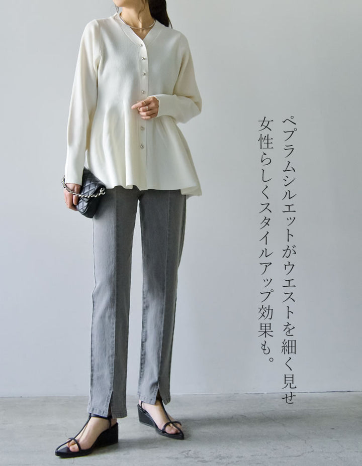 自然なフレア感で、ウエストを細く見せながらヒップ周りは自然とカバー。シルバーのボールボタンがコーディネートのアクセントに。首元はすっきりとしたVネックで、バランス良くご着用いただけます。スラックスなどコンパクトなボトムを合わせれば、きれいめカジュアルな印象に仕上がり、オフィスシーンにも◎フェミニンなデザインをデイリーに楽しめる、万能なペプラムニットカーディガンです。