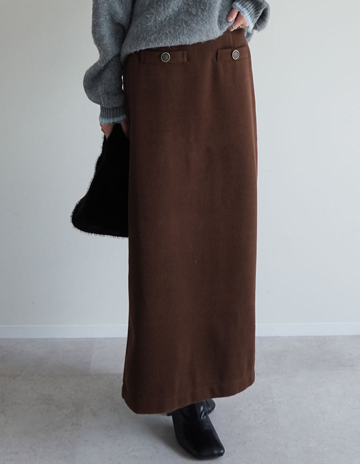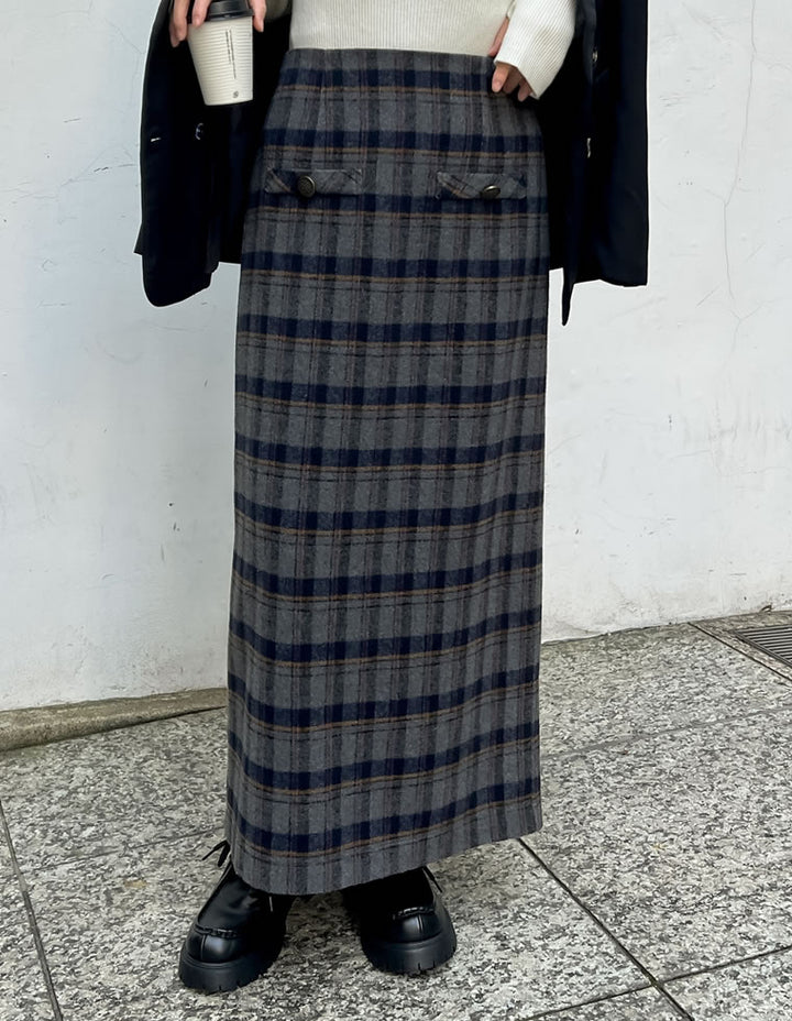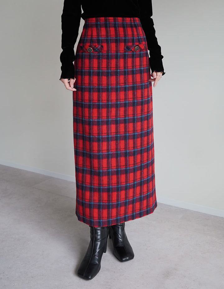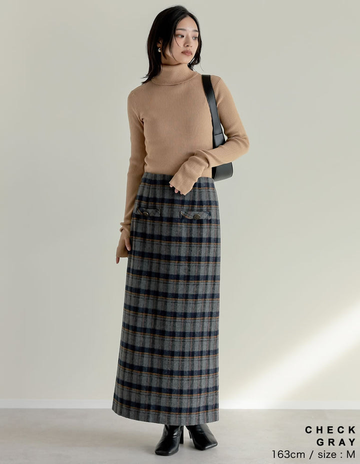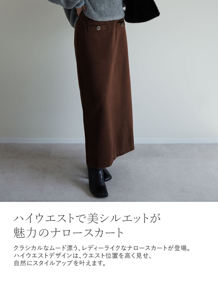 クラシカルなムード漂う、レディライクなナロースカート。ハイウエストデザインがウエスト位置を高く見せ、自然なスタイルアップを叶えます。チェック柄を活かしたデザインが、すっきりとしたIラインシルエットを演出。下半身の体型をさりげなくカバーし、大人の洗練されたスタイルを完成させます。フェイクポケットには、金ボタンをあしらい上品なアクセントに。カラー展開は、ベーシックな無地に加え、トレンド感のあるチェック柄もご用意しました。きれいめながらも旬の装いを楽しめる、あたたかみのある起毛スカートです。