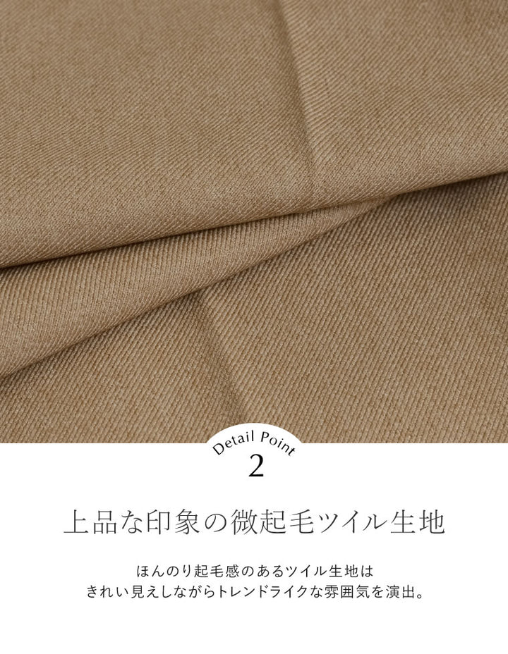 ほんのり起毛感のあるツイル生地は、きれい見えしながらトレンドライクな雰囲気を演出。