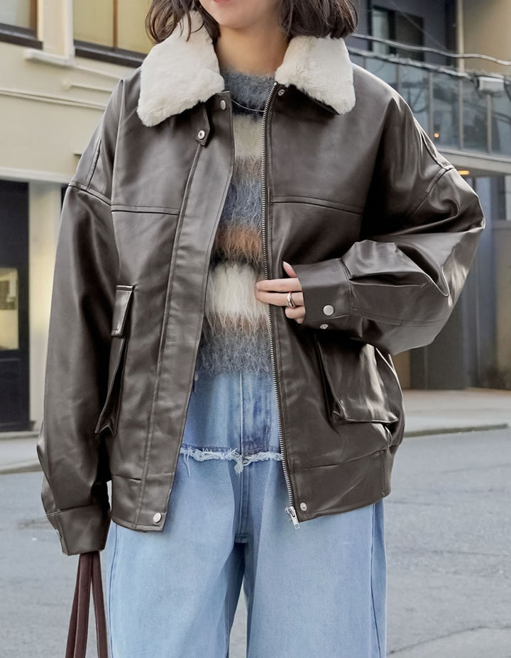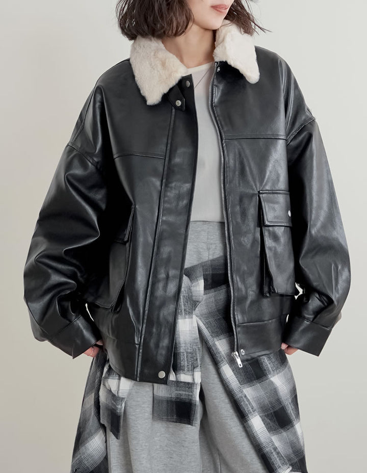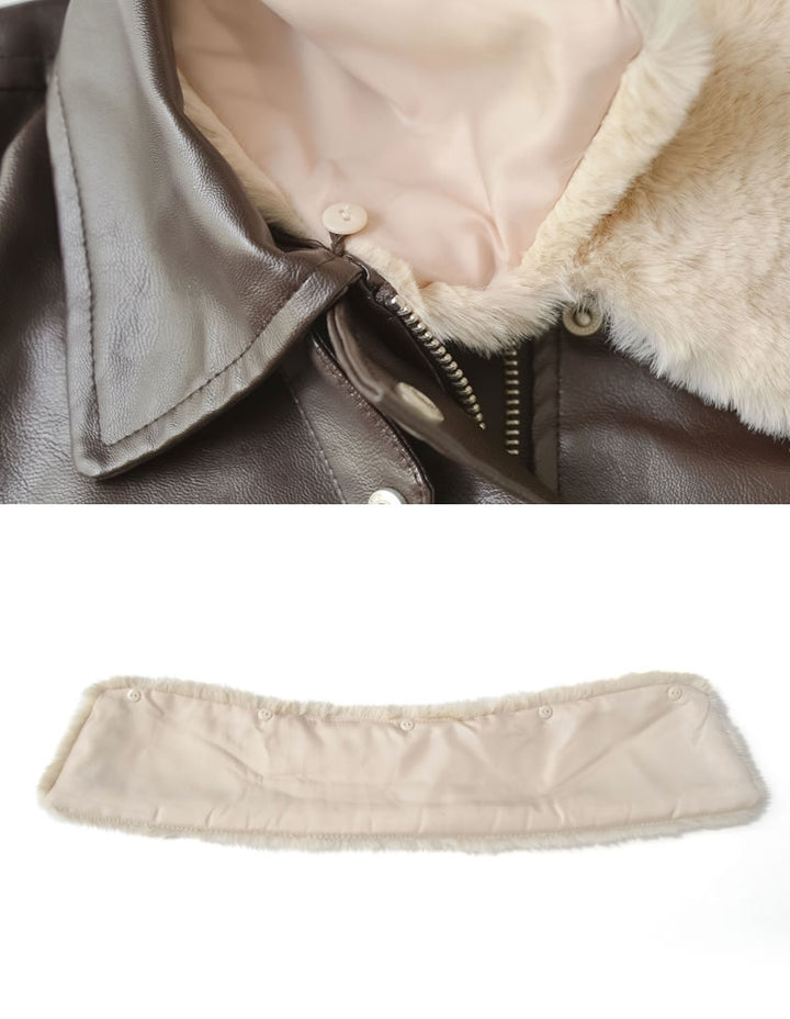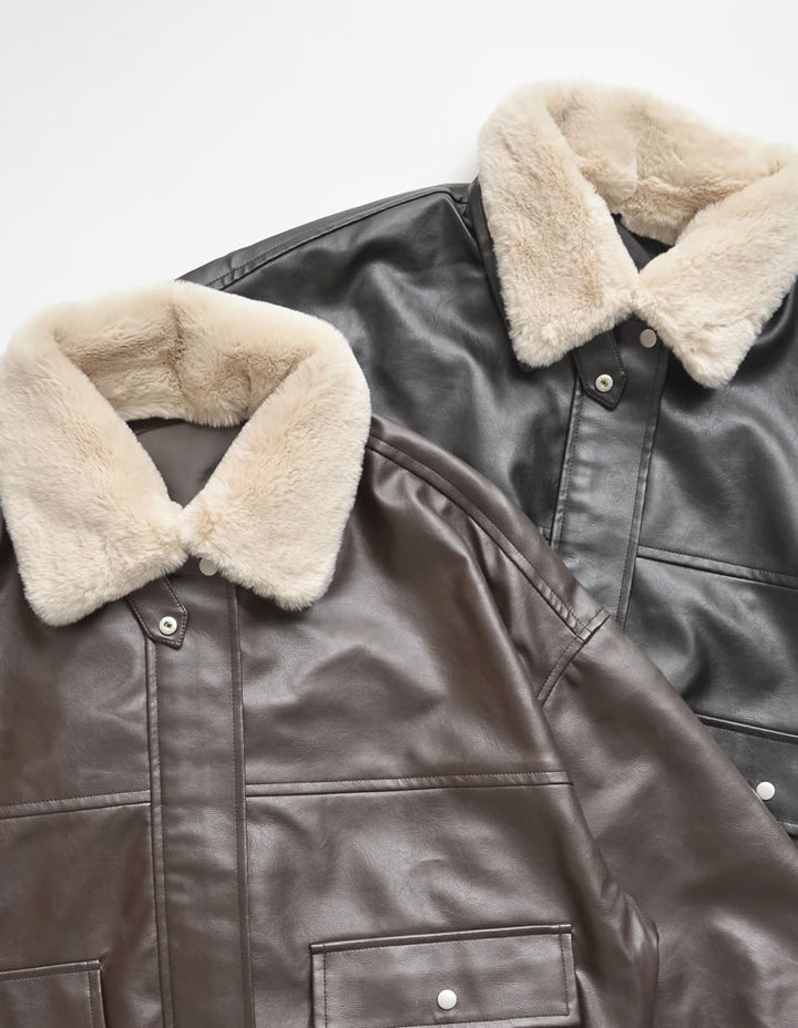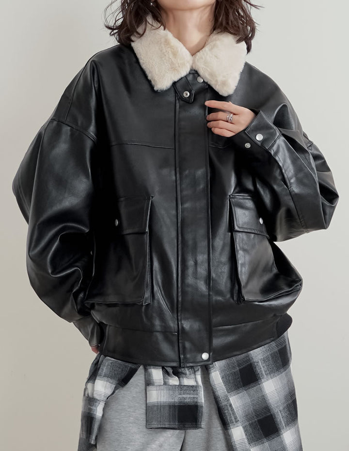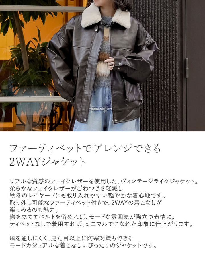 リアルな質感のフェイクレザーを使用した、ヴィンテージライクジャケットです。柔らかなフェイクレザーがごわつきを軽減し、秋冬のレイヤードにも取り入れやすい軽やかな着心地。取り外し可能なファーティペット付きで、2WAYの着こなしが楽しめるのも魅力。襟を立ててベルトを留めれば、モードな雰囲気が際立つ表情に。ティペットなしで着用すれば、ミニマルでこなれた印象に仕上がります。風を通しにくく、見た目以上に防寒対策もできる、モードカジュアルな着こなしにぴったりのジャケットです。