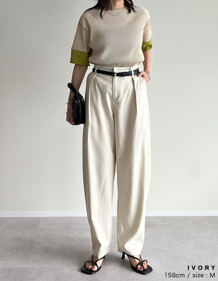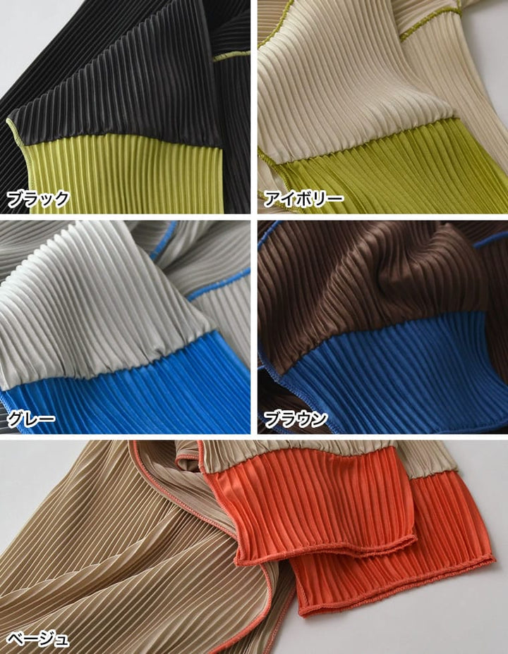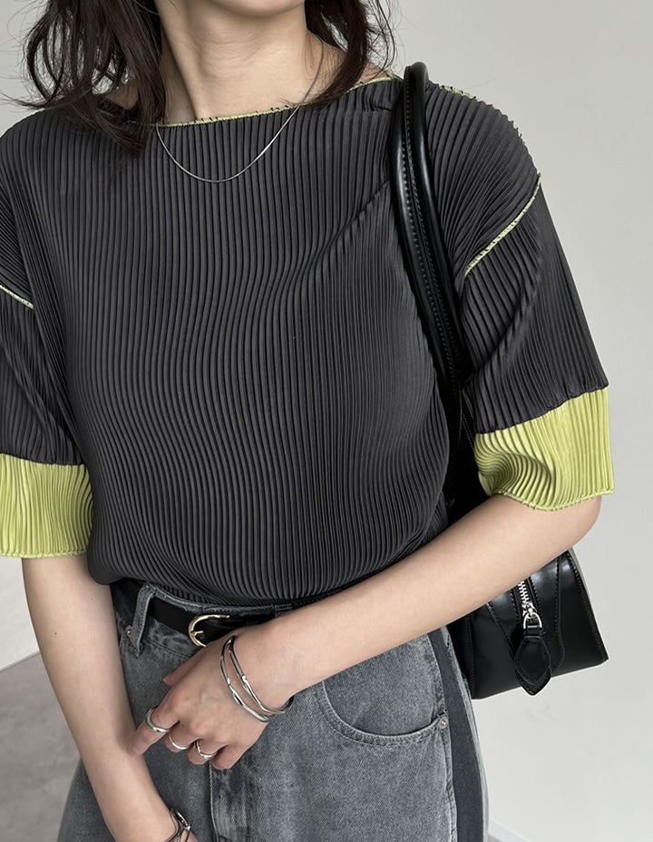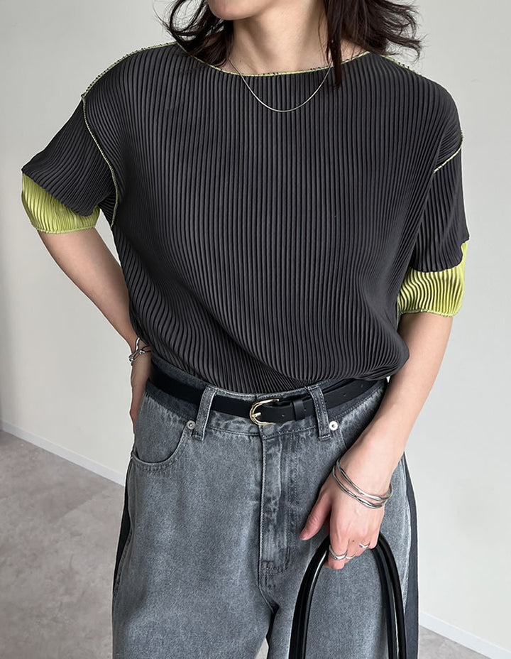 プリーツ生地&配色が目を引くトレンドライクなクルーネックトップス。