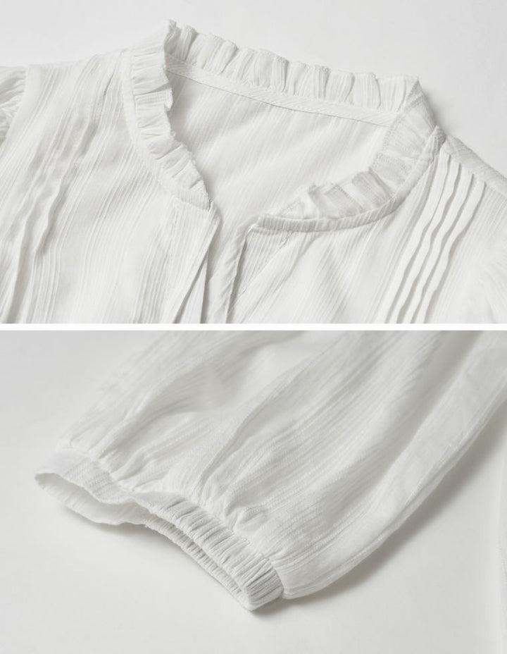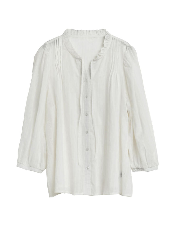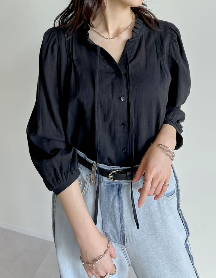 柔らかくナチュラルな風合いのコットンに、襟元のフリルとリボンが加わり、フェミニンなムードを演出。