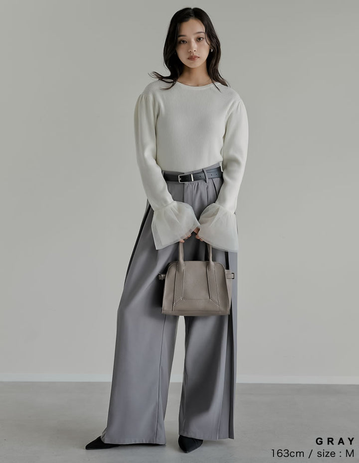 フロントのプリーツが縦のラインを強調し、エレガントな印象もプラスしてくれます。