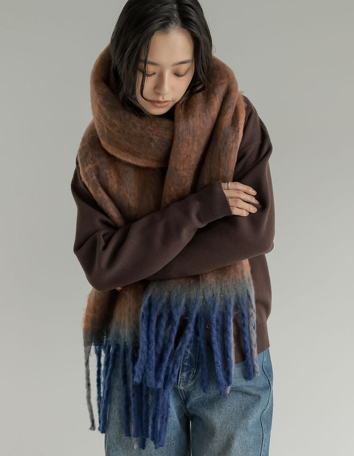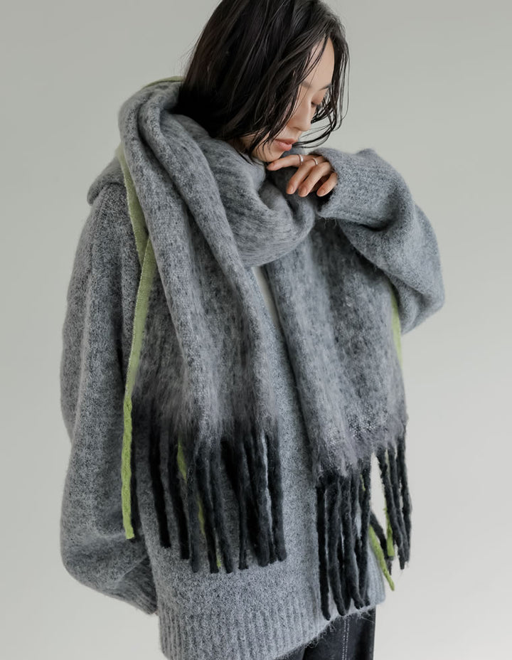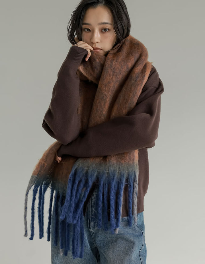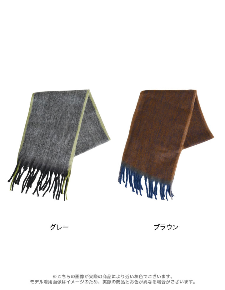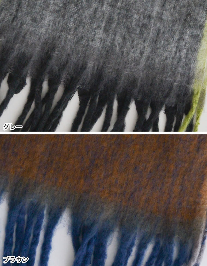 深みのあるカラーを基調に、トレンドライクな配色にこだわったマフラー。シャギーニットの起毛感ある風合いで、見た目にも暖かく、秋冬コーデのアクセントにぴったりです。しっかりとボリュームのある大きめサイズで、首元を包み込みながら防寒性も◎肩に掛けてショールのように使えるので、デイリー使いにも重宝します。