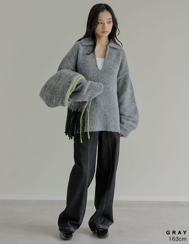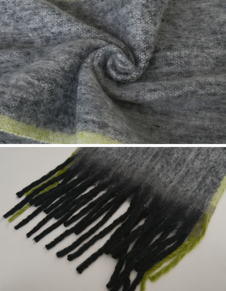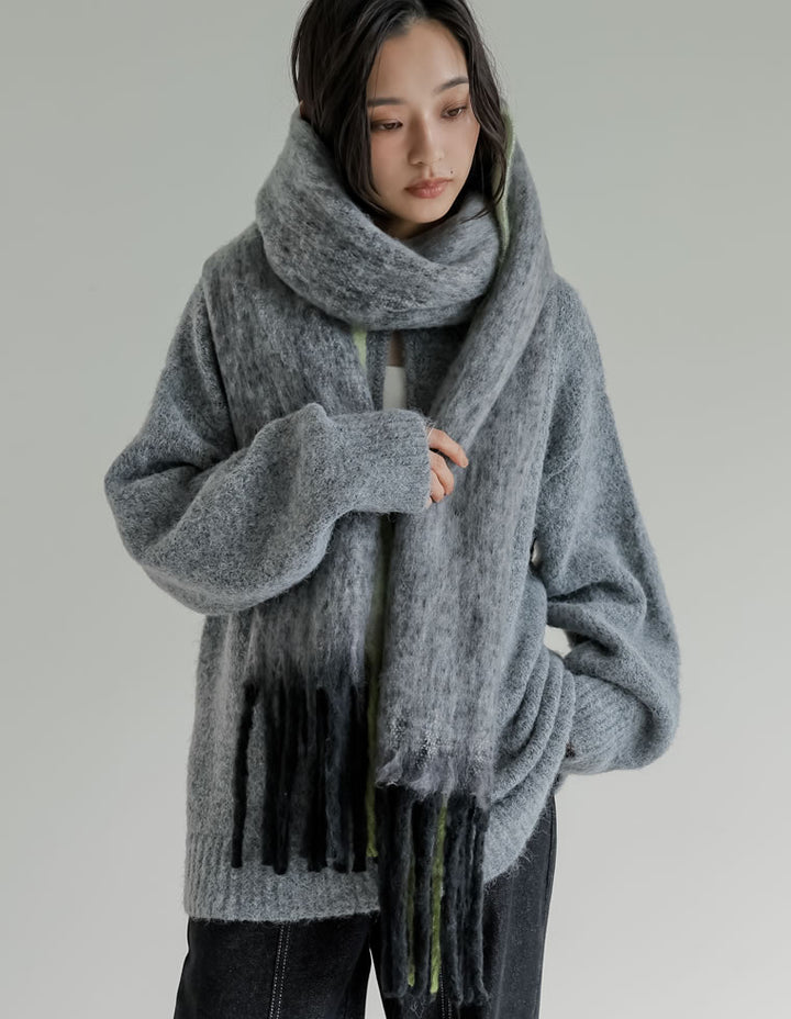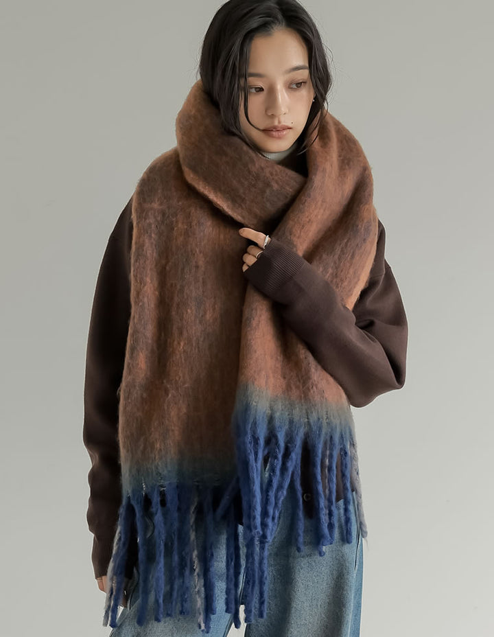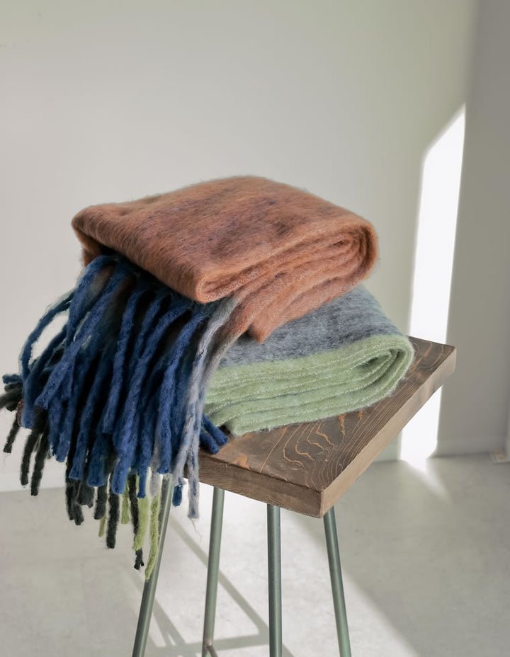 深みのあるカラーを基調に、トレンドライクな配色にこだわったマフラー。シャギーニットの起毛感ある風合いで、見た目にも暖かく、秋冬コーデのアクセントにぴったりです。しっかりとボリュームのある大きめサイズで、首元を包み込みながら防寒性も◎肩に掛けてショールのように使えるので、デイリー使いにも重宝します。