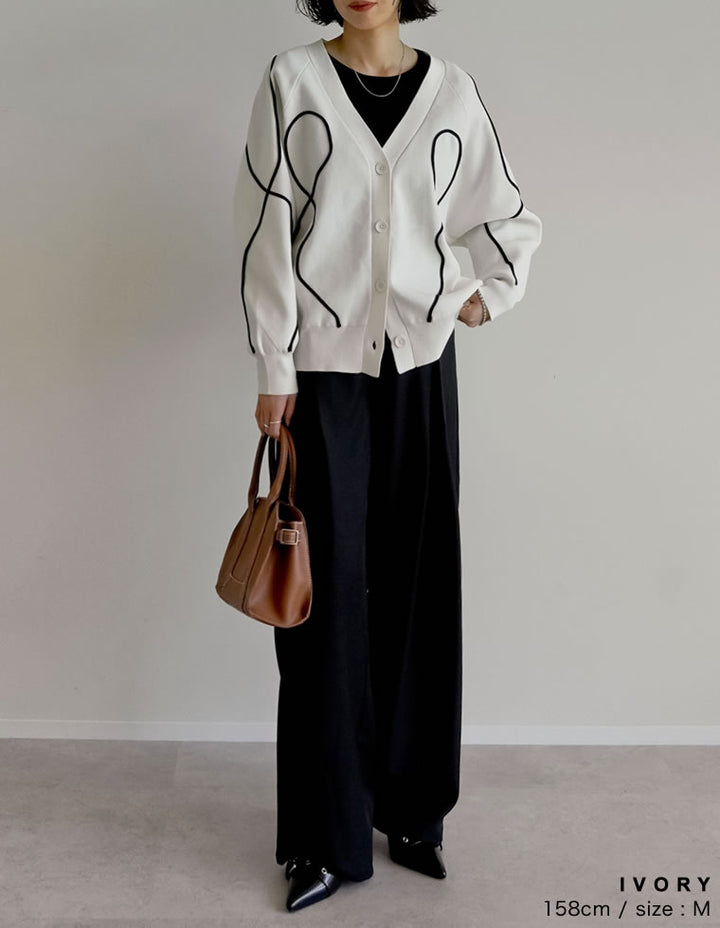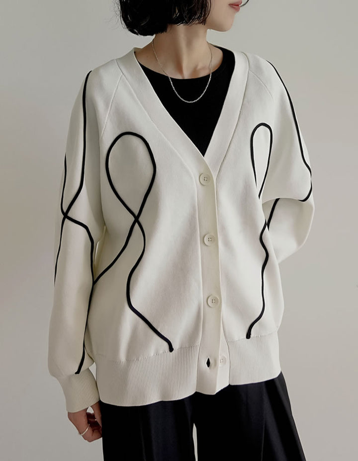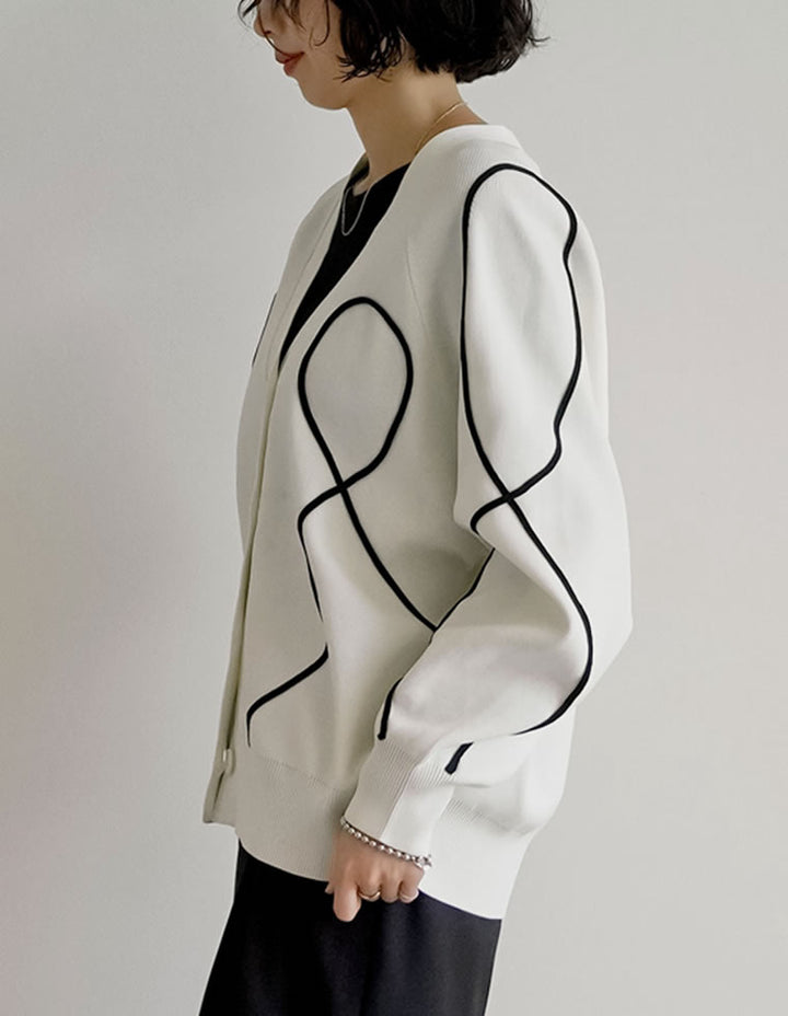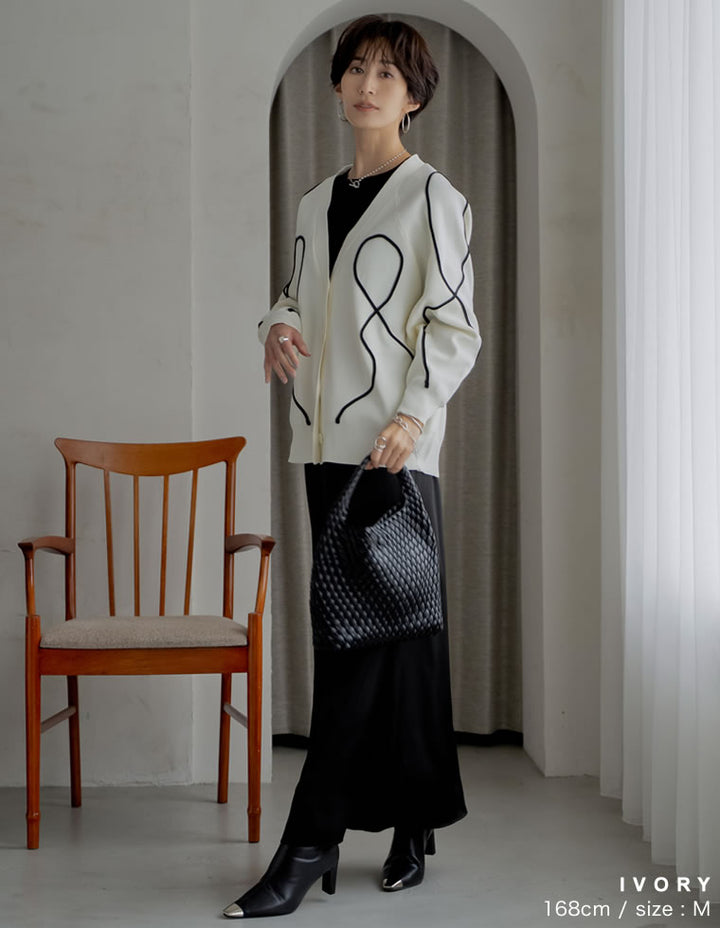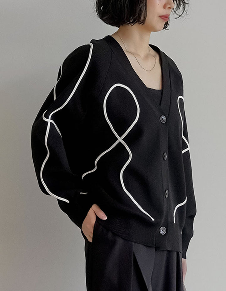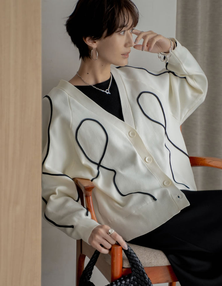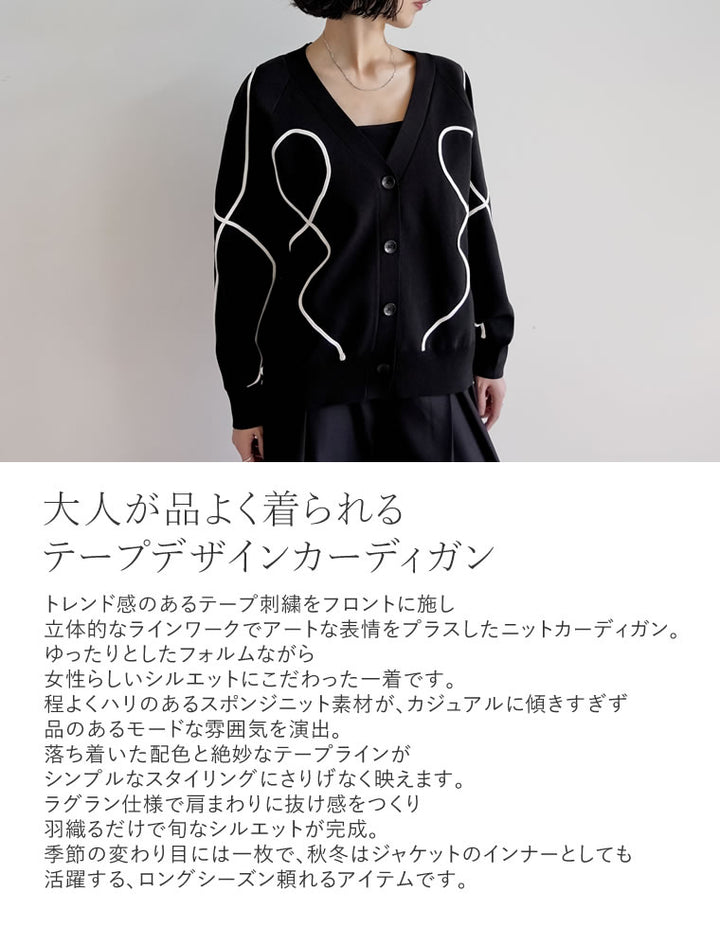 ▼デザイントレンド感のあるテープ刺繍をフロントに施し、立体的なラインワークでアートな表情をプラスしたニットカーディガン。ゆったりとしたフォルムながら、女性らしいシルエットにこだわった一着です。程よくハリのあるスポンジニット素材が、カジュアルに傾きすぎず、品のあるモードな雰囲気を演出。落ち着いた配色と絶妙なテープラインが、シンプルなスタイリングにさりげなく映えます。ラグラン仕様で肩まわりに抜け感をつくり、羽織るだけで旬なシルエットが完成。季節の変わり目には一枚で、秋冬はジャケットのインナーとしても活躍する、ロングシーズン頼れるアイテムです。