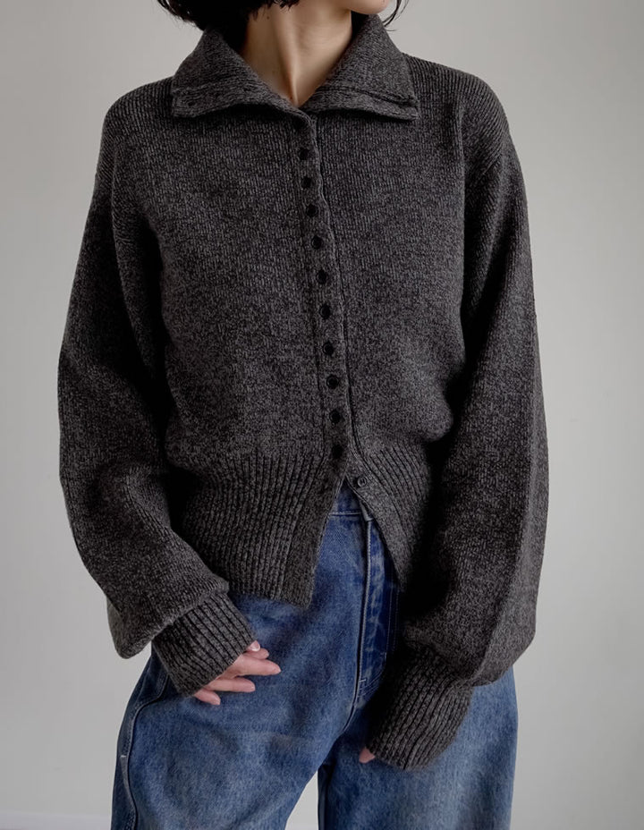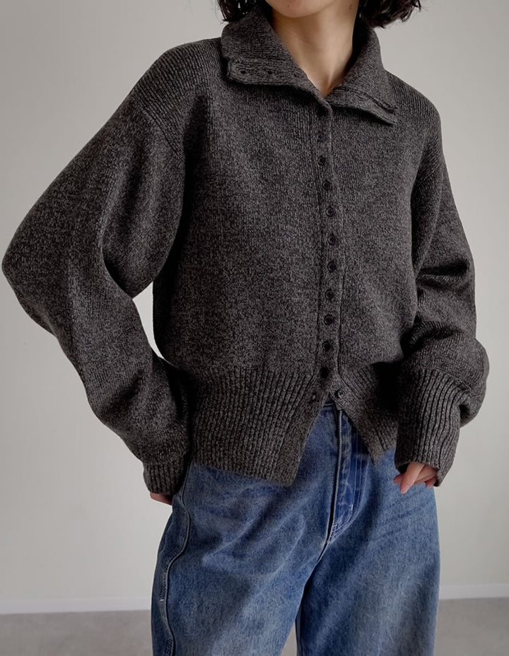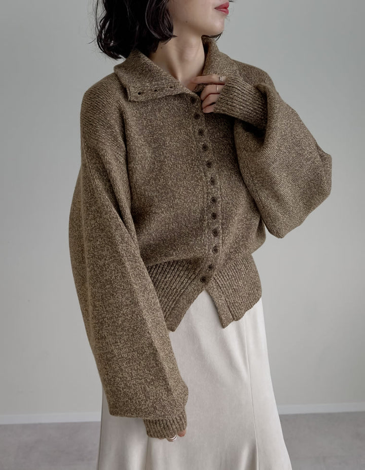 フロントのボタンデザインが印象的な、ミックスカラーニットカーディガン。襟を立てればモードなハイネックに、折り返せば洗練されたポロカラー風にと、気分やスタイリングに合わせて表情を変えられます。ミドルゲージのミックス糸を使用し、表面感のあるもっちりとした風合いが魅力。程よくゆとりのあるシルエットながら、裾のリブ切り替えがシャープなラインを描き、リラックス感とすっきり見えを両立。襟のアレンジでスタイリングに変化をつけられるため、ミニマルな着こなしにも立体感をプラスしてくれます。