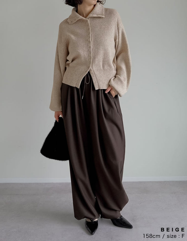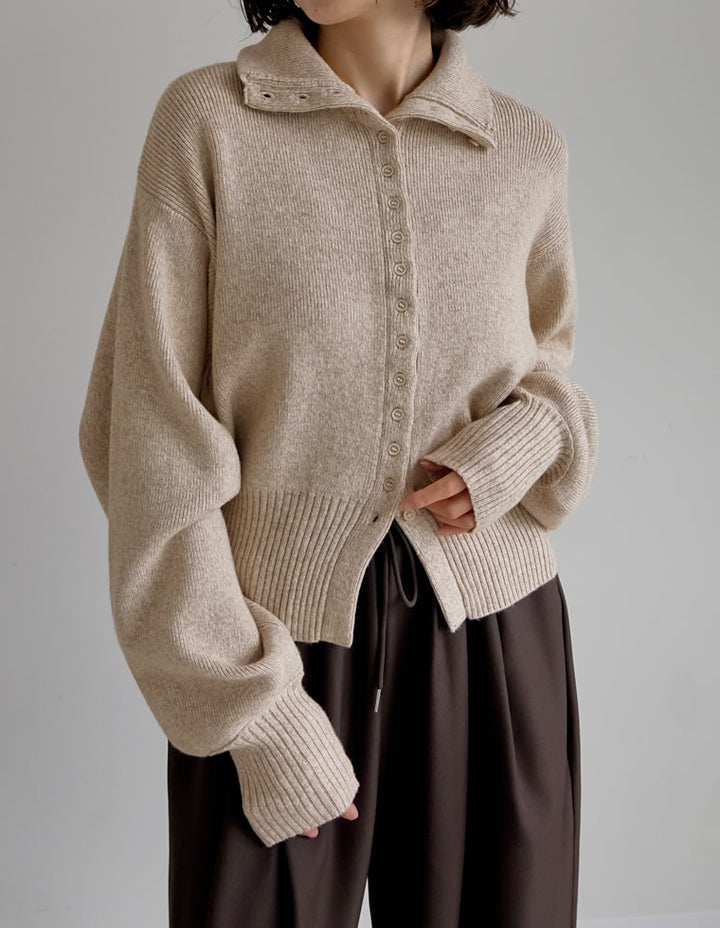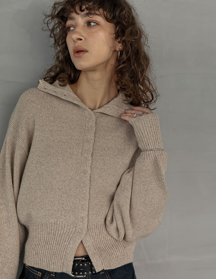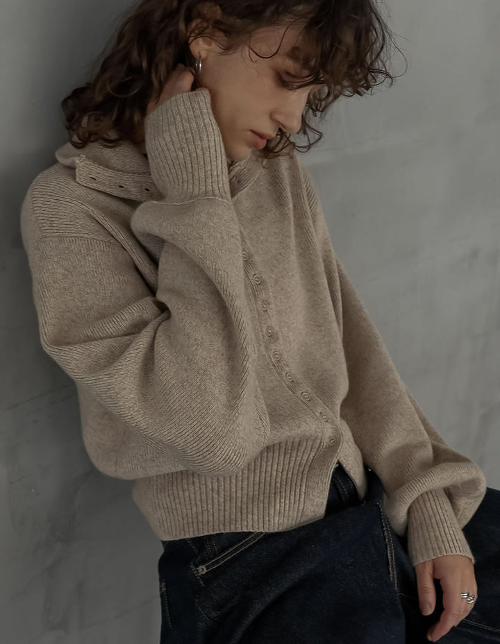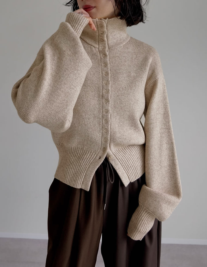 カーディガンとしてはもちろん、ボタンを留めて一枚着のハイネックニットとしても活躍。ワイドパンツやストレートスラックスと合わせれば、シンプルながらモード感漂う大人のカジュアルスタイルが完成します。