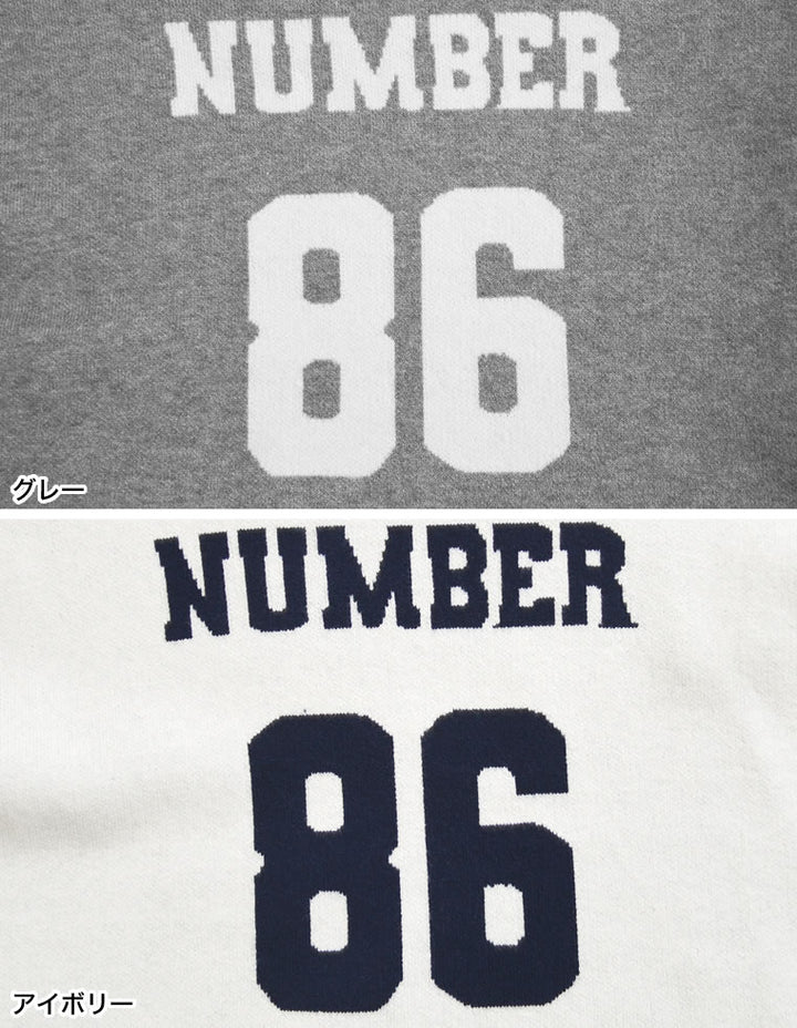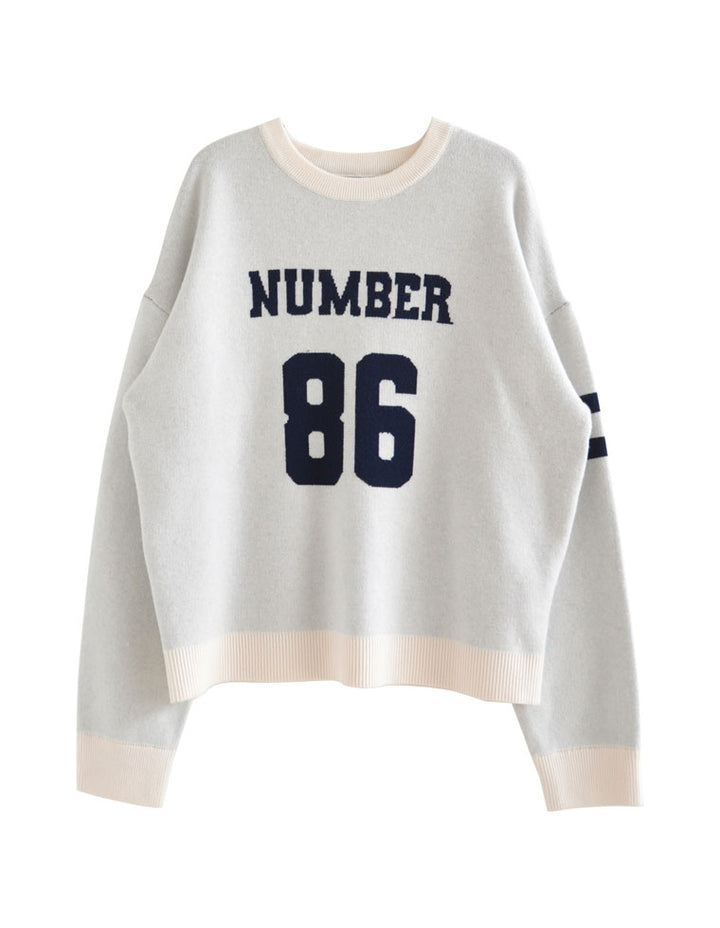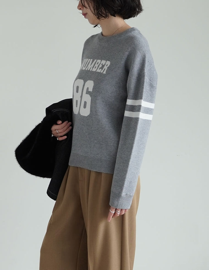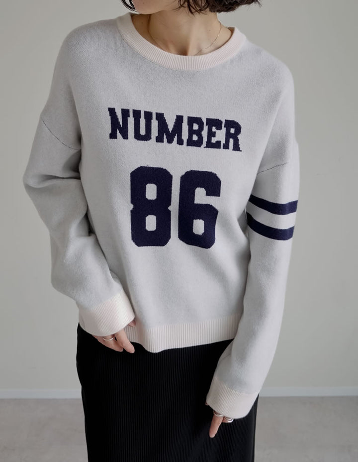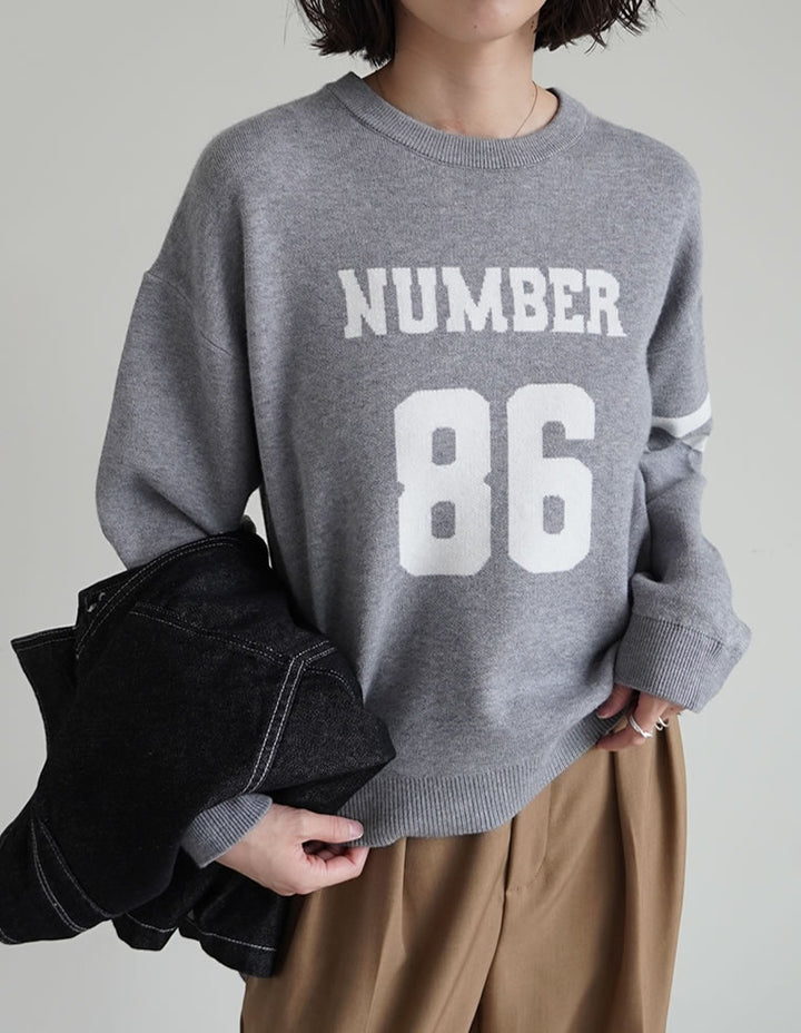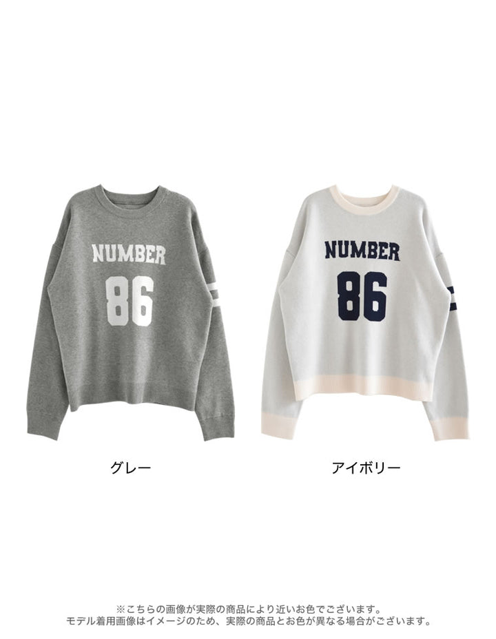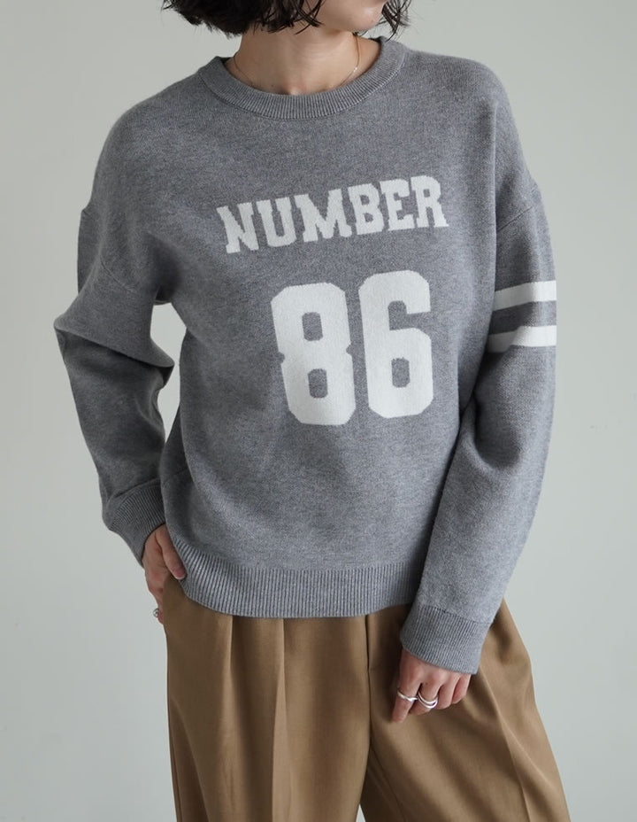 スウェットライクに着こなせる、ナンバーデザインがポイントになったニットトップス。