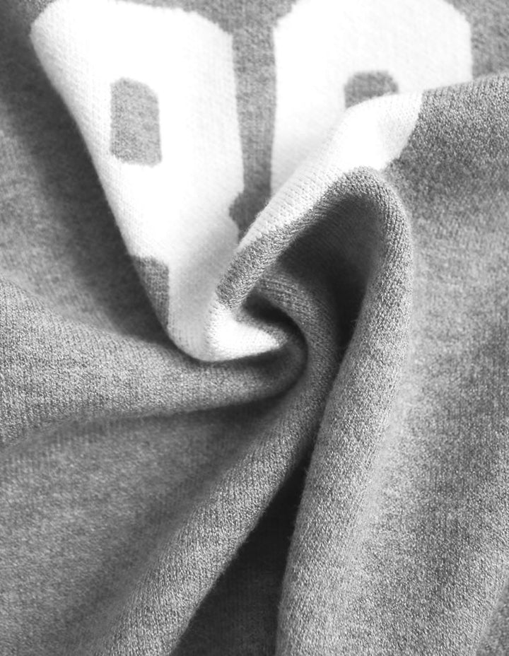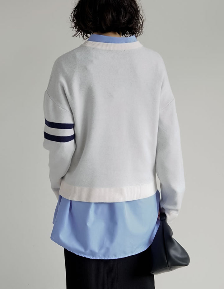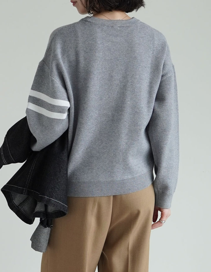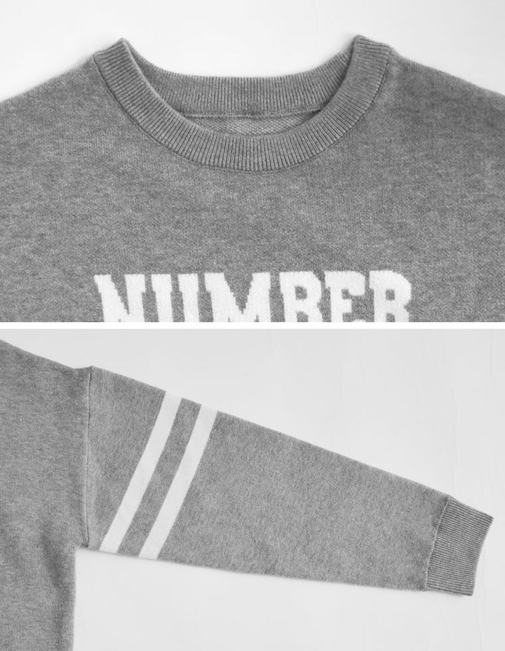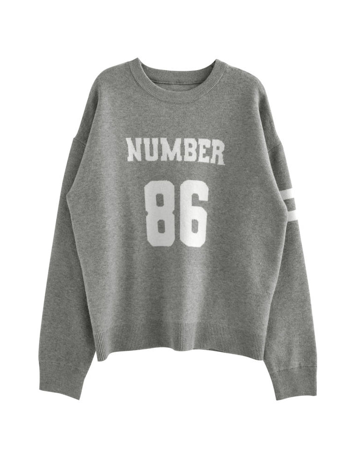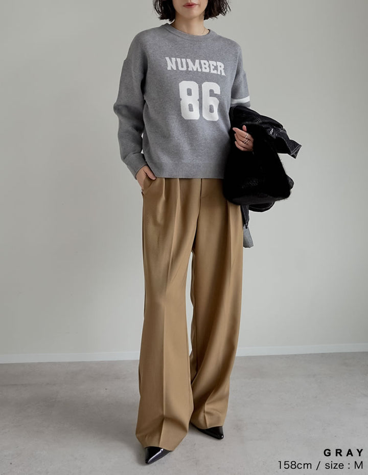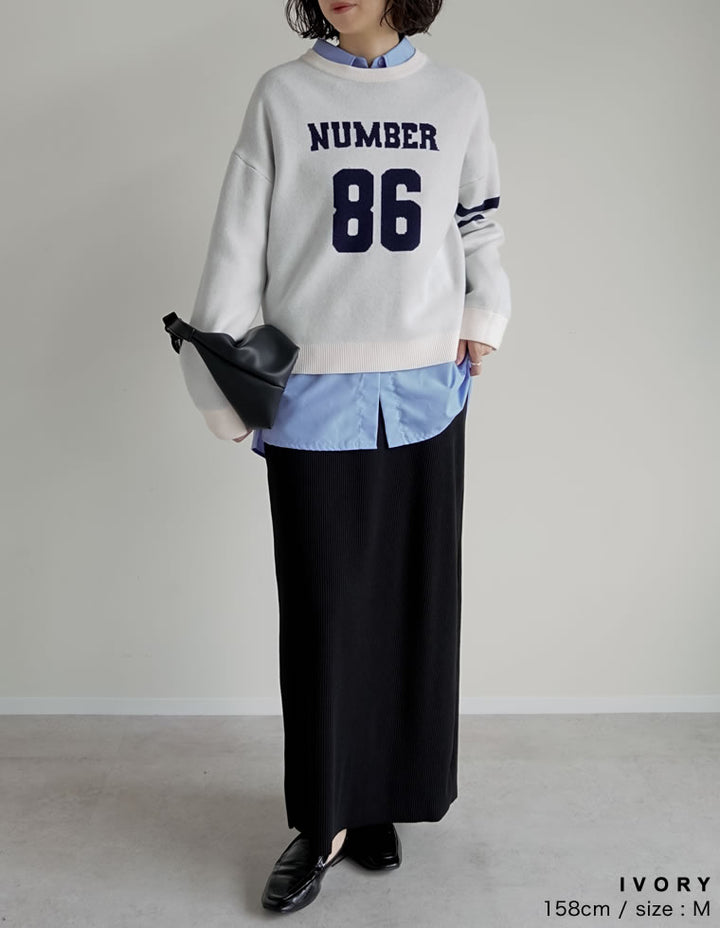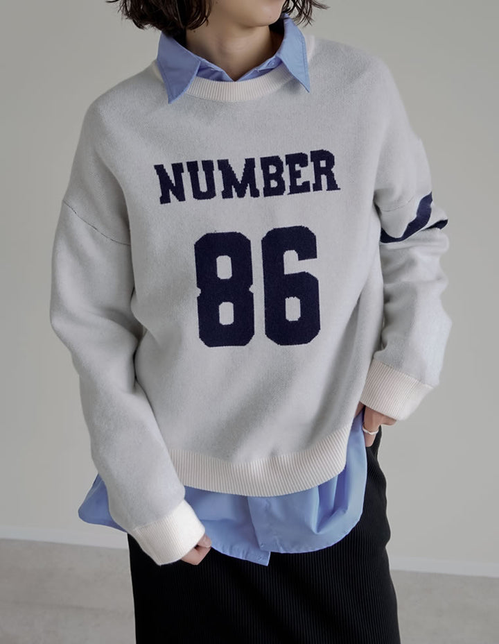 スウェットライクに着こなせる、ナンバーデザインがポイントになったニットトップス。