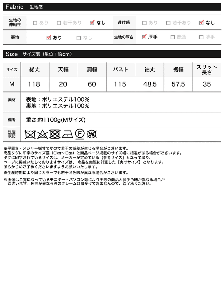 | サイズ | 総丈 | 天幅 | 肩幅 | バスト | 袖丈 | 裾幅 | スリット長さ |