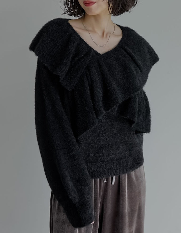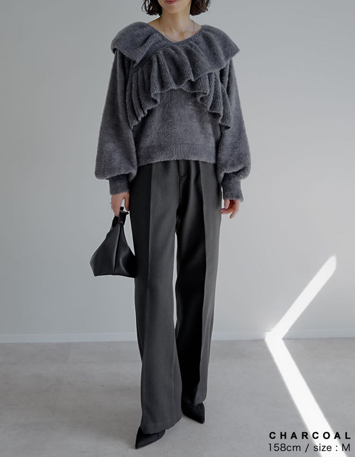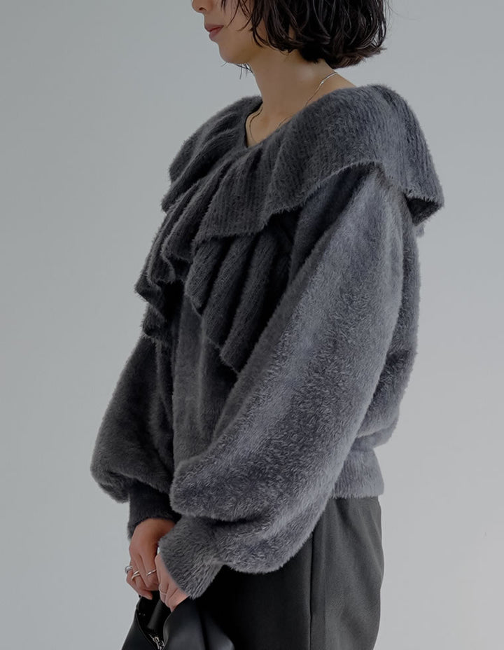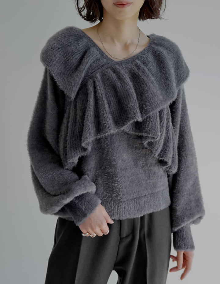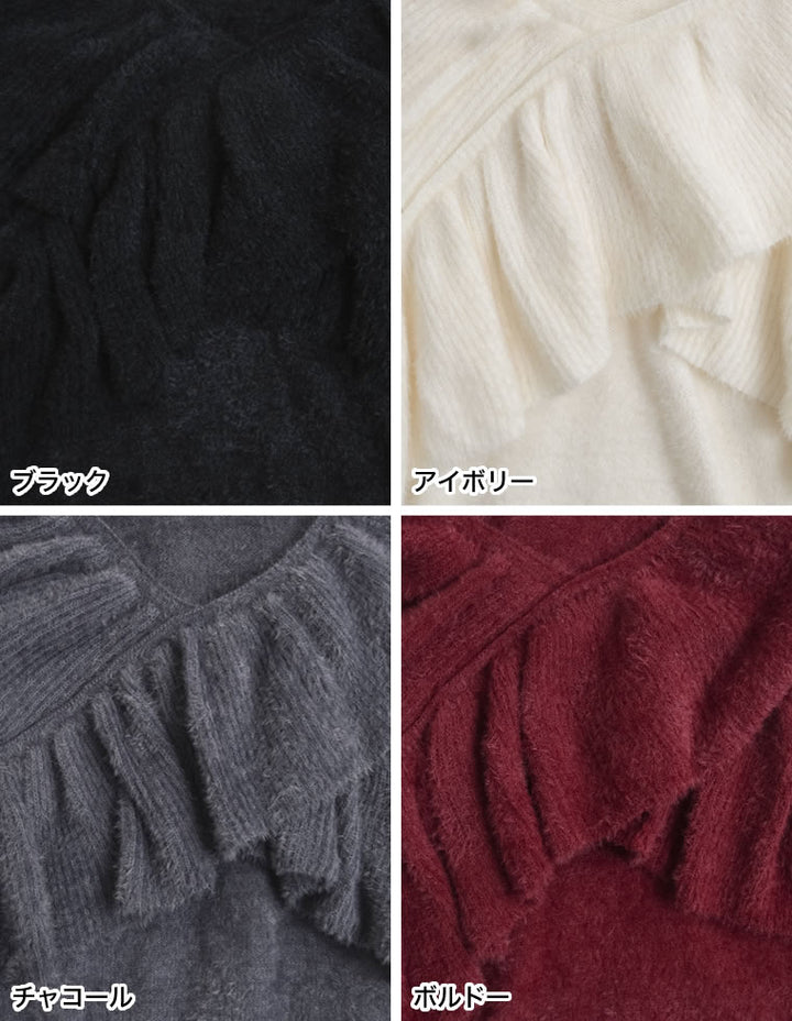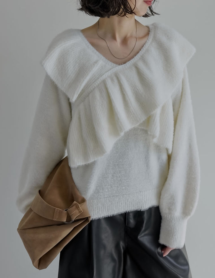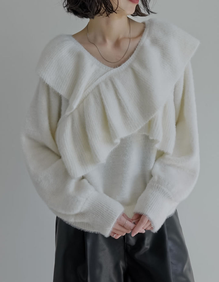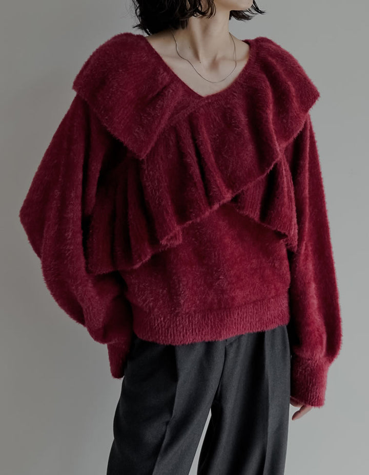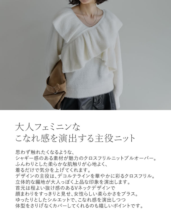 思わず触れたくなるような、シャギー感のある素材が魅力のクロスフリルニットプルオーバー。ふんわりとした柔らかな肌触りが心地よく、着るだけで気分を上げてくれます。デザインの主役は、デコルテラインを華やかに彩るクロスフリル。立体的な編地が大人っぽく上品な印象を演出します。首元は程よい抜け感のあるVネックデザインで、顔まわりをすっきりと見せ、女性らしい柔らかさをプラス。ゆったりとしたシルエットで、こなれ感を演出しつつ、体型をさりげなくカバーしてくれるのも嬉しいポイントです。
