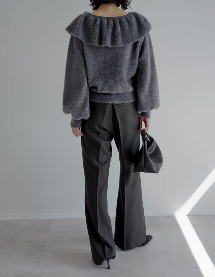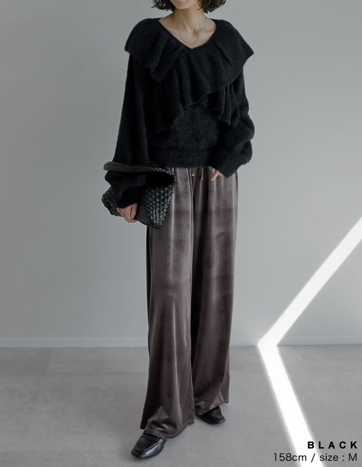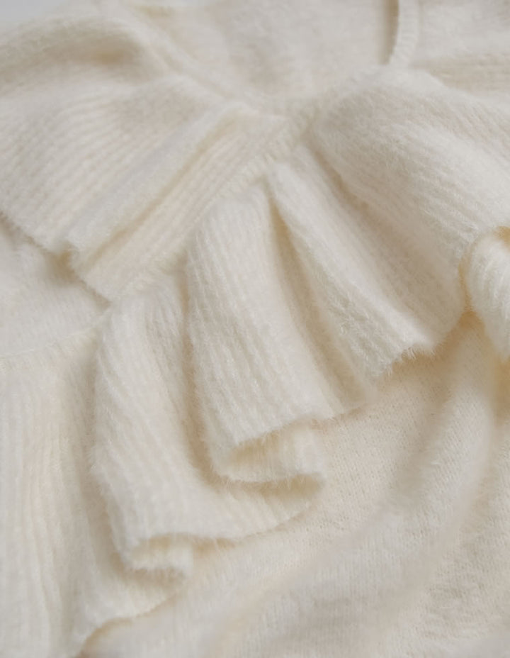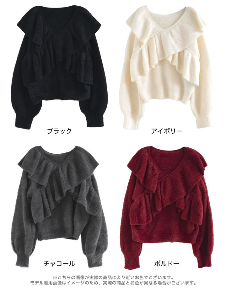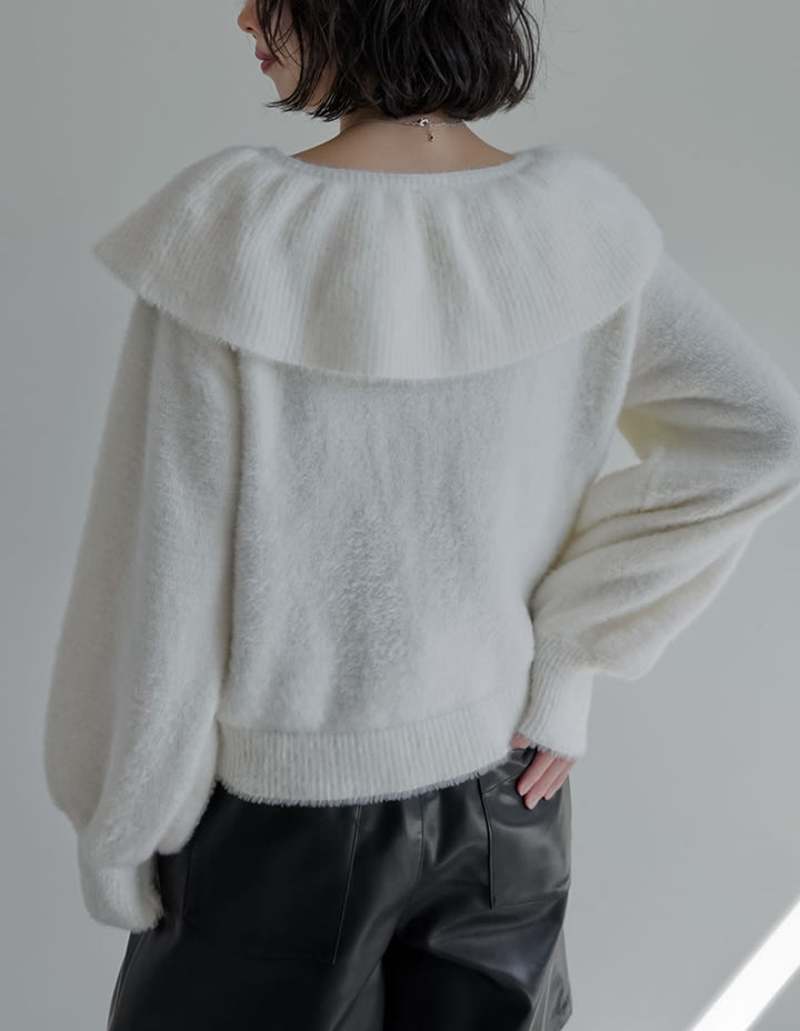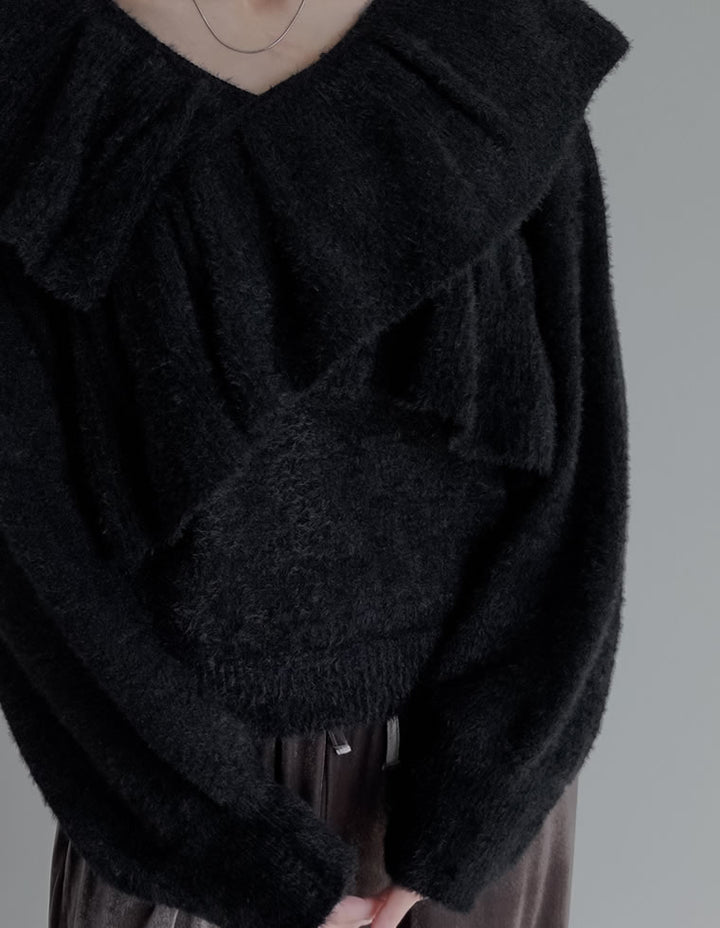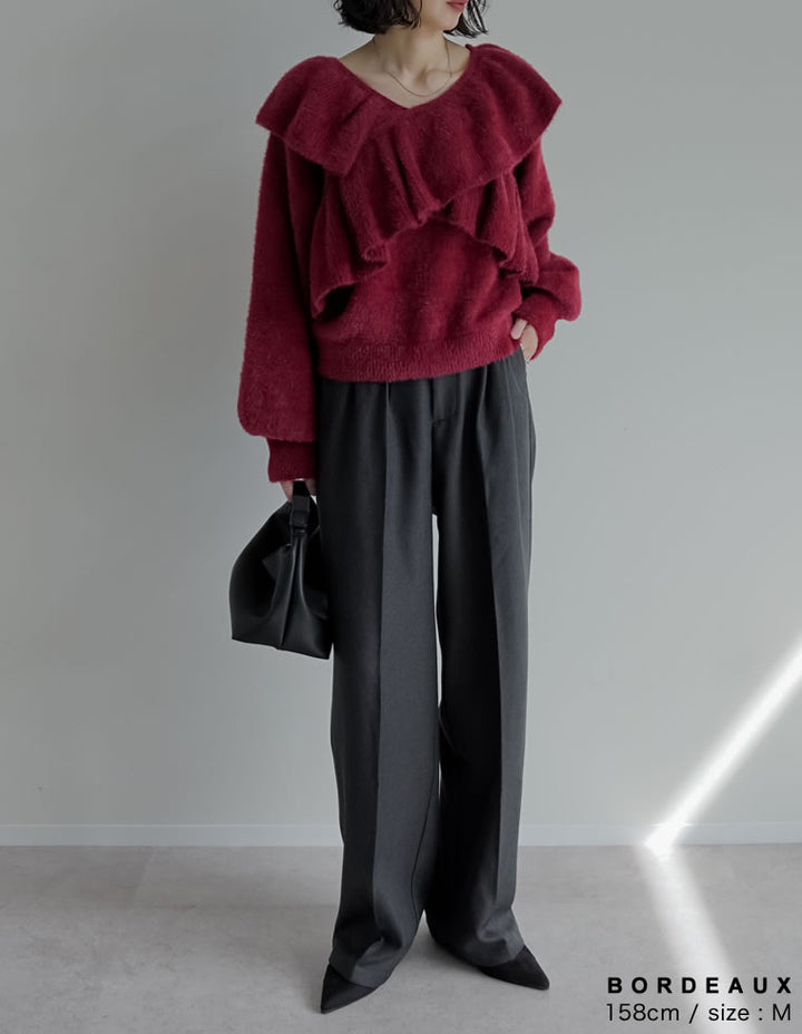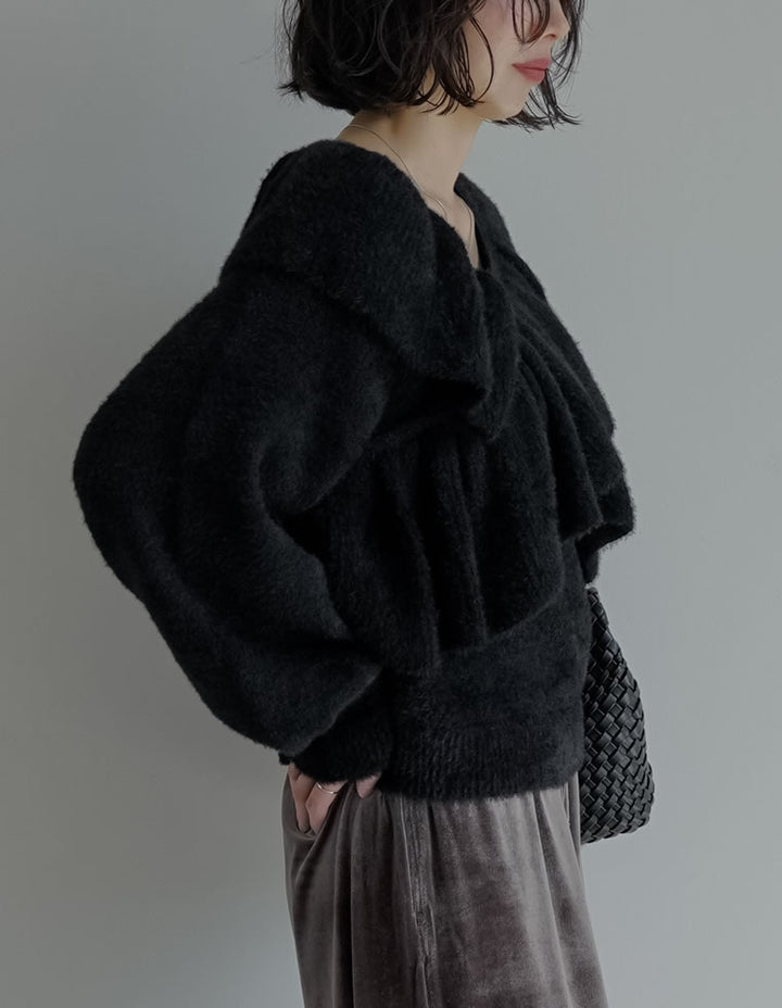思わず触れたくなるような、シャギー感のある素材が魅力のクロスフリルニットプルオーバー。ふんわりとした柔らかな肌触りが心地よく、着るだけで気分を上げてくれます。デザインの主役は、デコルテラインを華やかに彩るクロスフリル。立体的な編地が大人っぽく上品な印象を演出します。首元は程よい抜け感のあるVネックデザインで、顔まわりをすっきりと見せ、女性らしい柔らかさをプラス。ゆったりとしたシルエットで、こなれ感を演出しつつ、体型をさりげなくカバーしてくれるのも嬉しいポイントです。