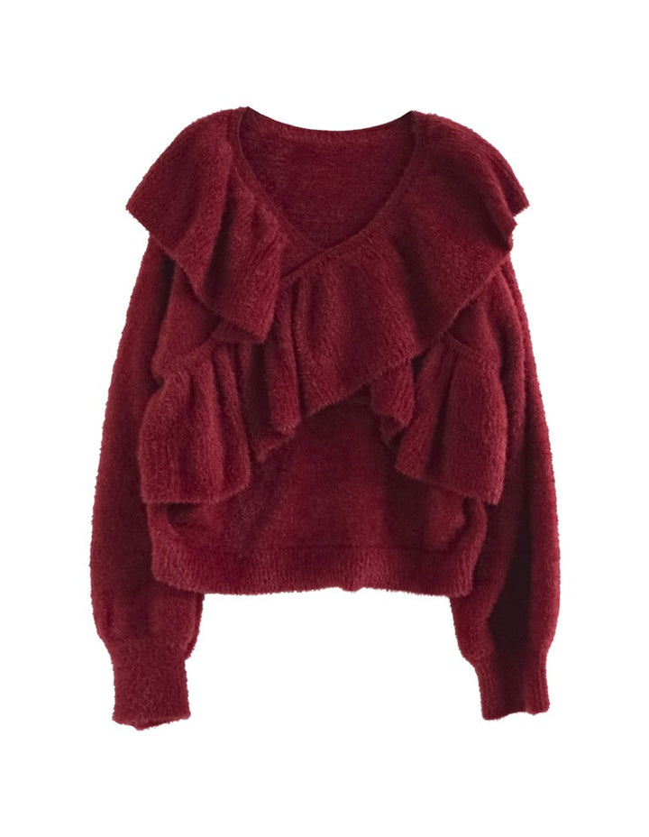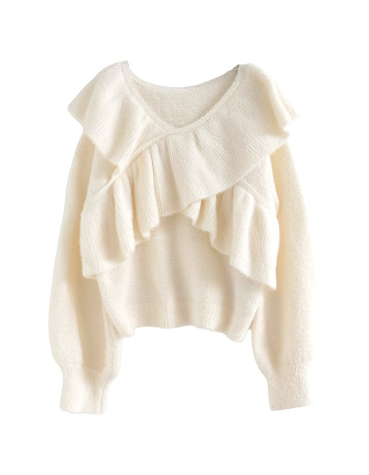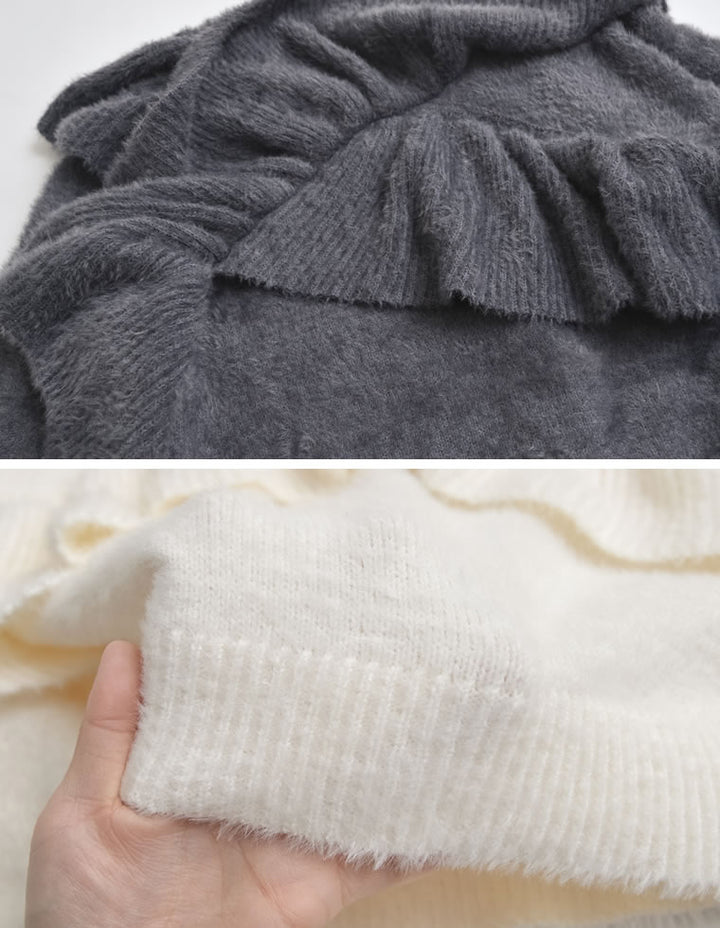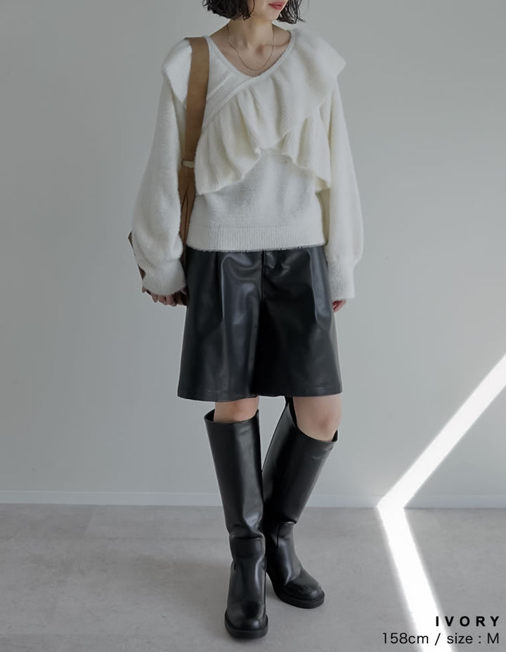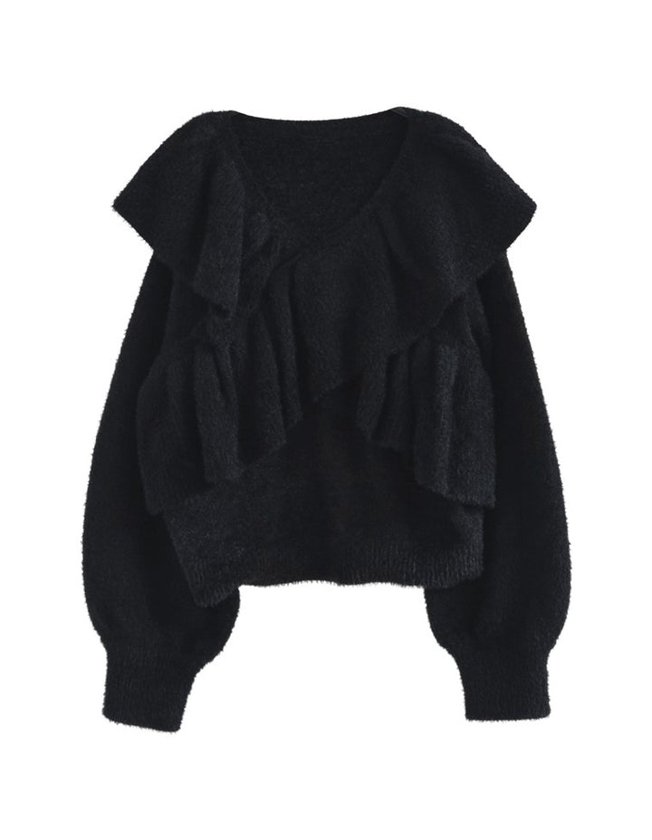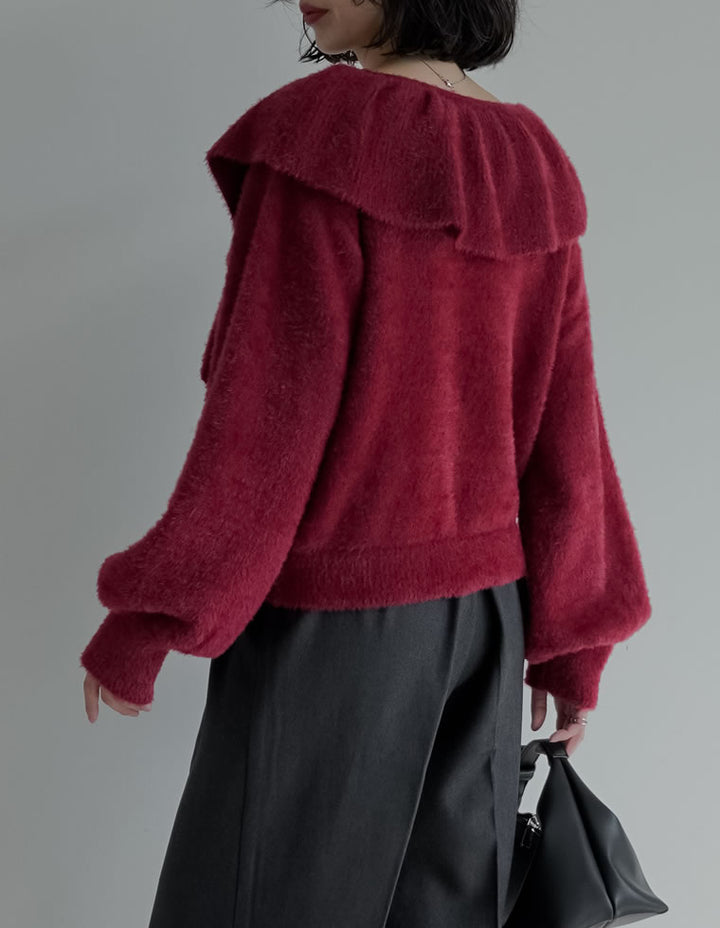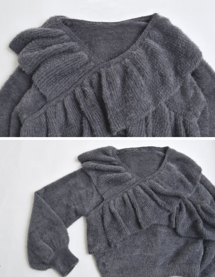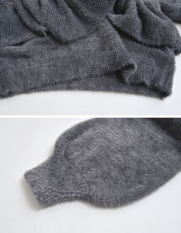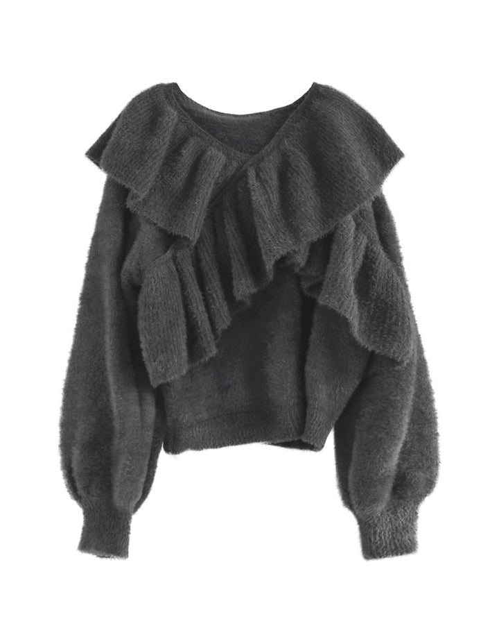 思わず触れたくなるような、シャギー感のある素材が魅力のクロスフリルニットプルオーバー。ふんわりとした柔らかな肌触りが心地よく、着るだけで気分を上げてくれます。デザインの主役は、デコルテラインを華やかに彩るクロスフリル。立体的な編地が大人っぽく上品な印象を演出します。首元は程よい抜け感のあるVネックデザインで、顔まわりをすっきりと見せ、女性らしい柔らかさをプラス。ゆったりとしたシルエットで、こなれ感を演出しつつ、体型をさりげなくカバーしてくれるのも嬉しいポイントです。