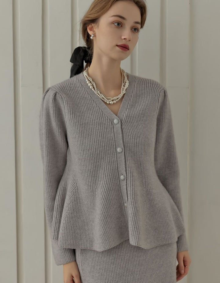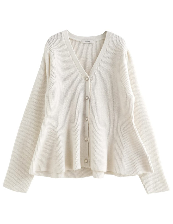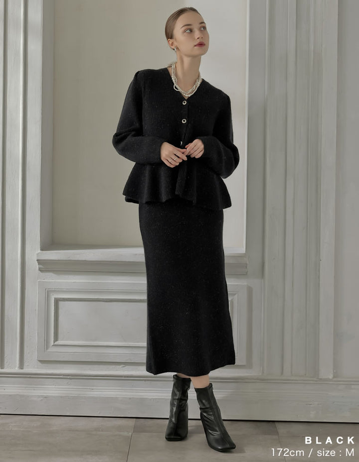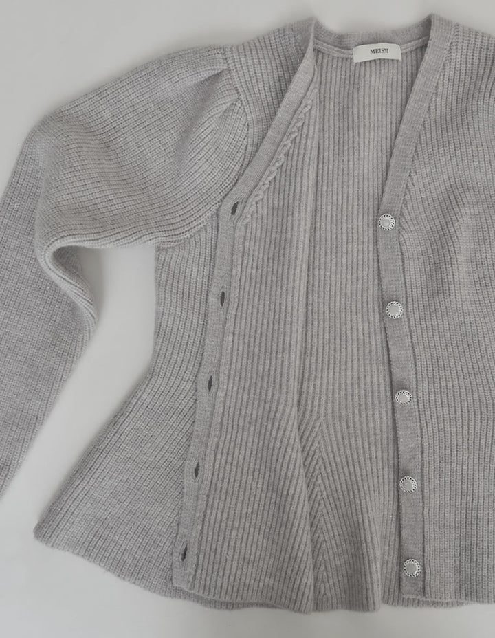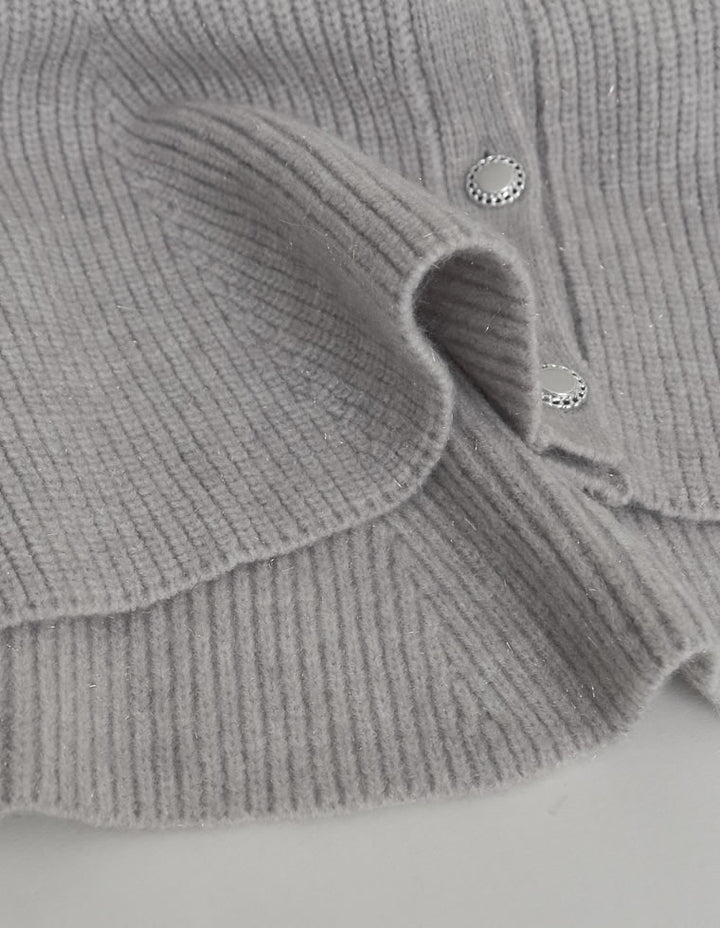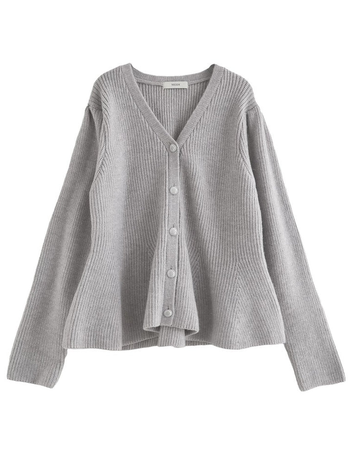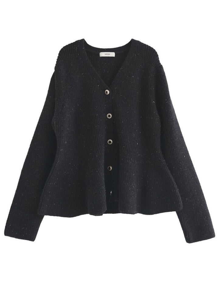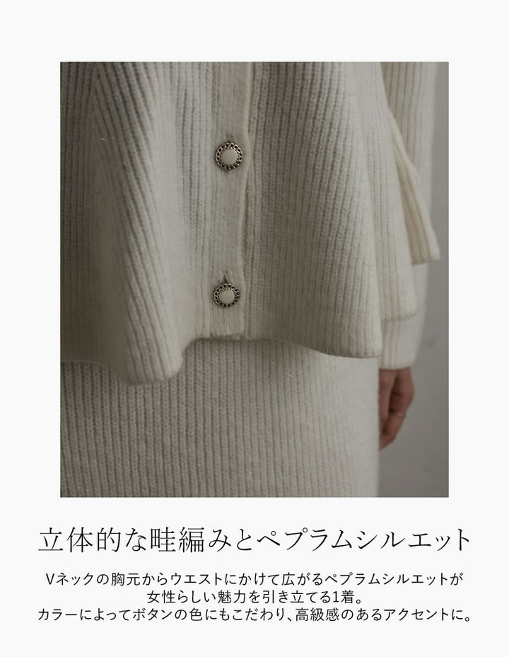 ふんわりと編み立てた畦編みニットに、繊細なラメ糸を織り込んだペプラムカーディガン。表情豊かな畦編みが立体感を演出し、上品な光沢を放つラメが顔まわりを華やかに彩ります。Vネックの胸元からウエストにかけて広がるペプラムシルエットが、女性らしい魅力を引き立てる一着。前立て部分には自然なドレープが生まれるよう設計されており、着るだけでメリハリのあるスタイルが完成します。ボタンの色にもこだわり、ブラック・ホワイトにはシャンパンゴールド、グレーにはシルバー縁のボタンを採用。立体的な畦編みとペプラムシルエットが生み出す華やかさが、MEISMらしいエレガンスを漂わせます。