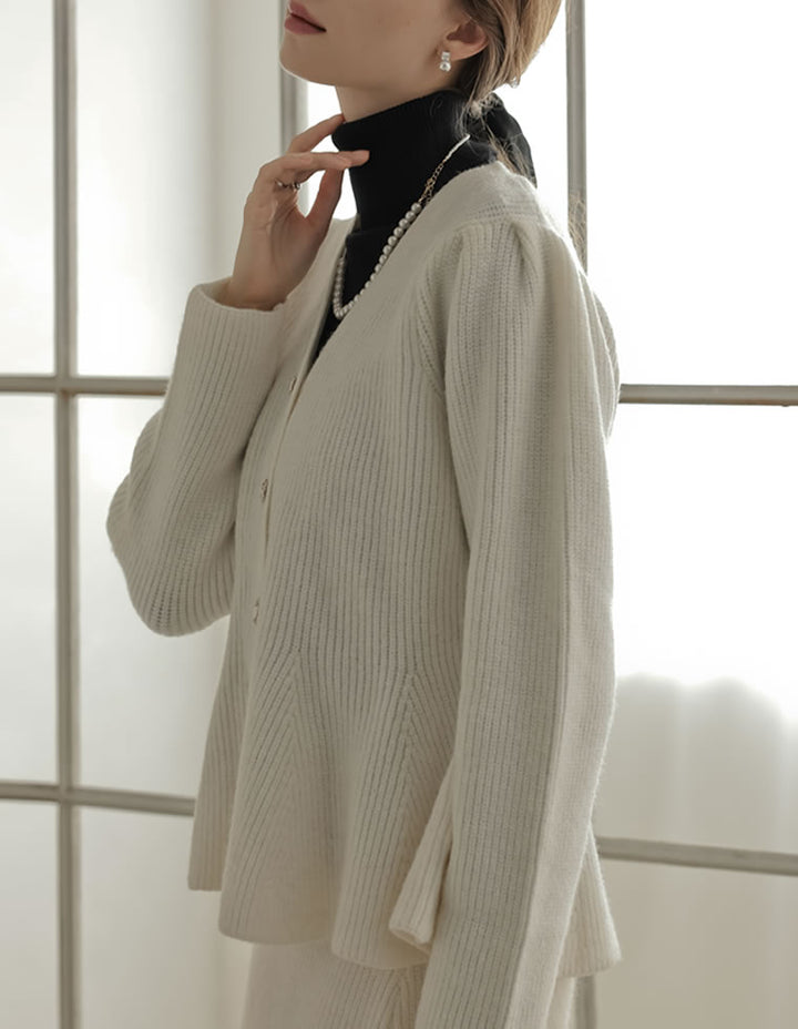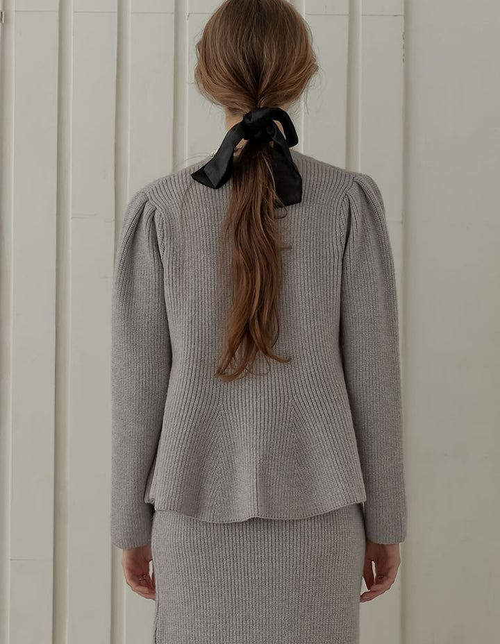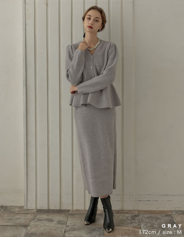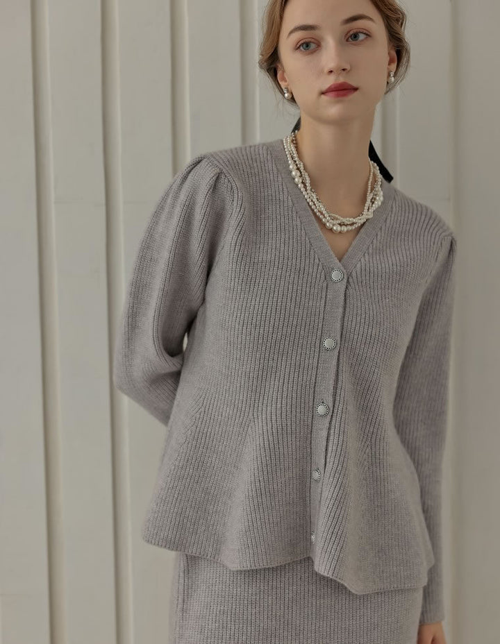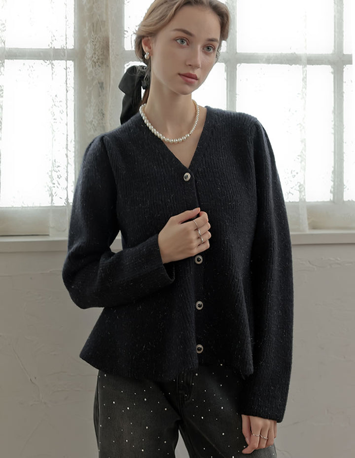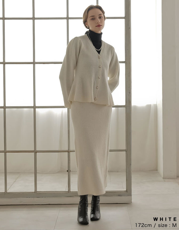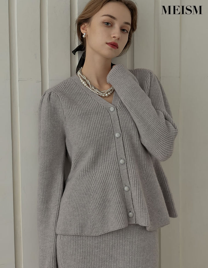 ふんわりと編み立てた畦編みニットに、繊細なラメ糸を織り込んだペプラムカーディガン。表情豊かな畦編みが立体感を演出し、上品な光沢を放つラメが顔まわりを華やかに彩ります。Vネックの胸元からウエストにかけて広がるペプラムシルエットが、女性らしい魅力を引き立てる一着。前立て部分には自然なドレープが生まれるよう設計されており、着るだけでメリハリのあるスタイルが完成します。ボタンの色にもこだわり、ブラック・ホワイトにはシャンパンゴールド、グレーにはシルバー縁のボタンを採用。立体的な畦編みとペプラムシルエットが生み出す華やかさが、MEISMらしいエレガンスを漂わせます。