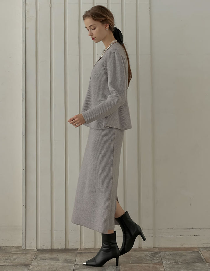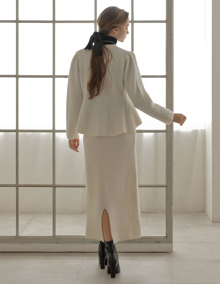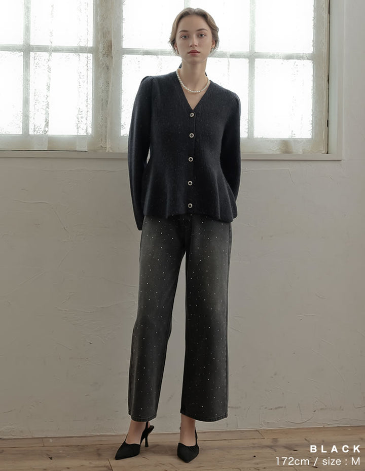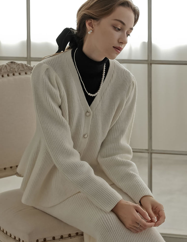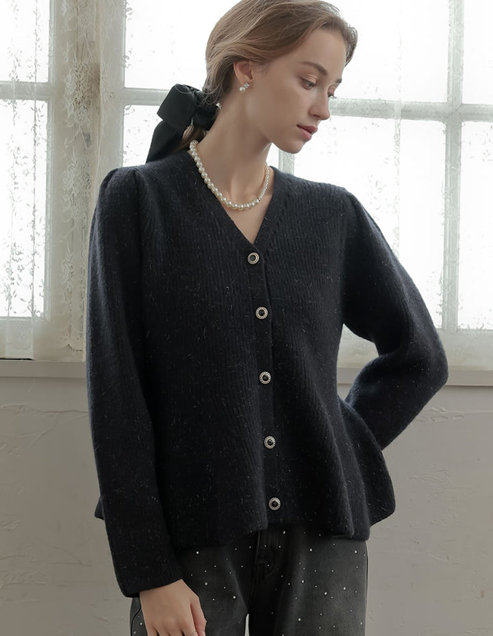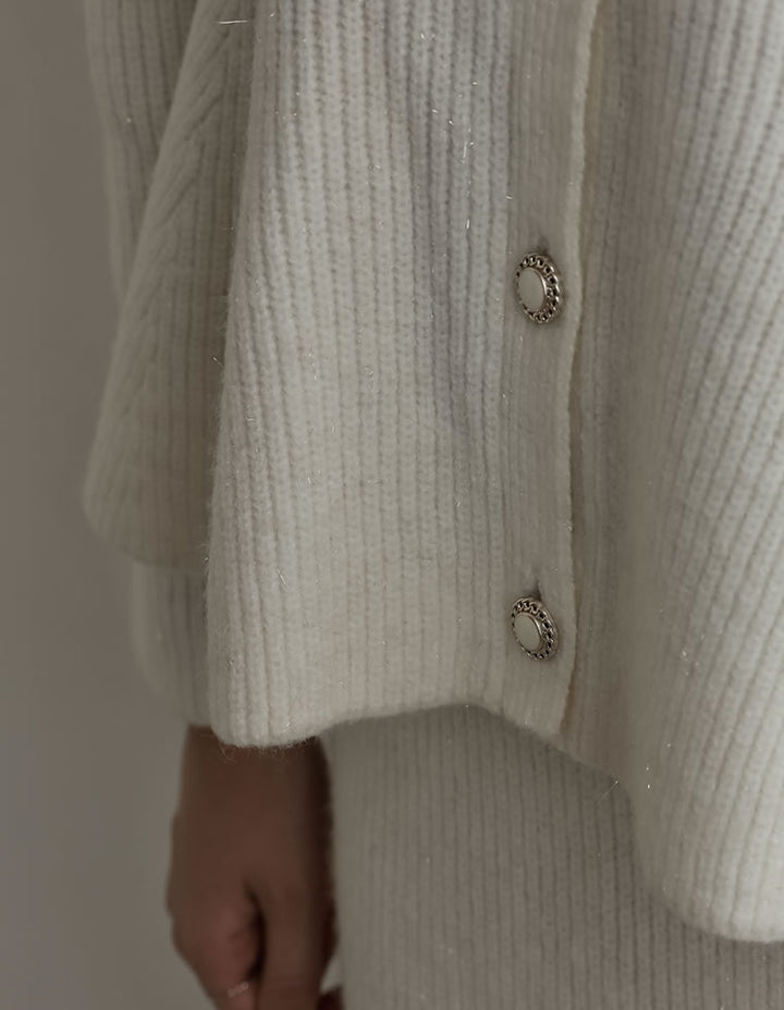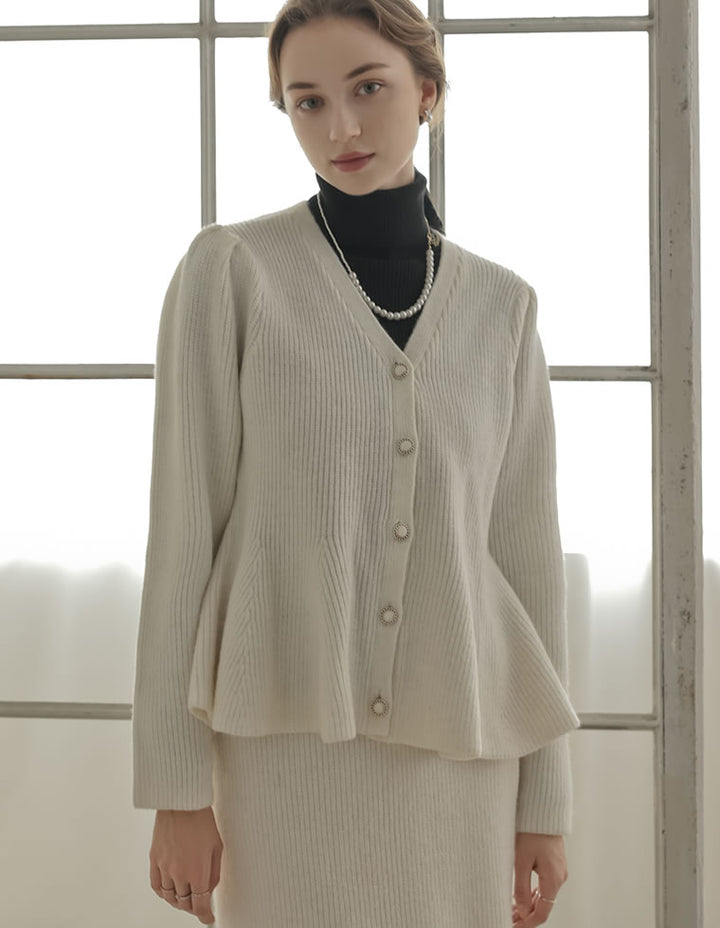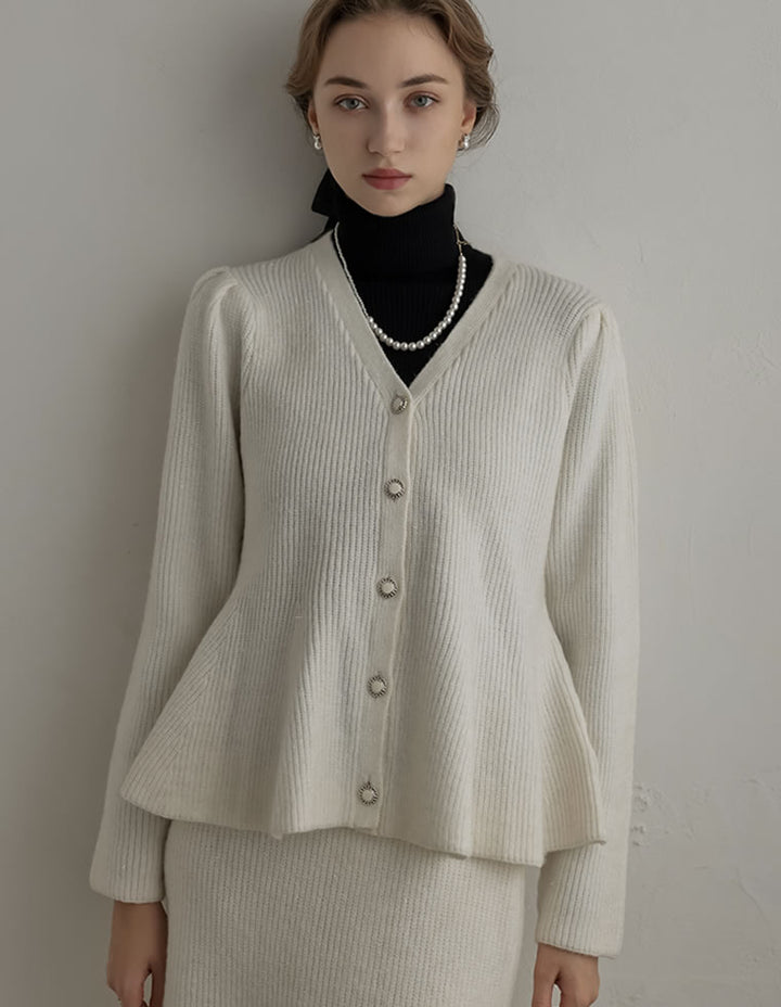 ふんわりと編み立てた畦編みニットに、繊細なラメ糸を織り込んだペプラムカーディガン。表情豊かな畦編みが立体感を演出し、上品な光沢を放つラメが顔まわりを華やかに彩ります。Vネックの胸元からウエストにかけて広がるペプラムシルエットが、女性らしい魅力を引き立てる一着。前立て部分には自然なドレープが生まれるよう設計されており、着るだけでメリハリのあるスタイルが完成します。ボタンの色にもこだわり、ブラック・ホワイトにはシャンパンゴールド、グレーにはシルバー縁のボタンを採用。立体的な畦編みとペプラムシルエットが生み出す華やかさが、MEISMらしいエレガンスを漂わせます。