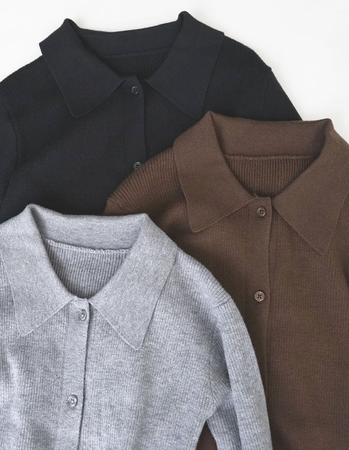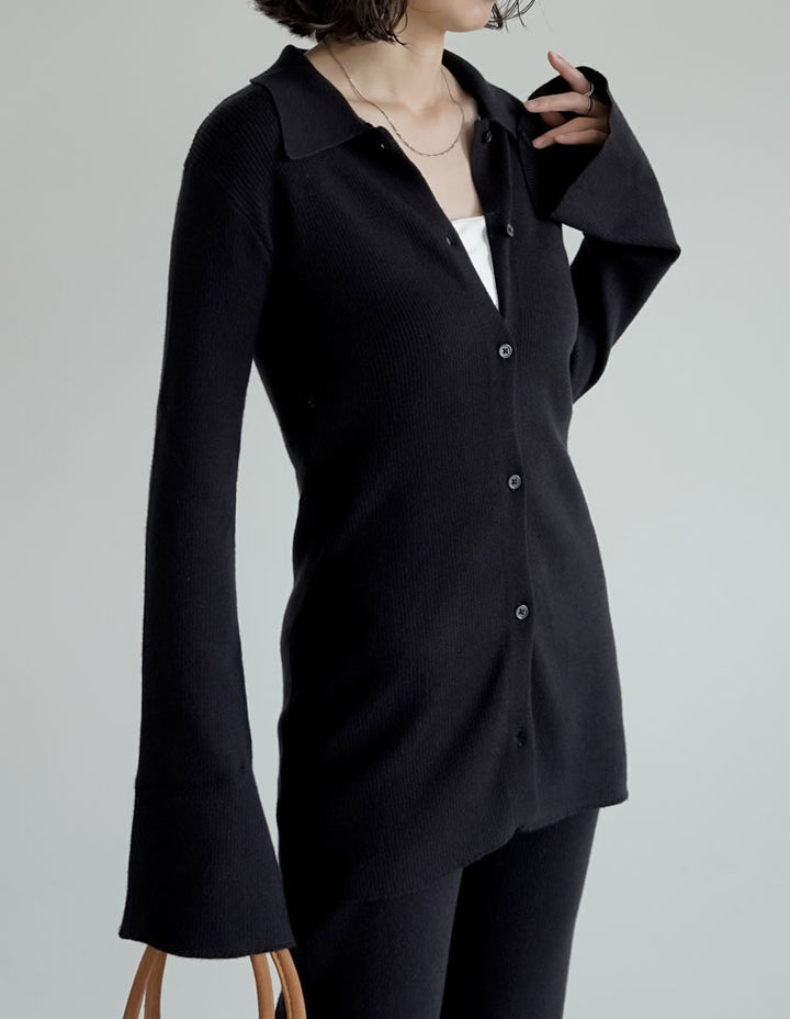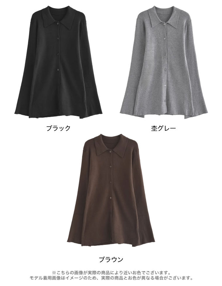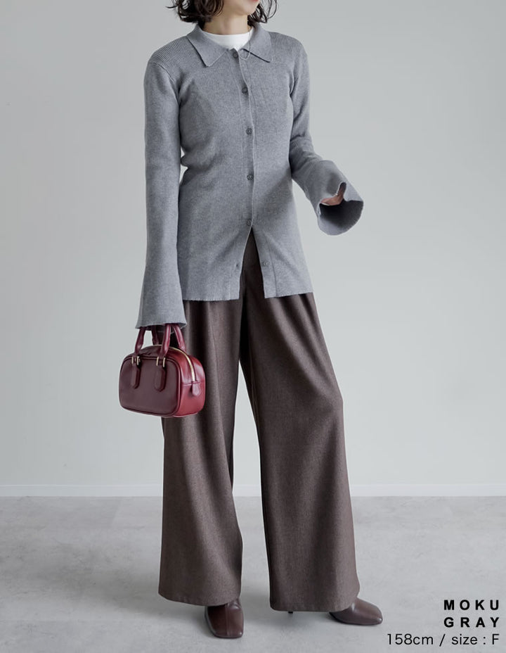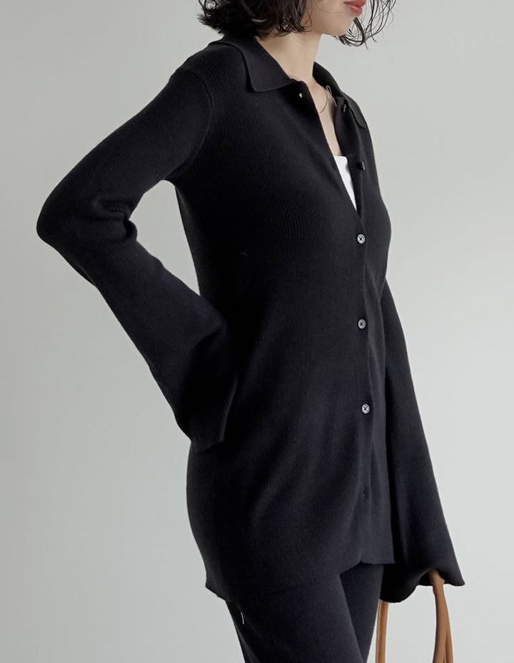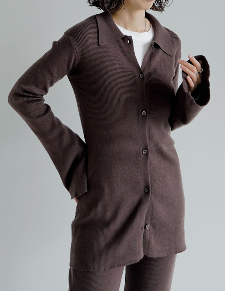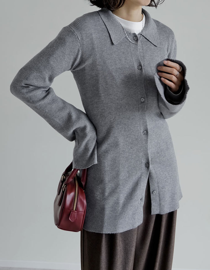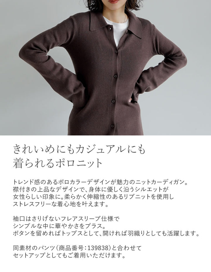 トレンド感のあるポロカラーデザインが魅力のニットカーディガン。襟付きの上品なデザインで、身体に優しく沿うシルエットが女性らしい印象に。柔らかく伸縮性のあるリブニットを使用し、ストレスフリーな着心地を叶えます。程よいフィット感で、きれいめにもカジュアルにも着こなせる万能アイテムです。袖口はさりげないフレアスリーブ仕様で、シンプルな中に華やかさをプラス。ボタンを留めればトップスとして、開ければ羽織りとしても活躍します。フォルム感のあるボトムや、同素材のニットパンツとのセットアップコーデもおすすめです。