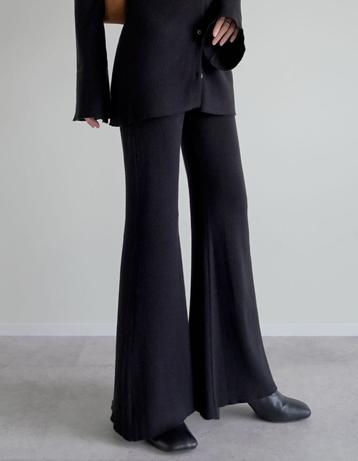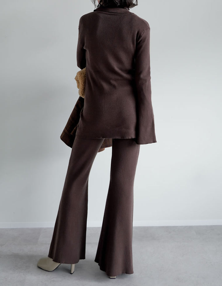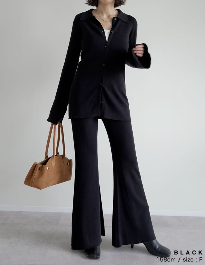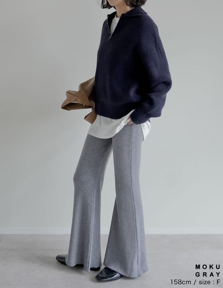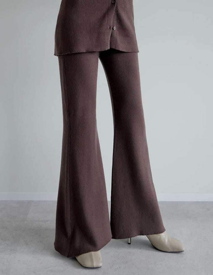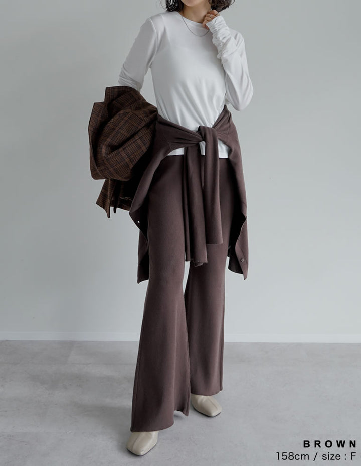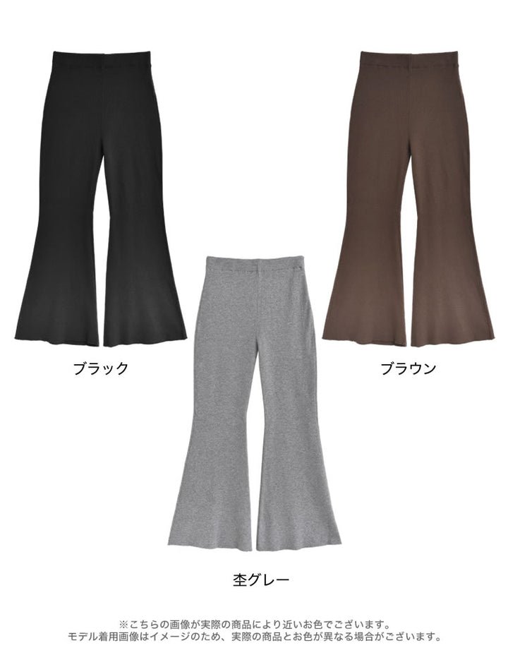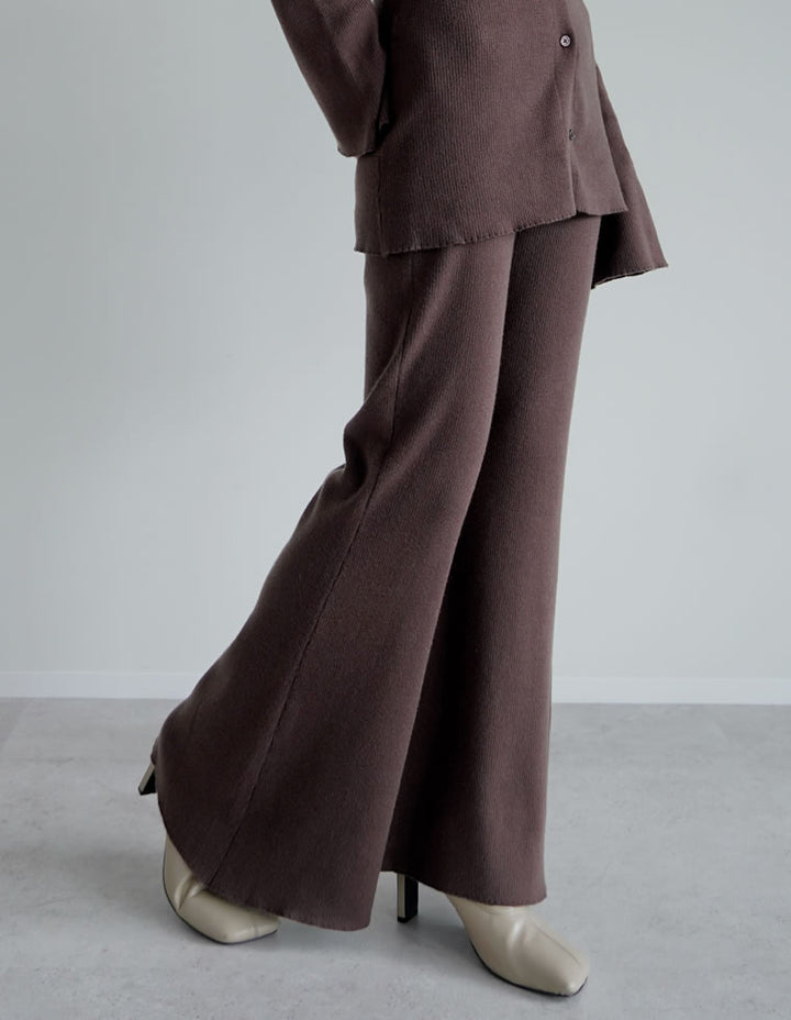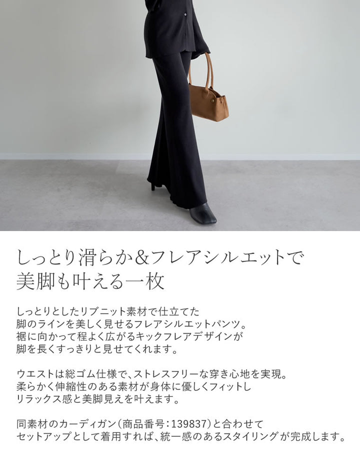 しっとりとしたリブニット素材で仕立てた、脚のラインを美しく見せるフレアシルエットパンツ。裾に向かって程よく広がるキックフレアデザインが、脚を長くすっきりと見せてくれます。ウエストは総ゴム仕様で、ストレスフリーな穿き心地を実現。柔らかく伸縮性のある素材が身体に優しくフィットし、リラックス感と美脚見えを叶えます。同素材のカーディガン(商品番号:139837)と合わせてセットアップとして着用すれば、統一感のあるスタイリングが完成。カジュアルからきれいめまで幅広いスタイルに馴染む、デイリーに活躍するニットパンツです。