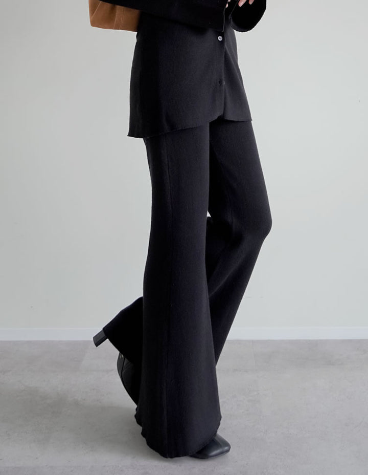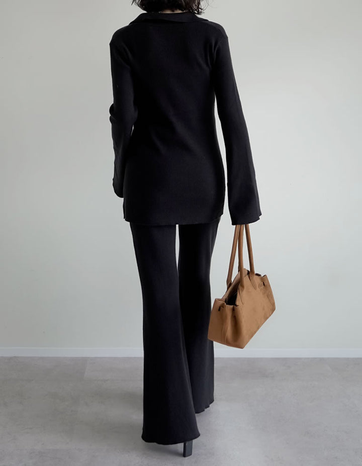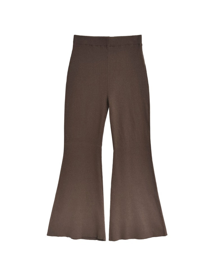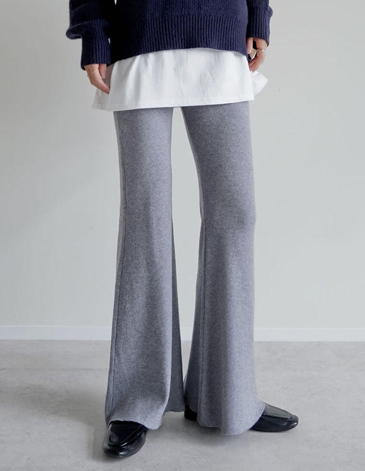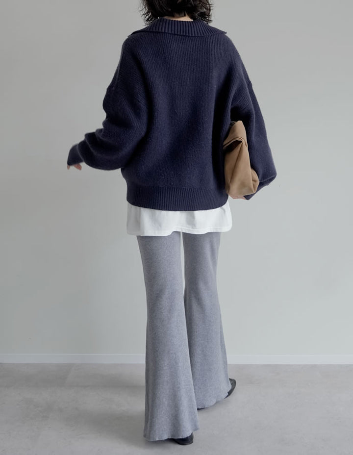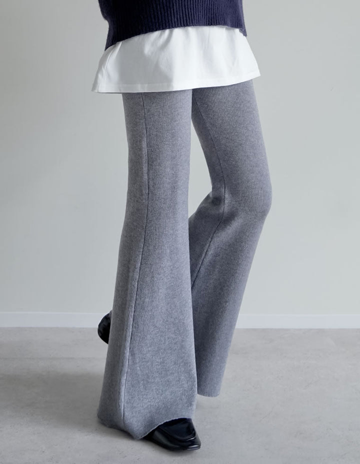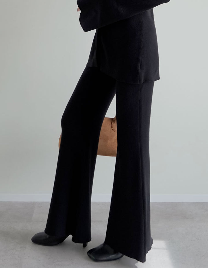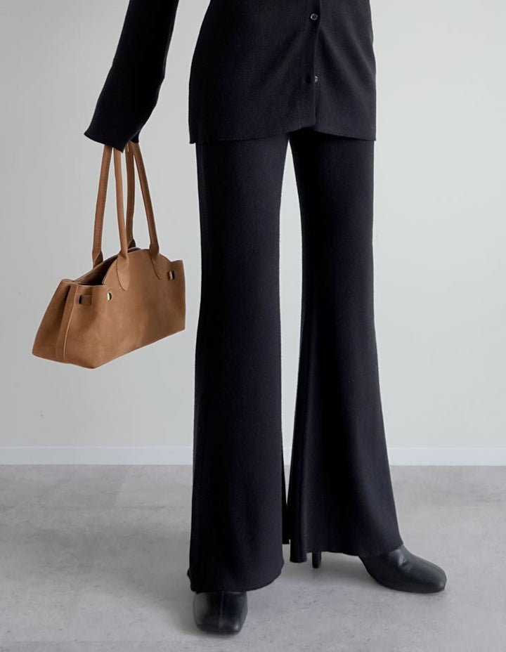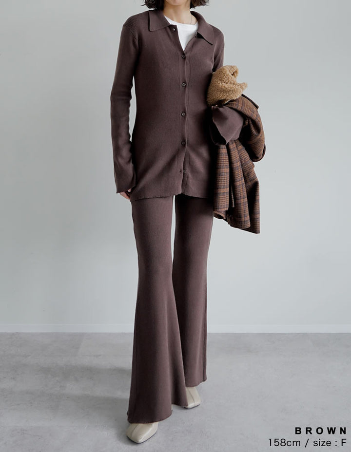 しっとりとしたリブニット素材で仕立てた、脚のラインを美しく見せるフレアシルエットパンツ。裾に向かって程よく広がるキックフレアデザインが、脚を長くすっきりと見せてくれます。ウエストは総ゴム仕様で、ストレスフリーな穿き心地を実現。柔らかく伸縮性のある素材が身体に優しくフィットし、リラックス感と美脚見えを叶えます。同素材のカーディガン(商品番号:139837)と合わせてセットアップとして着用すれば、統一感のあるスタイリングが完成。カジュアルからきれいめまで幅広いスタイルに馴染む、デイリーに活躍するニットパンツです。
