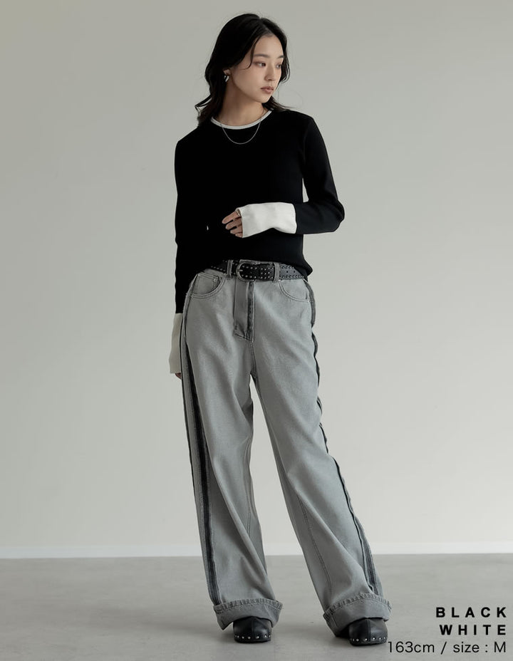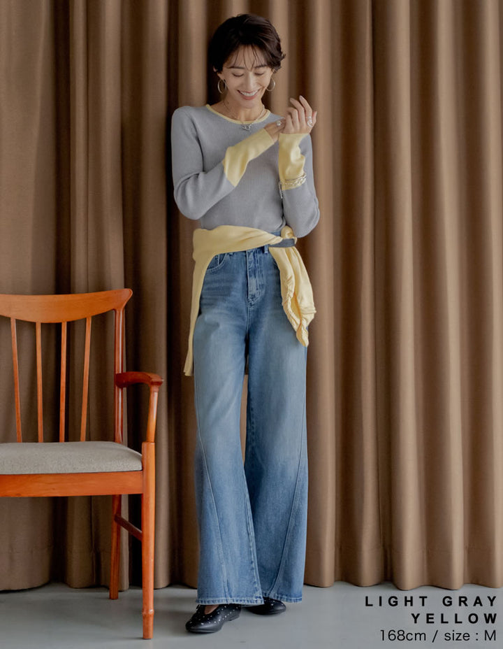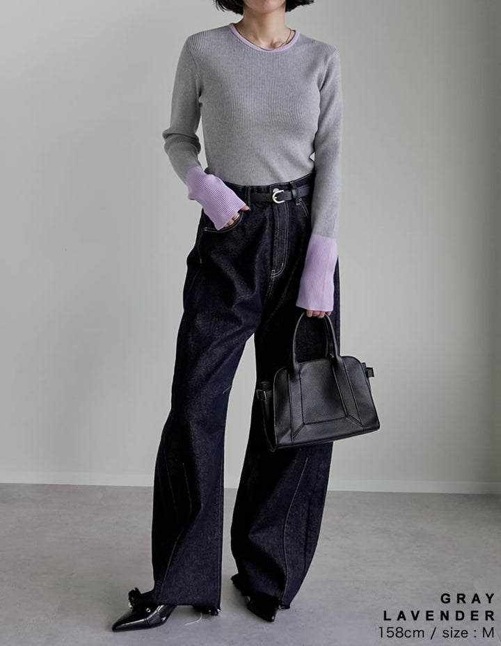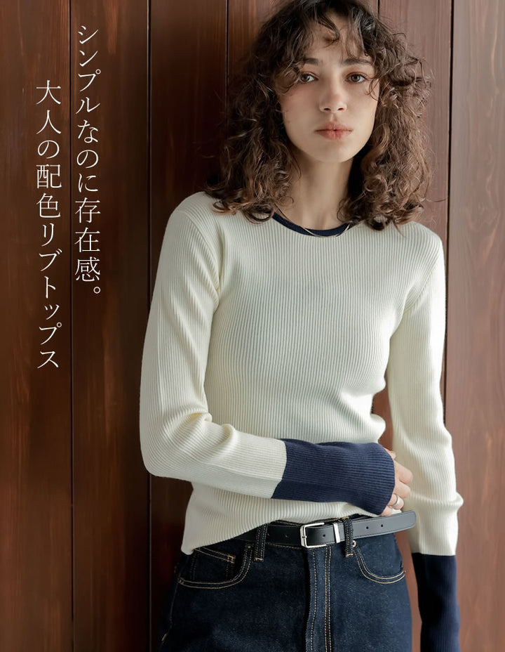 シンプルながらも配色デザインが映える、クルーネックリブニットトップス。