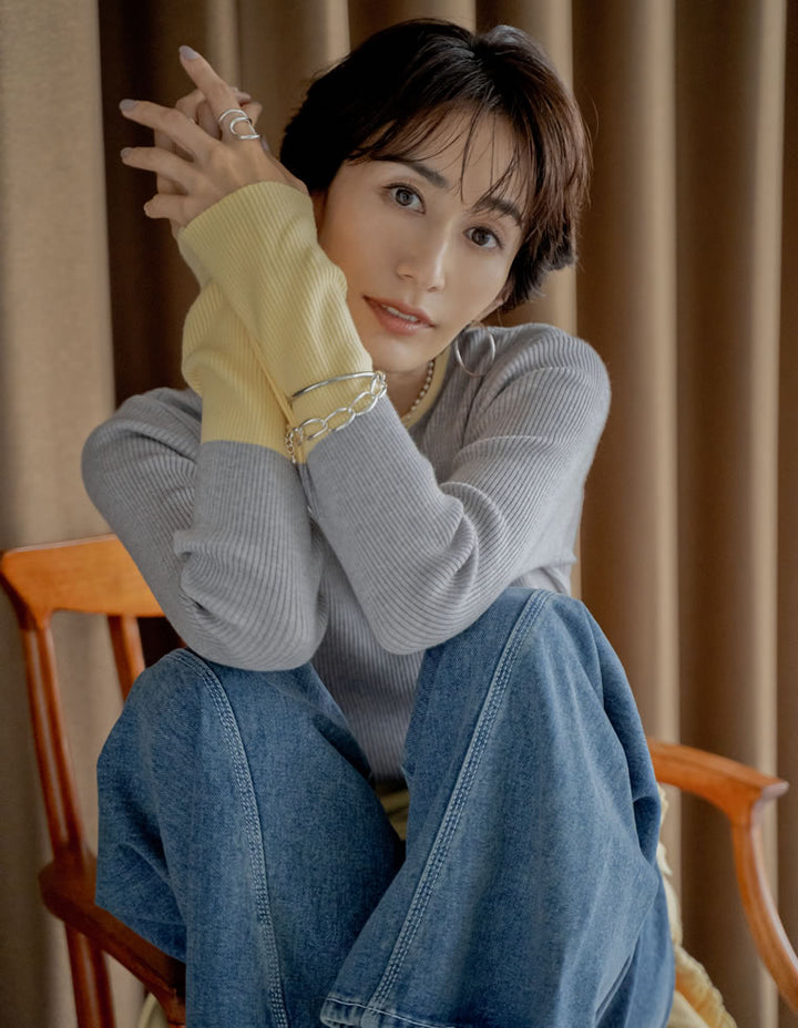 デニムやカーブパンツと合わせて、シンプルながら華やかな大人カジュアルスタイルが完成。