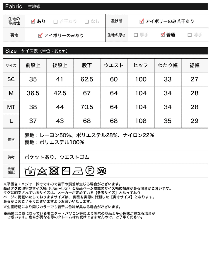 サイズ | 前股上 | 後股上 | 股下 | ウエスト | ヒップ | わたり幅 | 裾幅 |