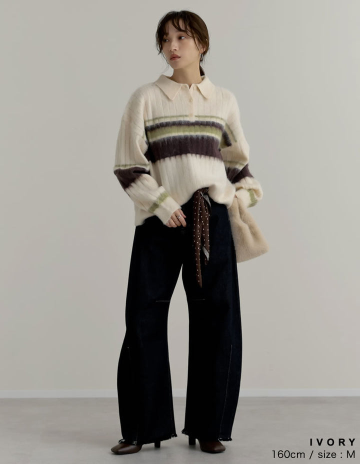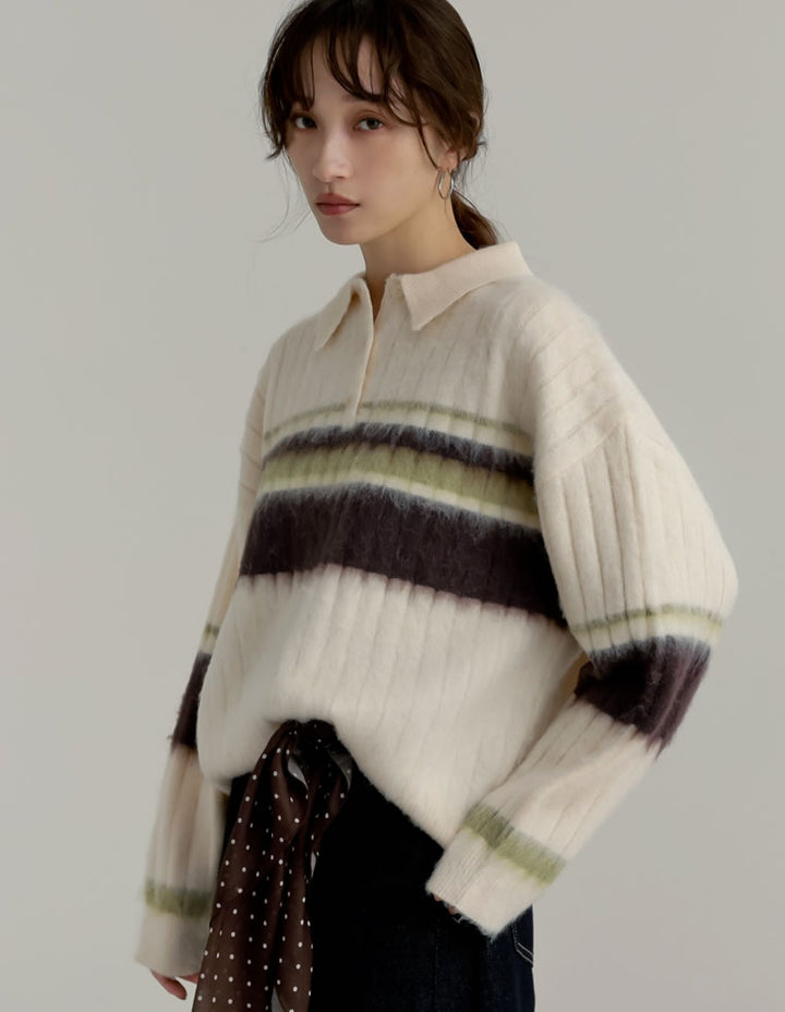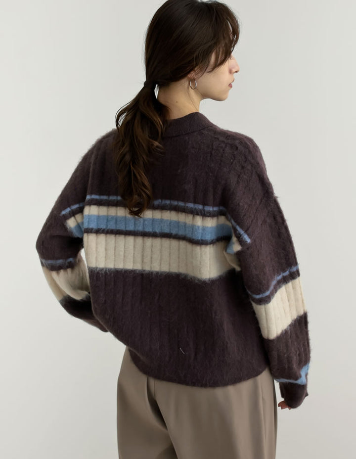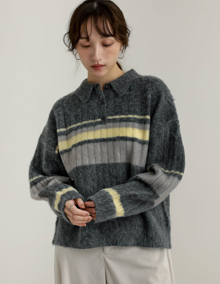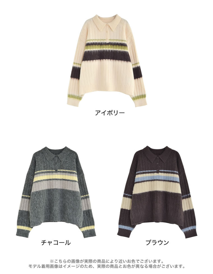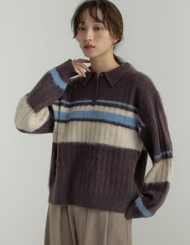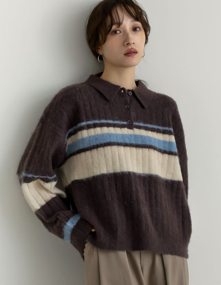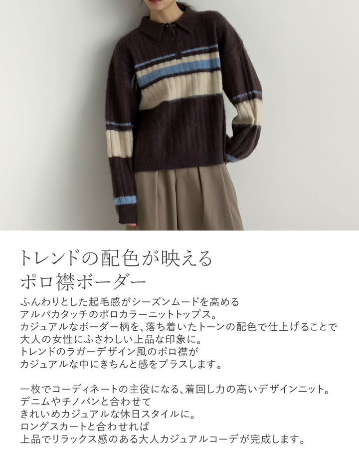 ボーダー配色アルパカタッチポロカラーニットトップス
