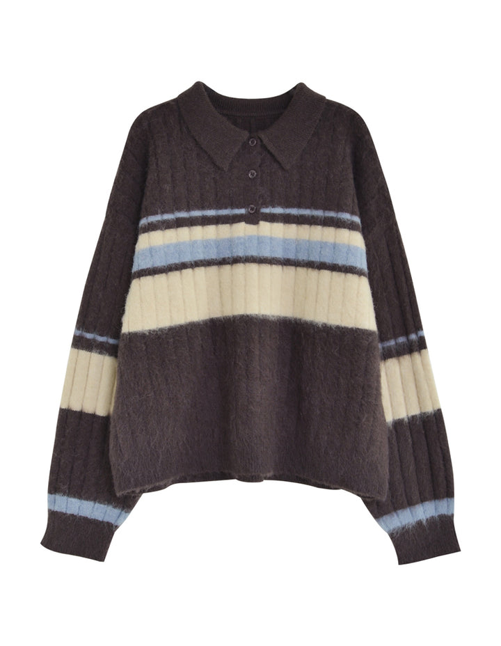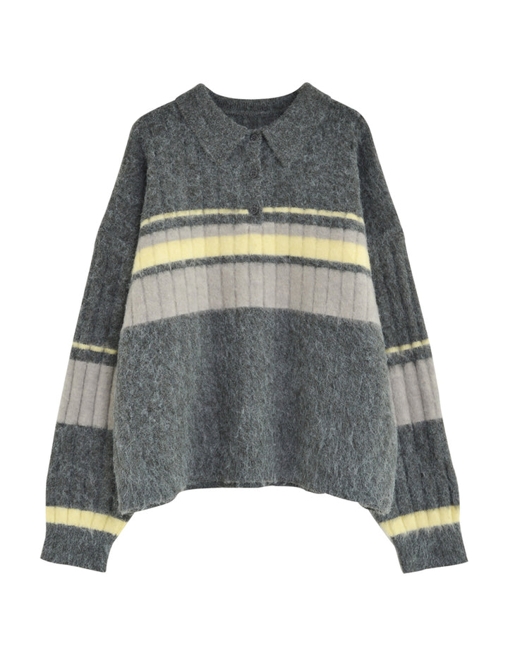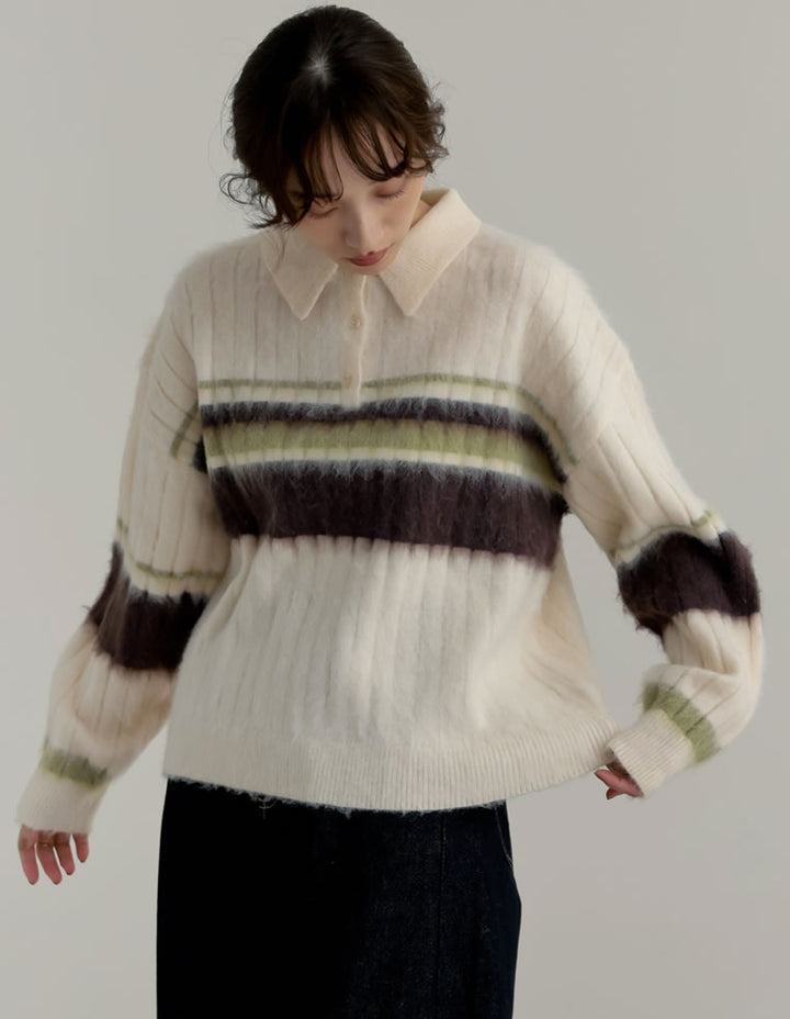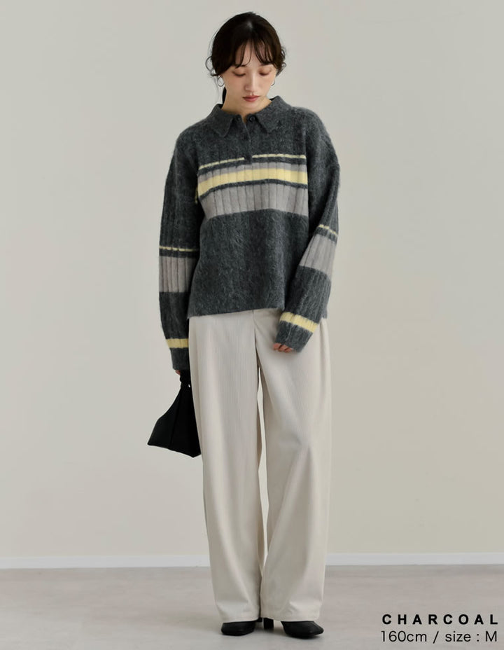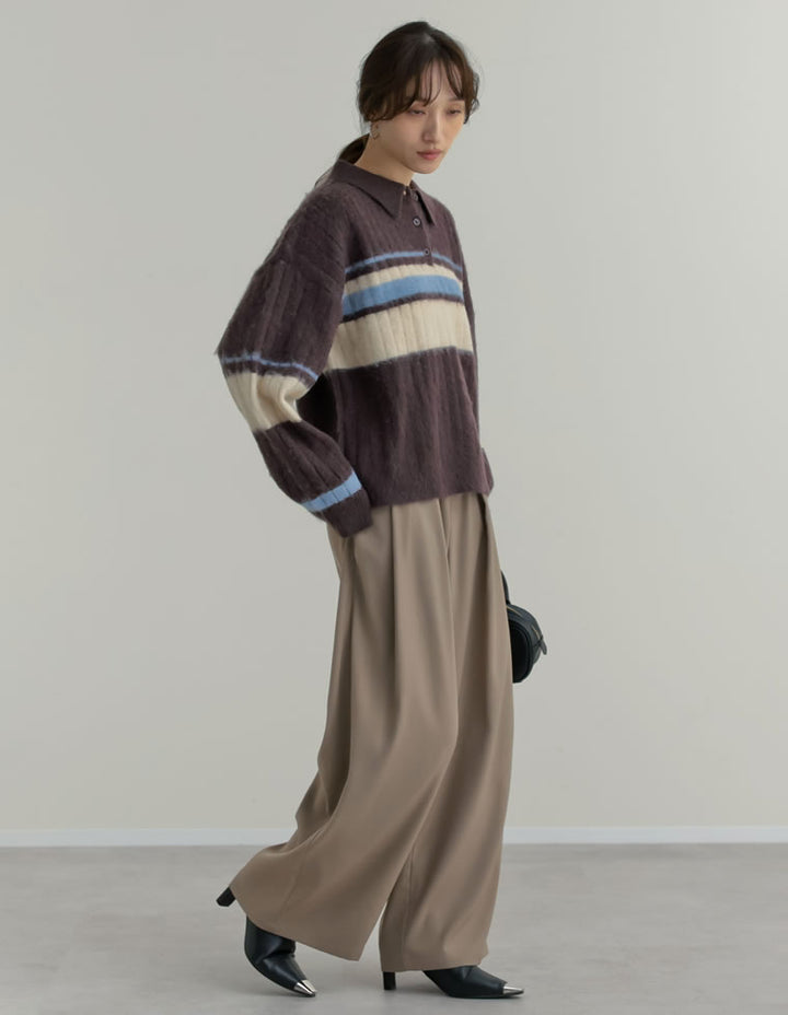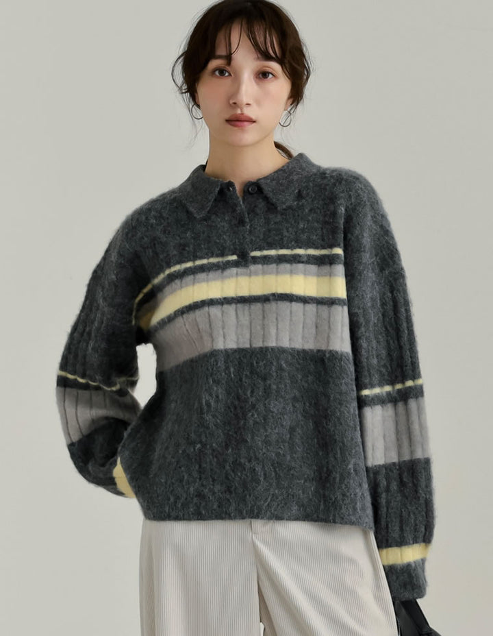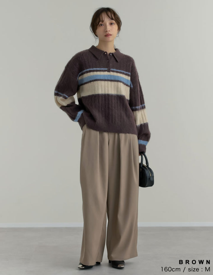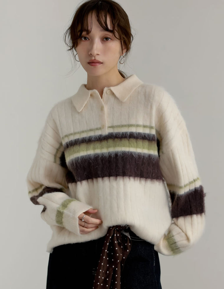 ボーダー配色アルパカタッチポロカラーニットトップス
