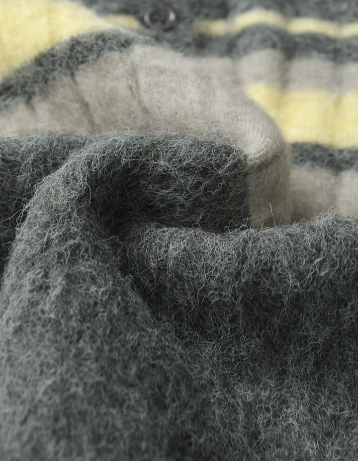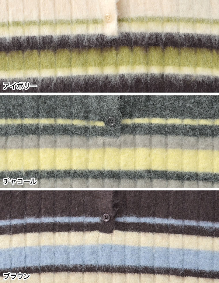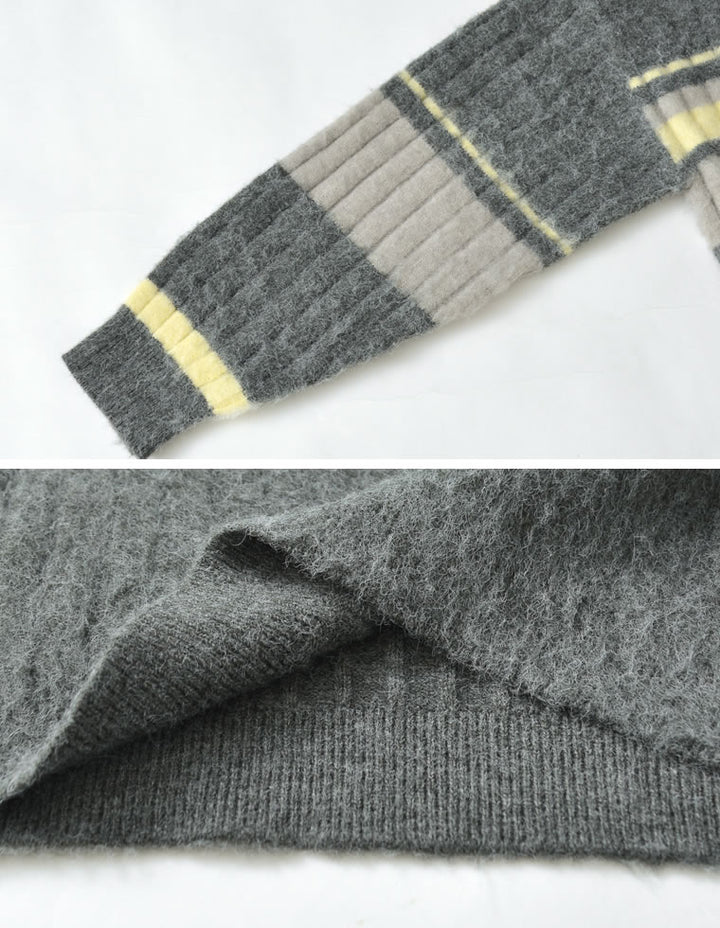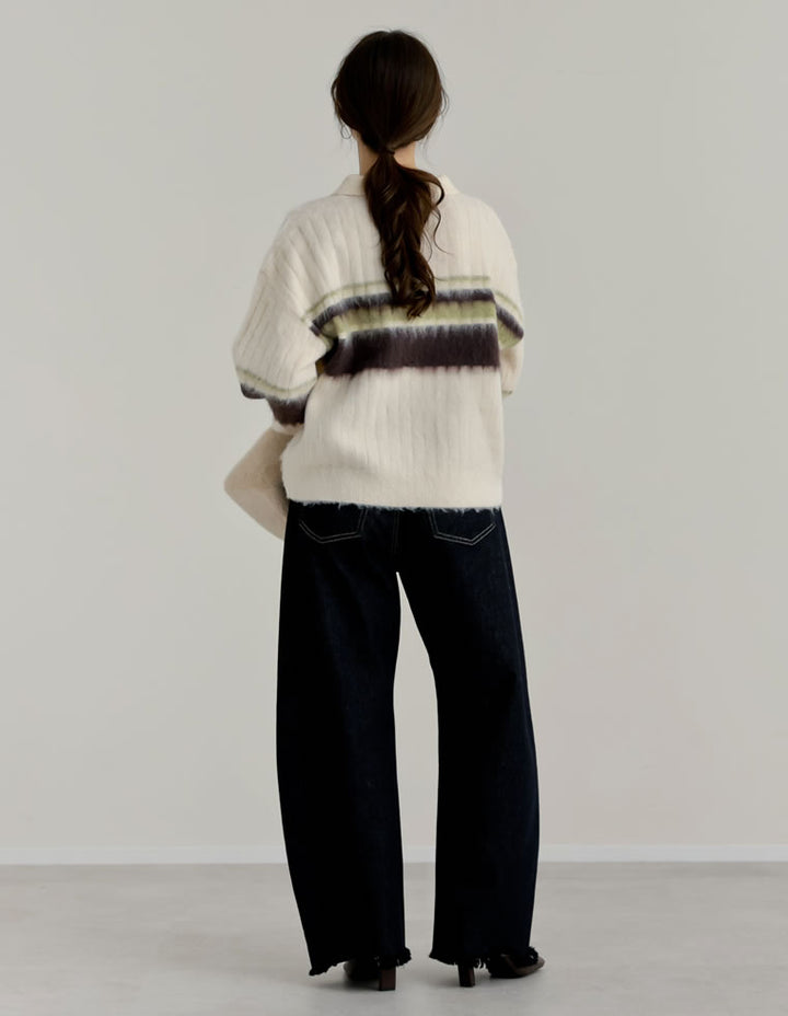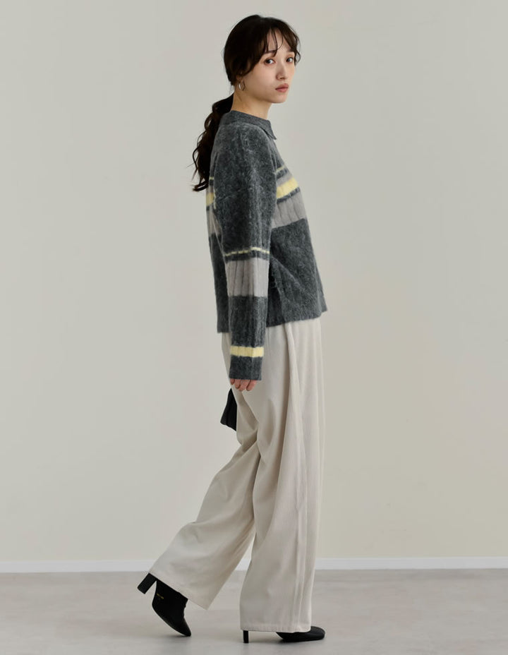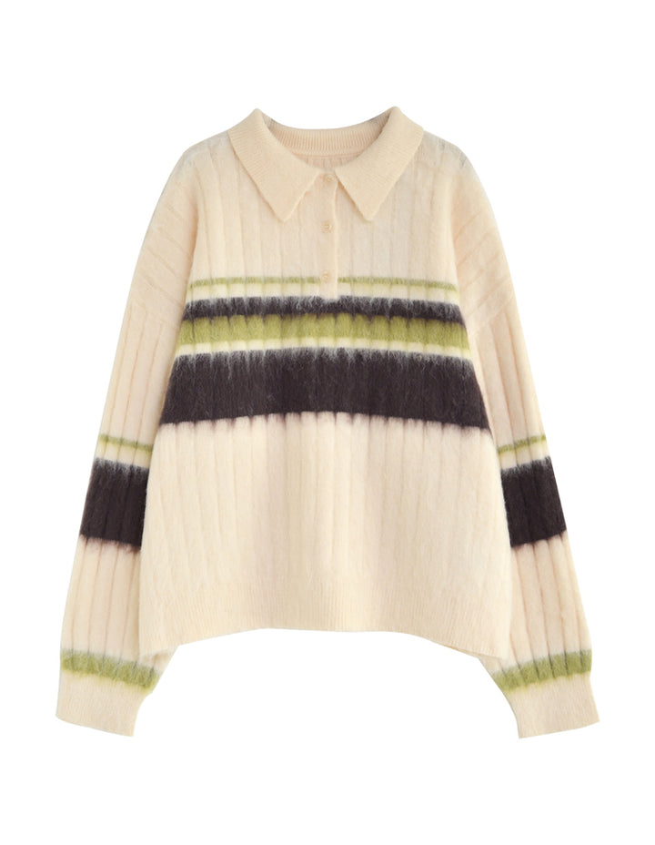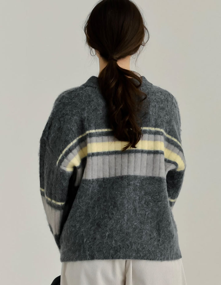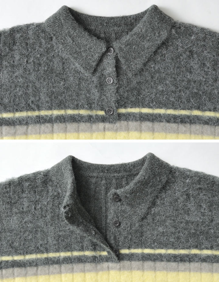 ボーダー配色アルパカタッチポロカラーニットトップス