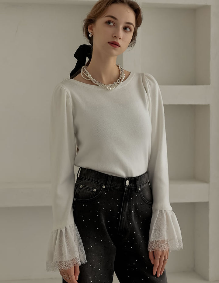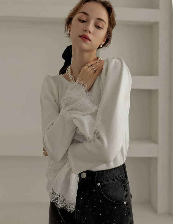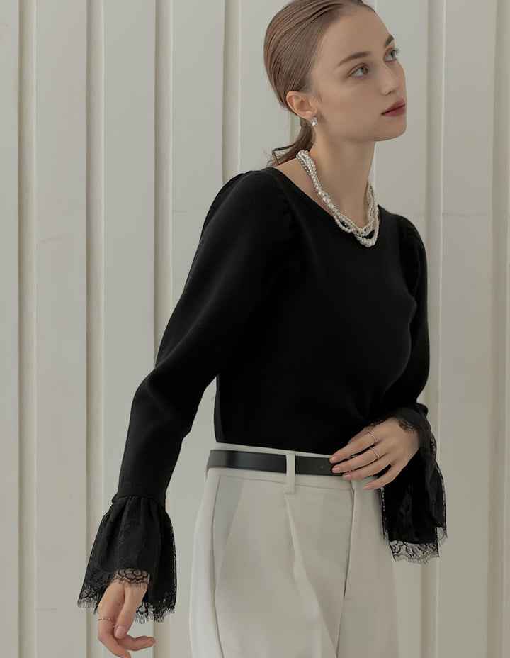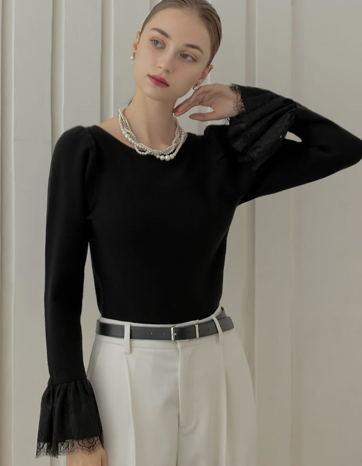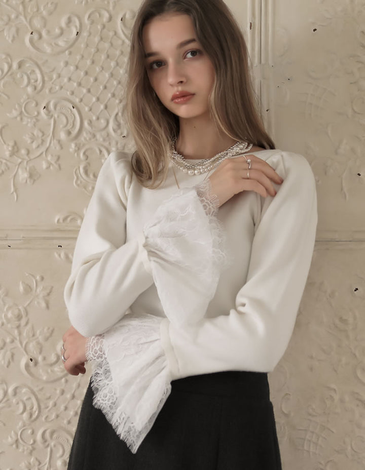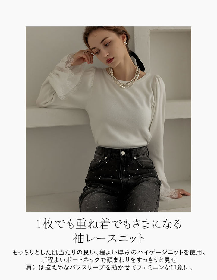 一枚で着ても存在感のあるニットですが、今季は袖口のレースをアウターから覗かせる着こなしがおすすめ。ジャケットやコートのインナーとして合わせると、袖からのぞくレースが華やかなアクセントとなり、今年らしいスタイルに。キャミワンピースやオールインワンのインナーとしても活躍し、レースフリルがエレガントなムードを演出します。デニムやスラックス、スカートなど、どんなボトムとも好相性で、きれいめにもカジュアルにも着こなせる万能な一枚です。