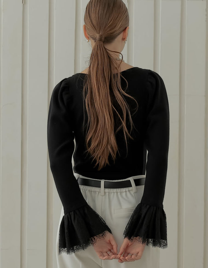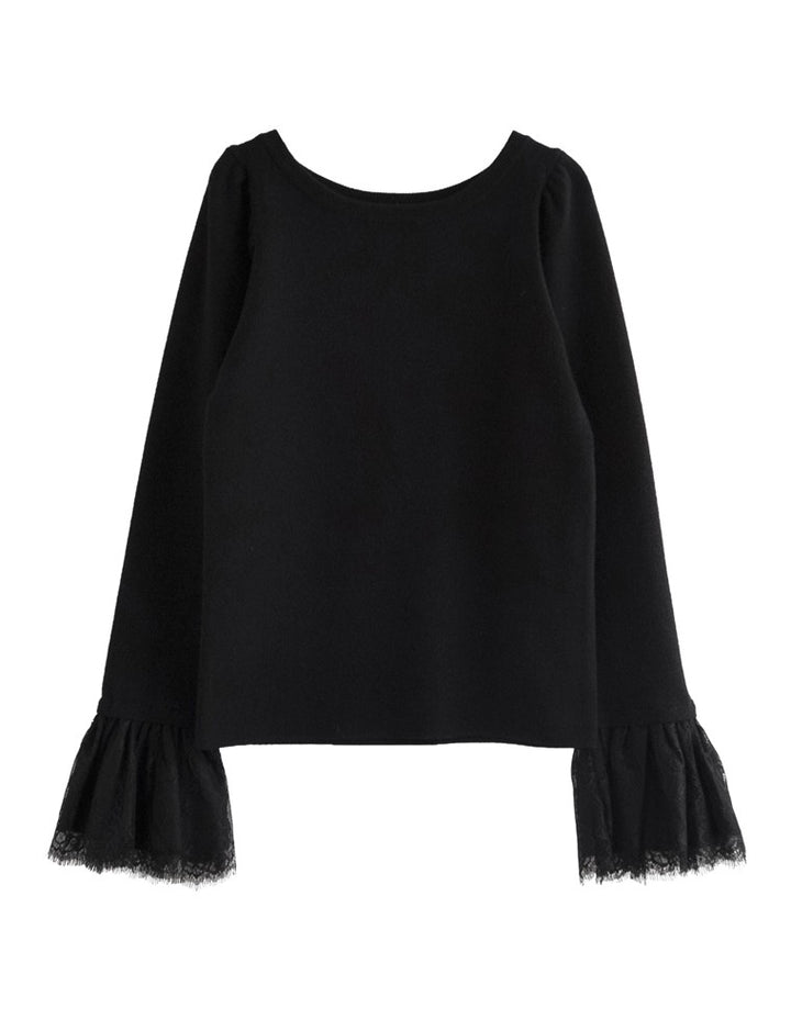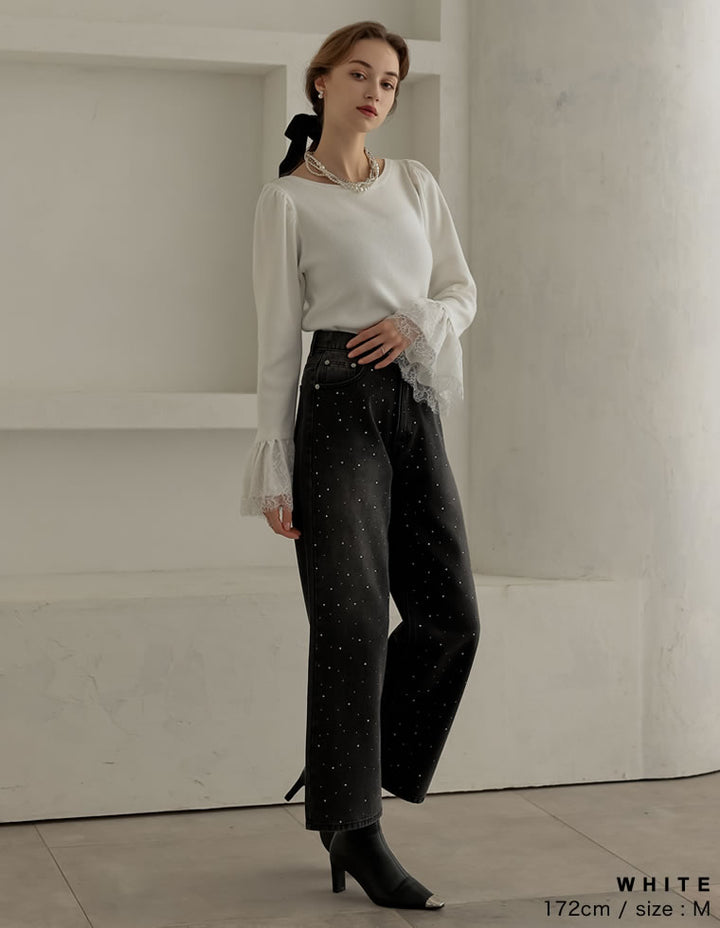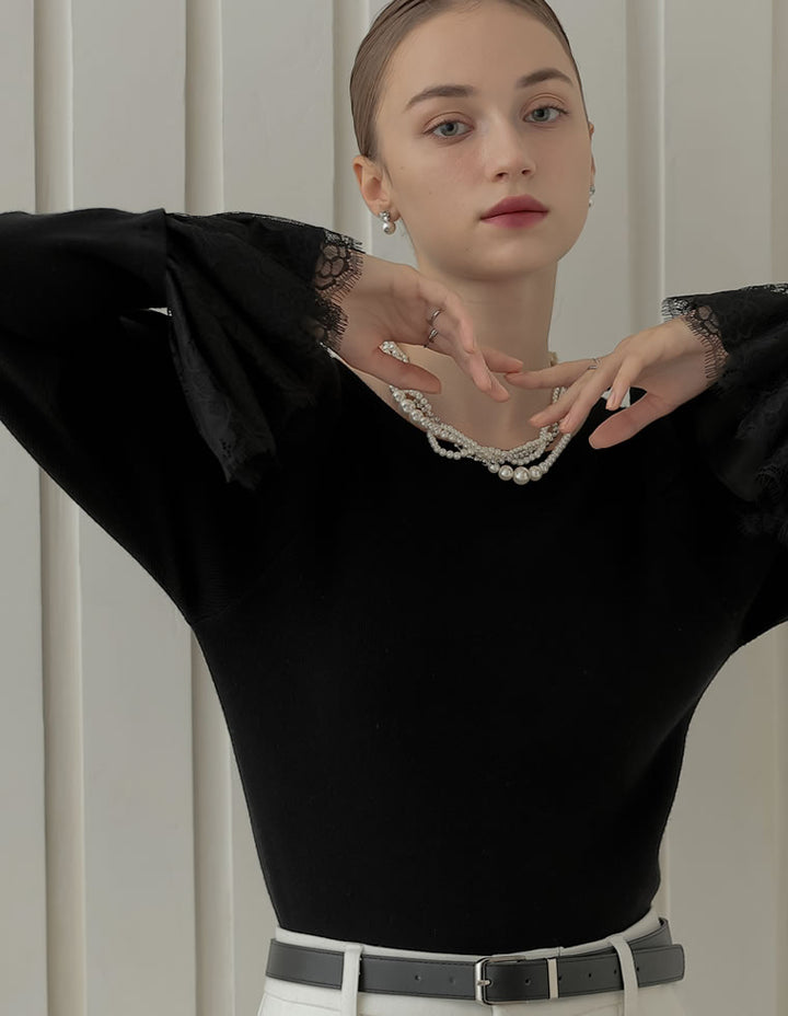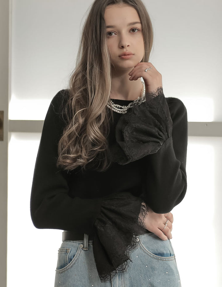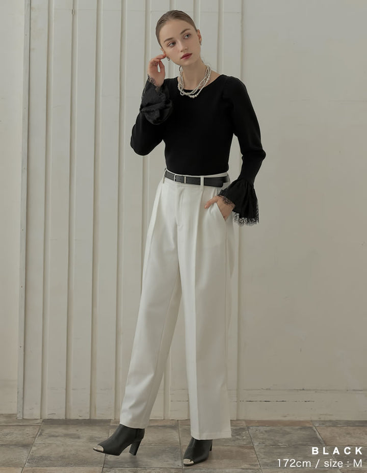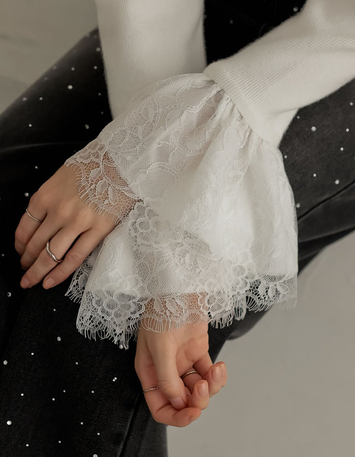 一枚で着ても存在感のあるニットですが、今季は袖口のレースをアウターから覗かせる着こなしがおすすめ。ジャケットやコートのインナーとして合わせると、袖からのぞくレースが華やかなアクセントとなり、今年らしいスタイルに。キャミワンピースやオールインワンのインナーとしても活躍し、レースフリルがエレガントなムードを演出します。デニムやスラックス、スカートなど、どんなボトムとも好相性で、きれいめにもカジュアルにも着こなせる万能な一枚です。