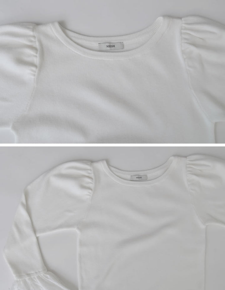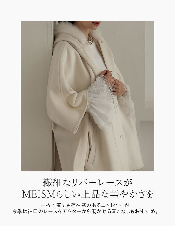 もっちりとした肌当たりの良い、程よい厚みのハイゲージニットを使用したトップス。袖に施した繊細なリバーレースが、MEISMらしい上品な華やかさを添えます。1枚ではもちろん、ベストやアウターを羽織った際にも品よく映えるデザイン。程よいボートネックで顔まわりをすっきりと見せ、肩には控えめなパフスリーブを効かせてフェミニンな印象に仕上げました。普段使いから特別なシーンまで、幅広く活躍する大人女性にぴったりのニットです。