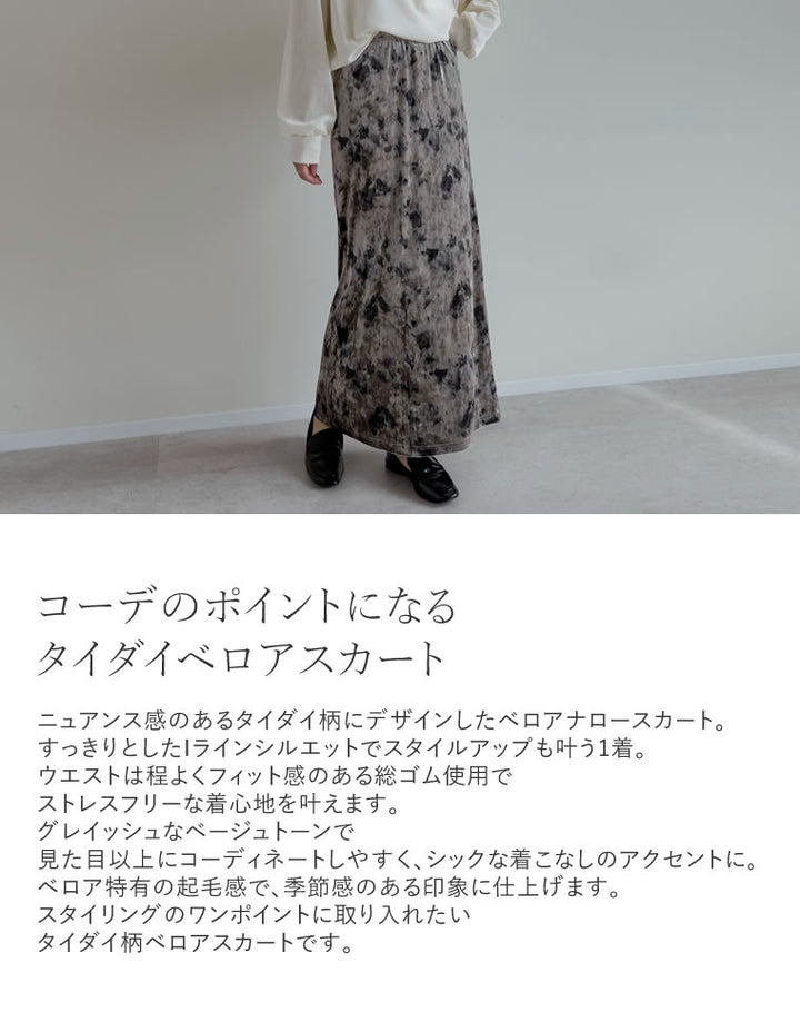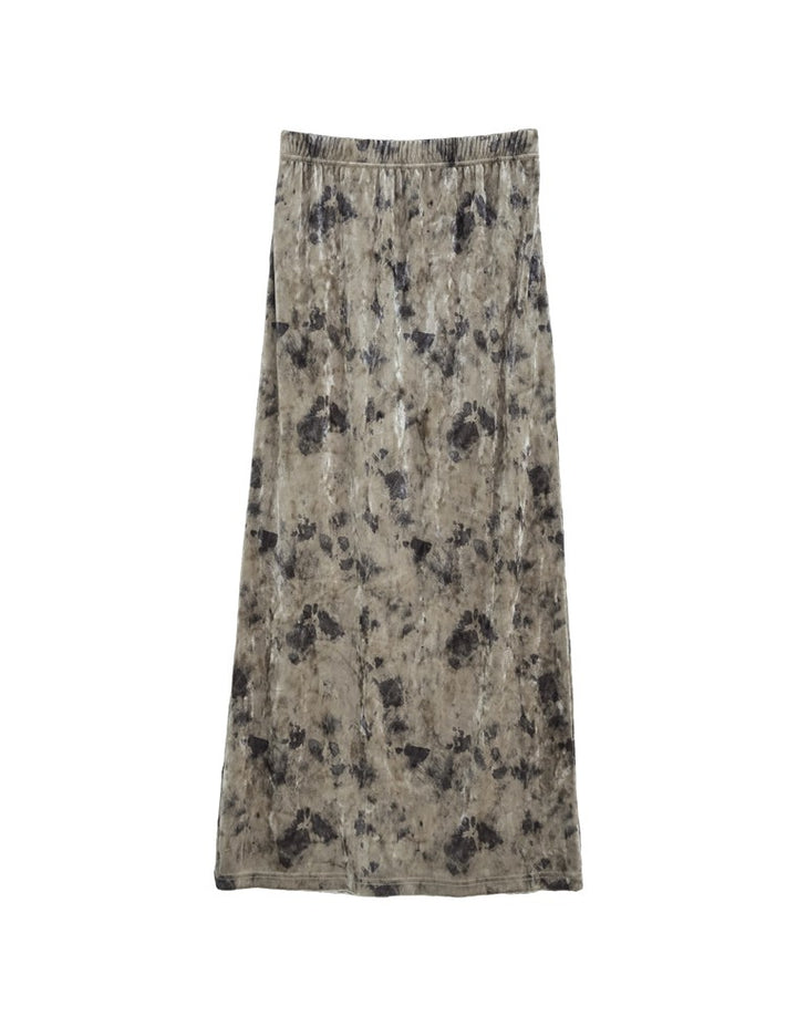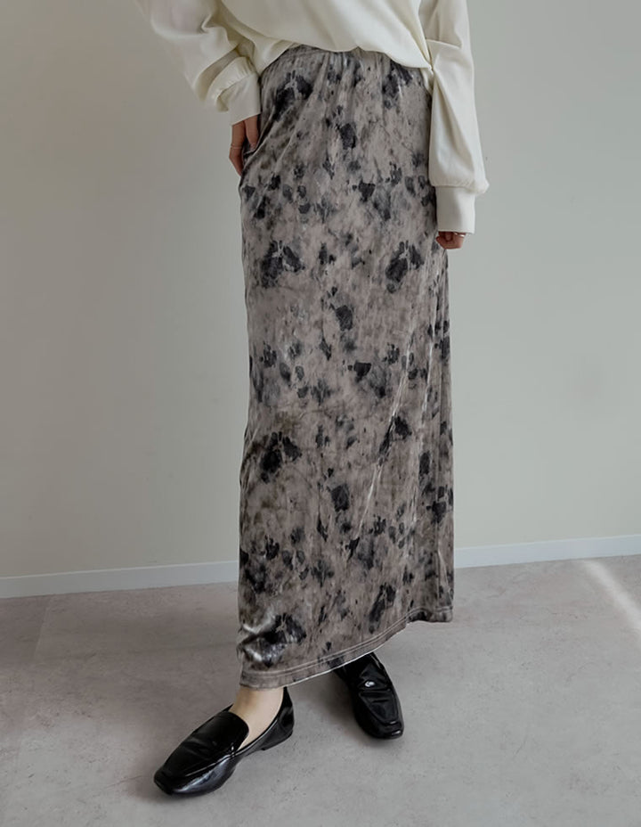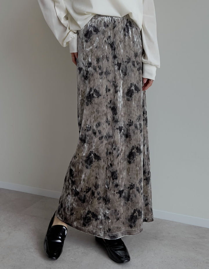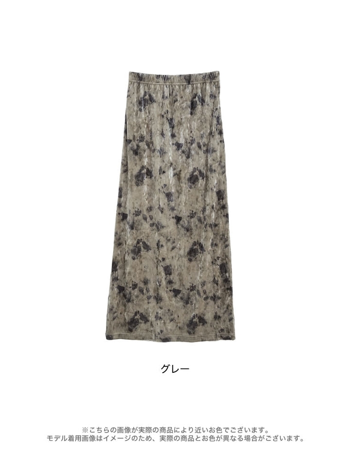 ニュアンス感のあるタイダイ柄にデザインしたベロアナロースカート。