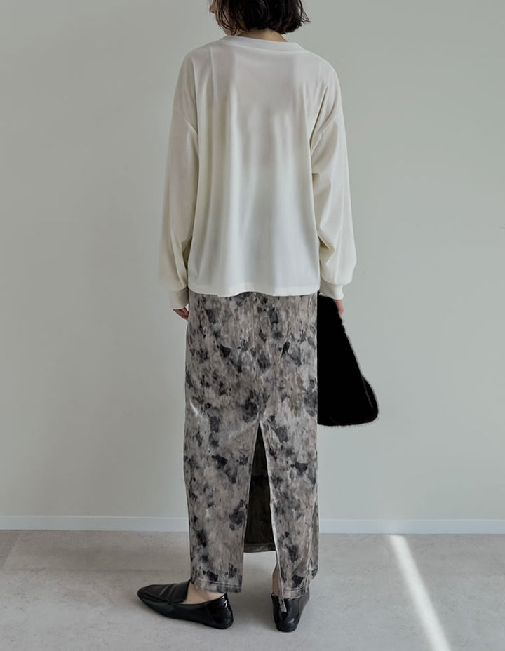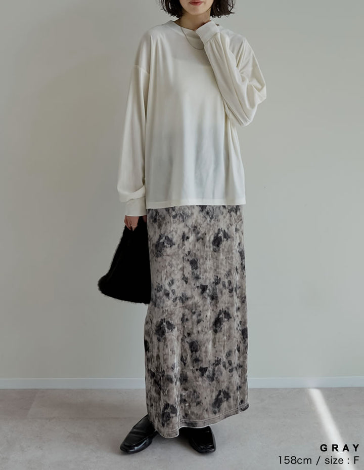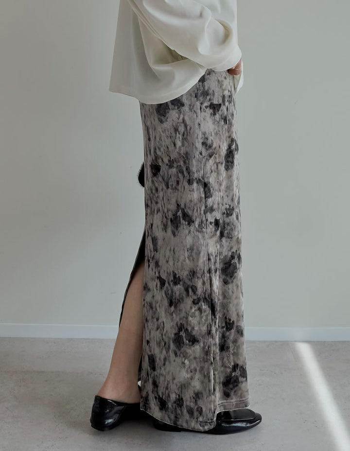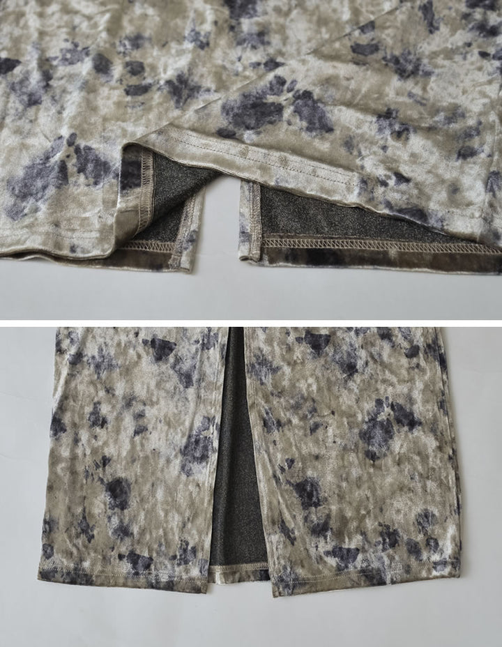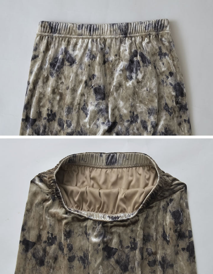 ニュアンス感のあるタイダイ柄にデザインしたベロアナロースカート。