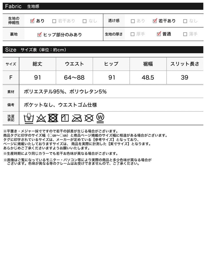 サイズ | 総丈 | ウエスト | ヒップ | 裾幅 | スリット長さ |