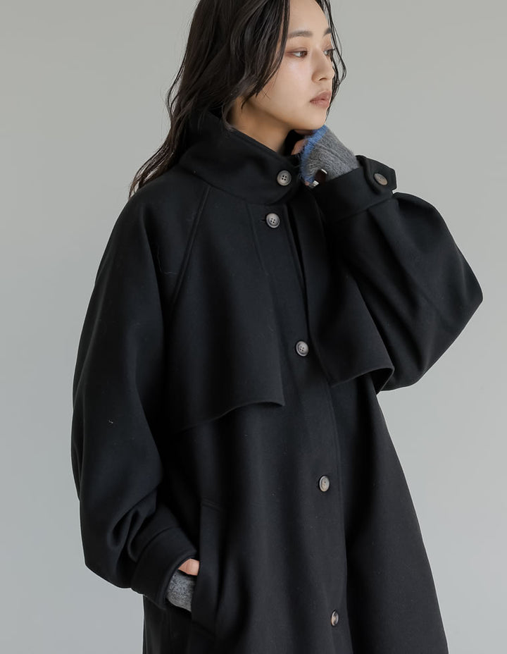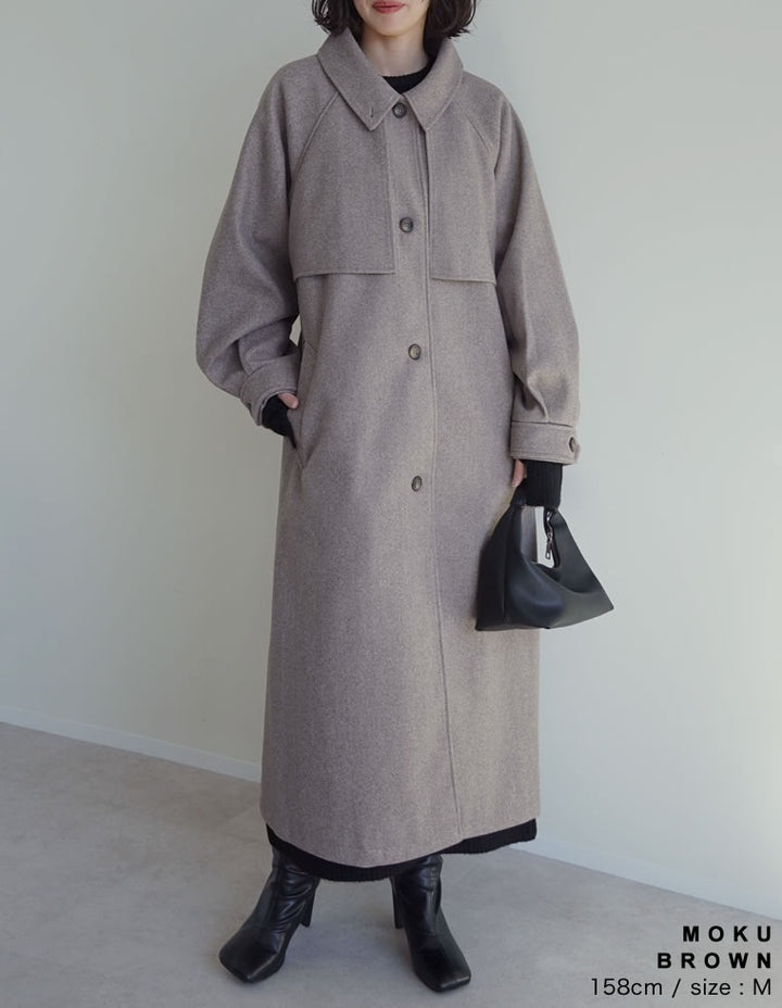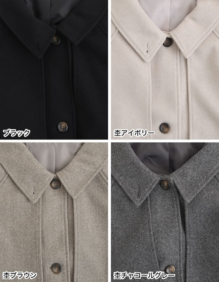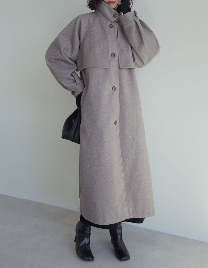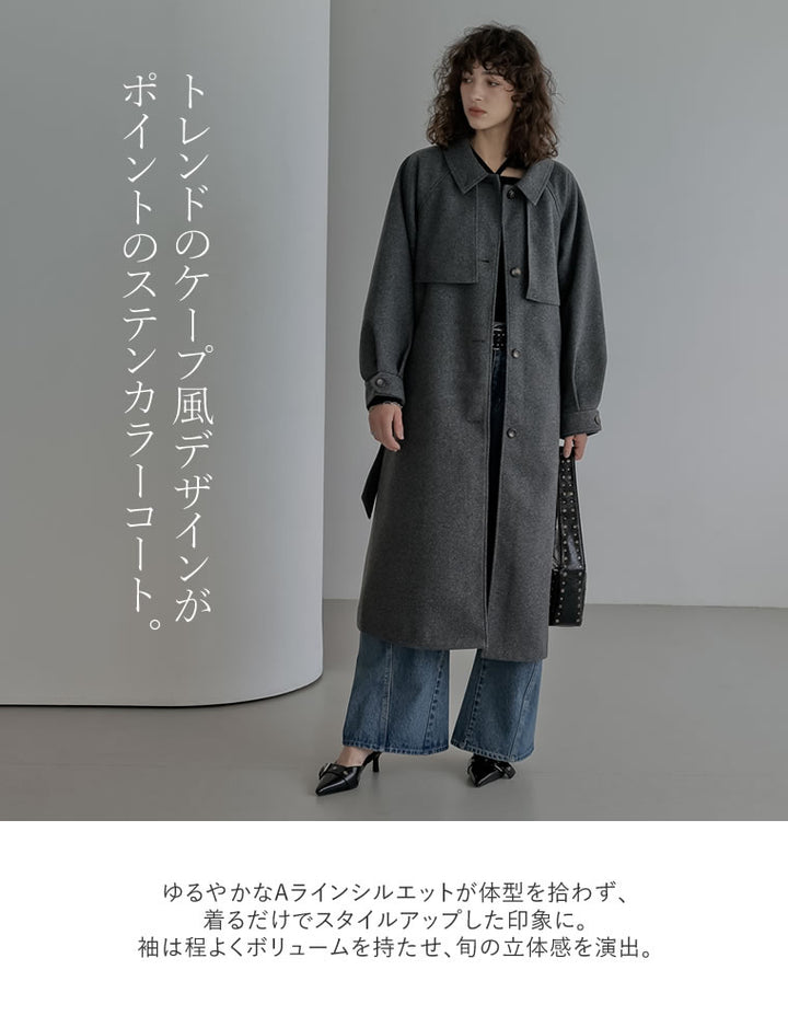 トレンドのケープ風デザインがポイントのステンカラーコート。メインのステンカラーとしてはもちろん、ボタンを留めれば旬のスタンドネックとしても着用できる2WAY仕様です。ゆるやかなAラインシルエットが体型を拾わず、着るだけでスタイルアップした印象に。ウールライクな柔らかな質感が、秋冬らしい温もりを感じさせます。袖は程よくボリュームを持たせ、旬の立体感を演出。中厚手のニットやスウェットの上からもごわつかず、快適に着用いただけます。ブラック以外のカラーは杢調のミックスカラーで、こなれたムードをプラス。フロントボタンの開け閉めやベルトの締め具合で、表情の違いを楽しめる今注目のロングコートです。